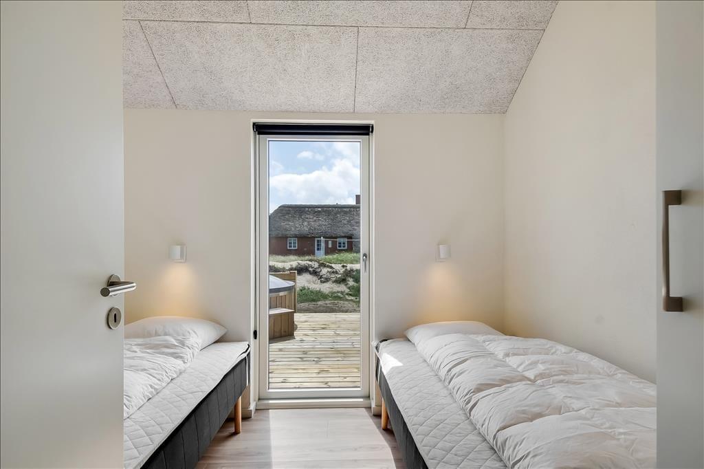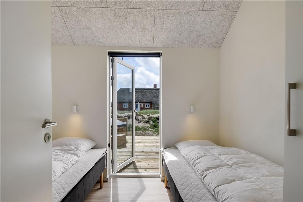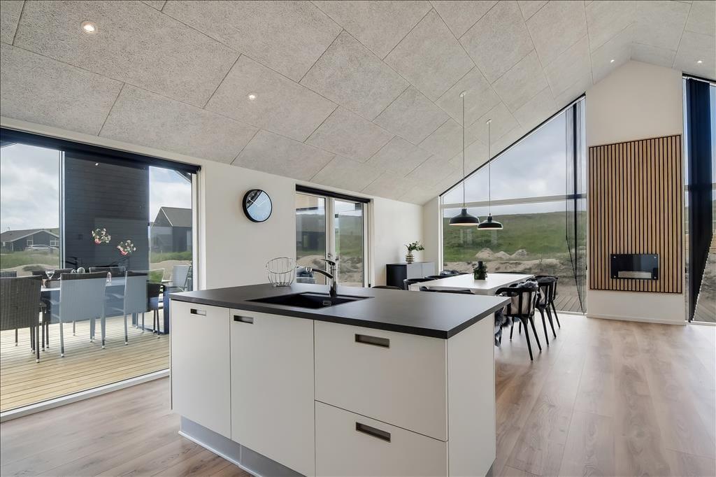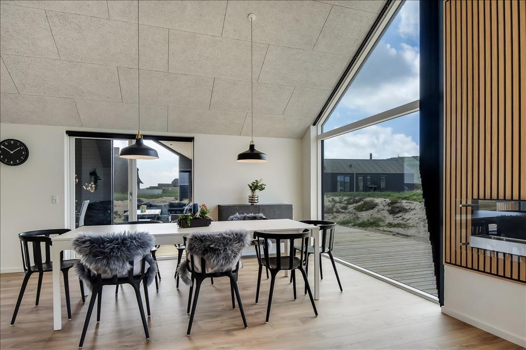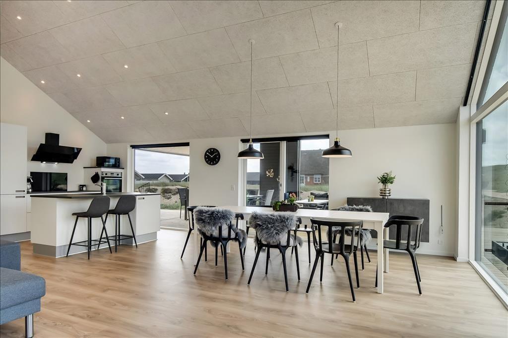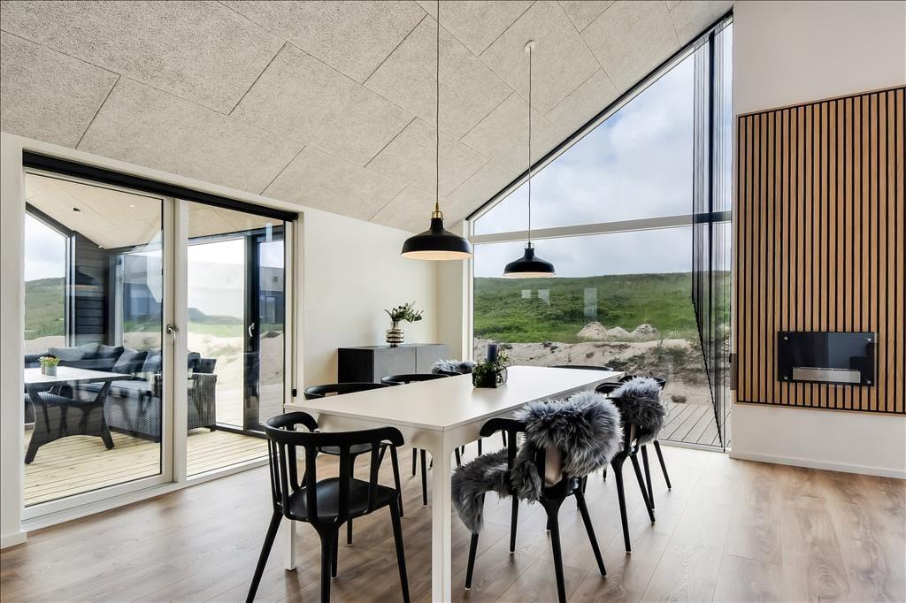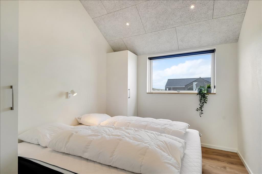 Sommerhuset emmer af lys og rummelighed, og indretningen er moderne og behagelig med højt til loftet og store vinduespartier, der inviterer naturen indenfor. Køkkenet ligger i åben forbindelse med spiseplads og stue, så det føles naturligt at samles til hyggelige stunder, uanset om I laver mad, spiller kort eller bare nyder en rolig stund foran tv’et. Badeværelset er indrettet som en lille wellness-oase med spa og sauna, og herfra er der direkte udgang til terrassen – hvilket gør det nemt at bevæge sig fra varme til frisk luft. Når det er tid til leg og konkurrence, venter aktivitetsrummet med både poolbord og bordtennis – her kan alle i selskabet være med, uanset alder og niveau.