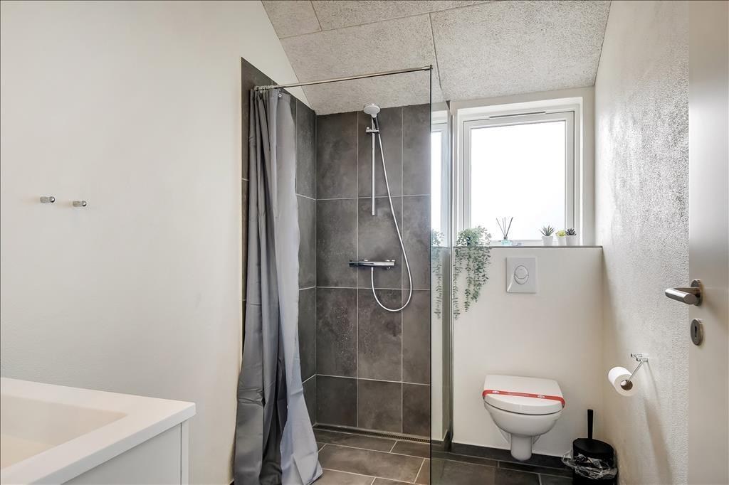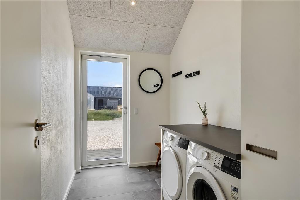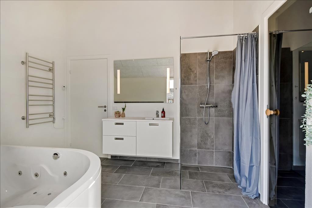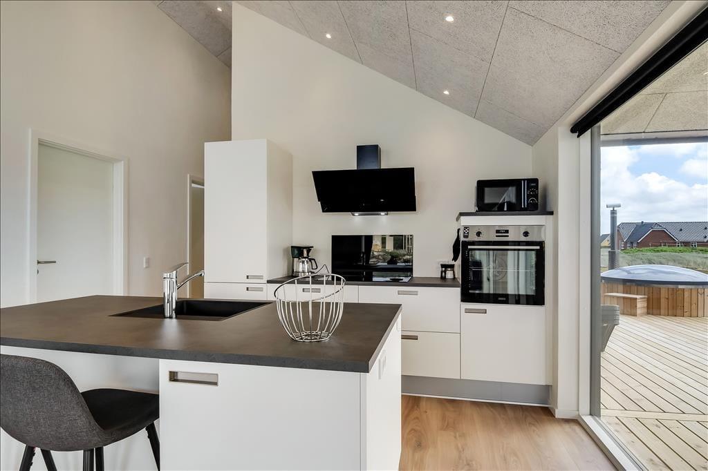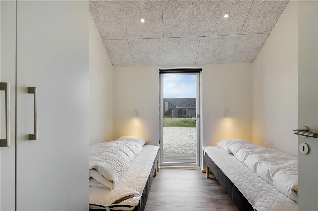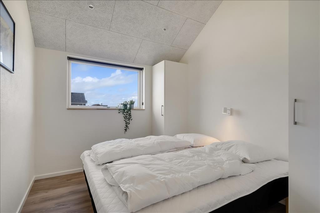 Sommerhuset emmer af lys og rummelighed, og indretningen er moderne og behagelig med højt til loftet og store vinduespartier, der inviterer naturen indenfor. Køkkenet ligger i åben forbindelse med spiseplads og stue, så det føles naturligt at samles til hyggelige stunder, uanset om I laver mad, spiller kort eller bare nyder en rolig stund foran tv’et. Badeværelset er indrettet som en lille wellness-oase med spa og sauna, og herfra er der direkte udgang til terrassen – hvilket gør det nemt at bevæge sig fra varme til frisk luft. Når det er tid til leg og konkurrence, venter aktivitetsrummet med både poolbord og bordtennis – her kan alle i selskabet være med, uanset alder og niveau.