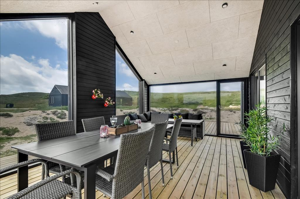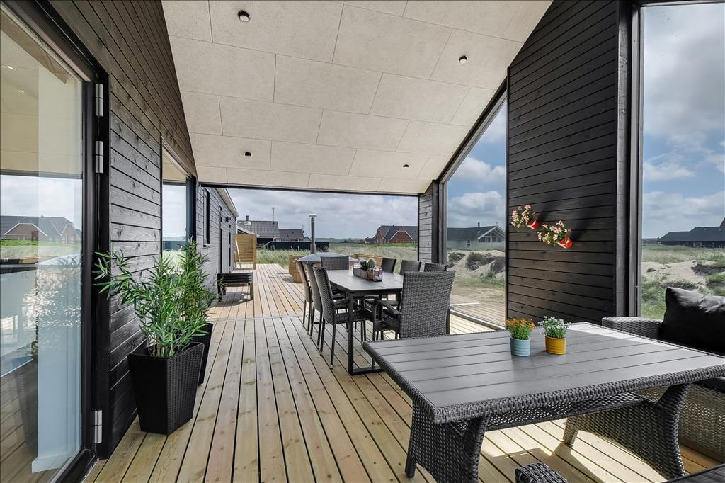 Den store træterrasse fungerer som en naturlig forlængelse af opholdsrummene – og her kan du virkelig nyde udelivet i fredelige omgivelser. En del af terrassen er overdækket, så du kan sidde i skygge eller læ, og her er rigeligt med plads til både loungemøbler og grill. På terrassen står det lækre vildmarksbad, som inviterer til lange, varme bade under åben himmel. Her er det let at lade sig synke ned i det boblende vand og lade stilheden falde på – uanset om du gør det i morgensolen med en kop kaffe eller under stjernerne efter en lang dag. Haven omkring huset giver plads til leg for børn og hunde, mens fuglesang og den salte luft fra havet fuldender stemningen. Her er det nemt at mærke, hvordan ferieroen indfinder sig.