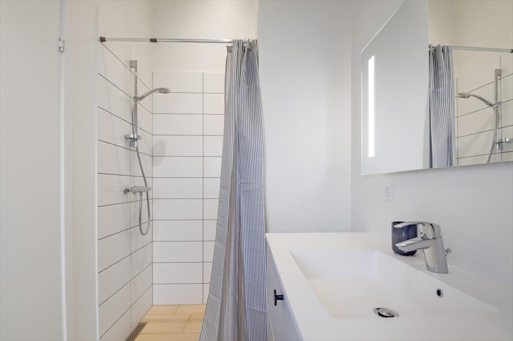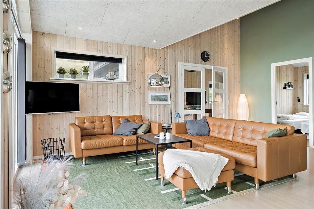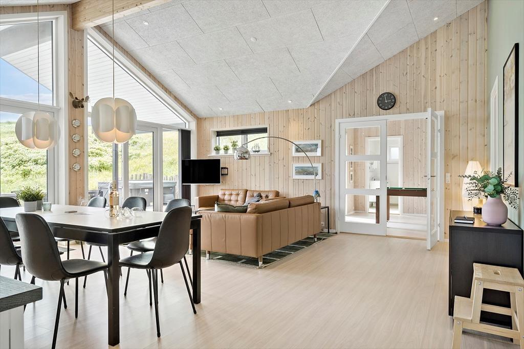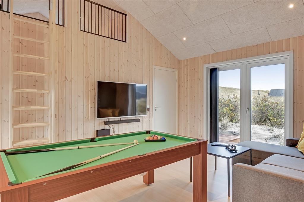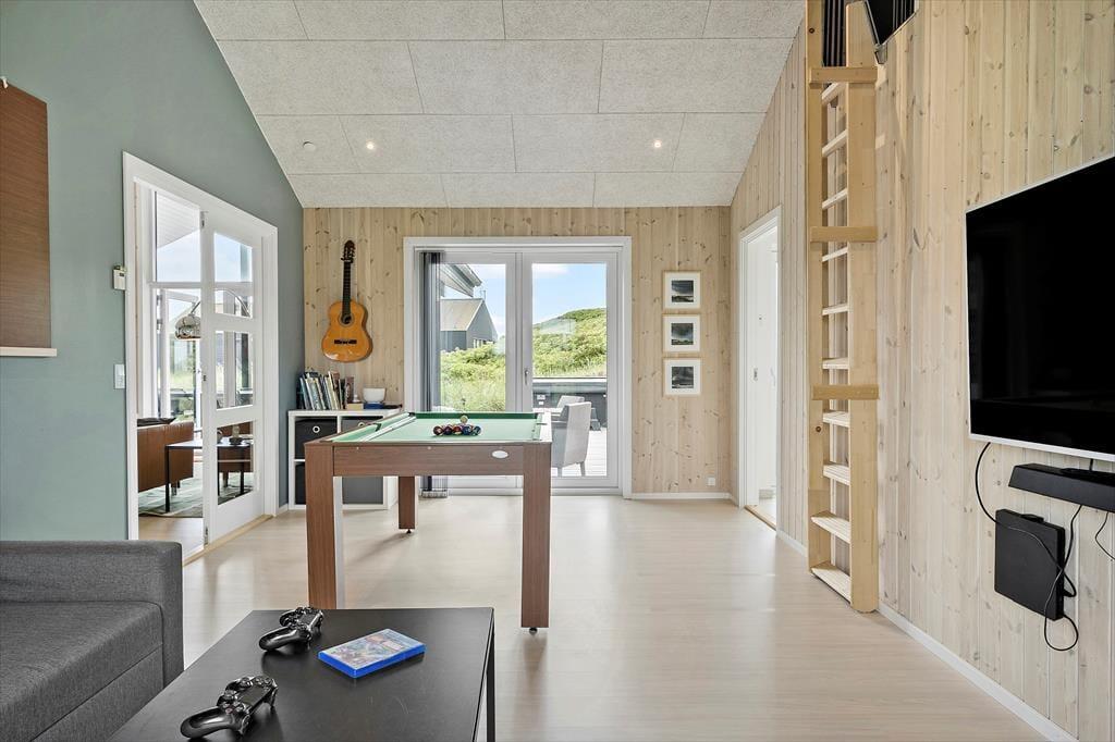 Indendørs mødes du af lyse materialer og en åben planløsning med et veludstyret køkken og hyggelig stue. Et stort aktivitetsrum med poolbord og PlayStation sørger for underholdning, mens saunaen og udendørs spaen inviterer til afslapning. Den store træterrasse byder på privatliv og komfort, hvor du kan nyde solen, fuglefløjt og den smukke natur.