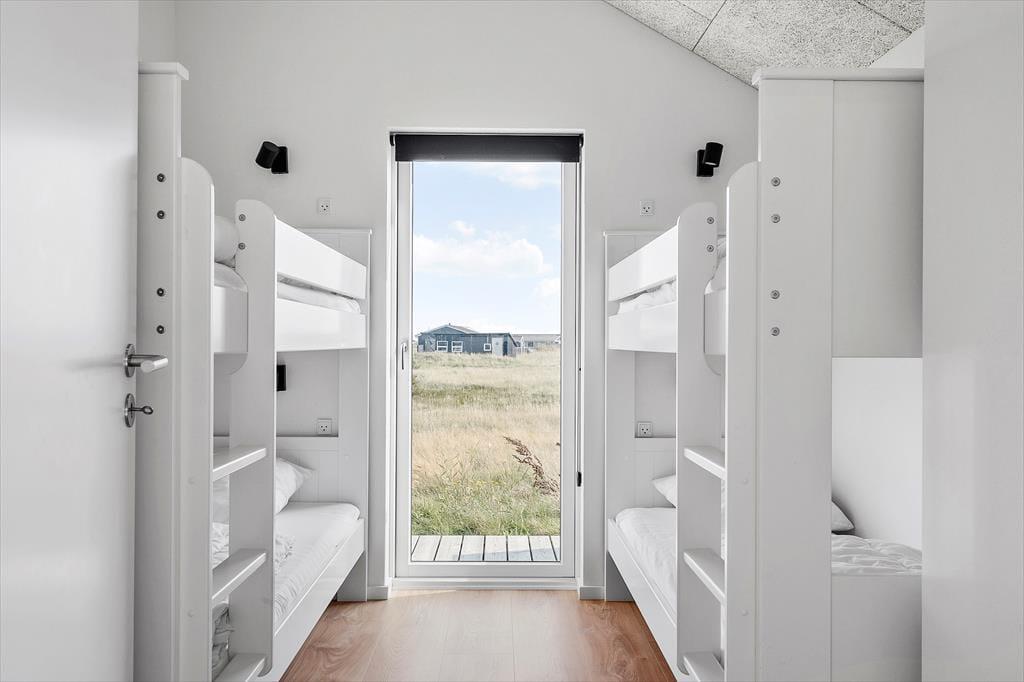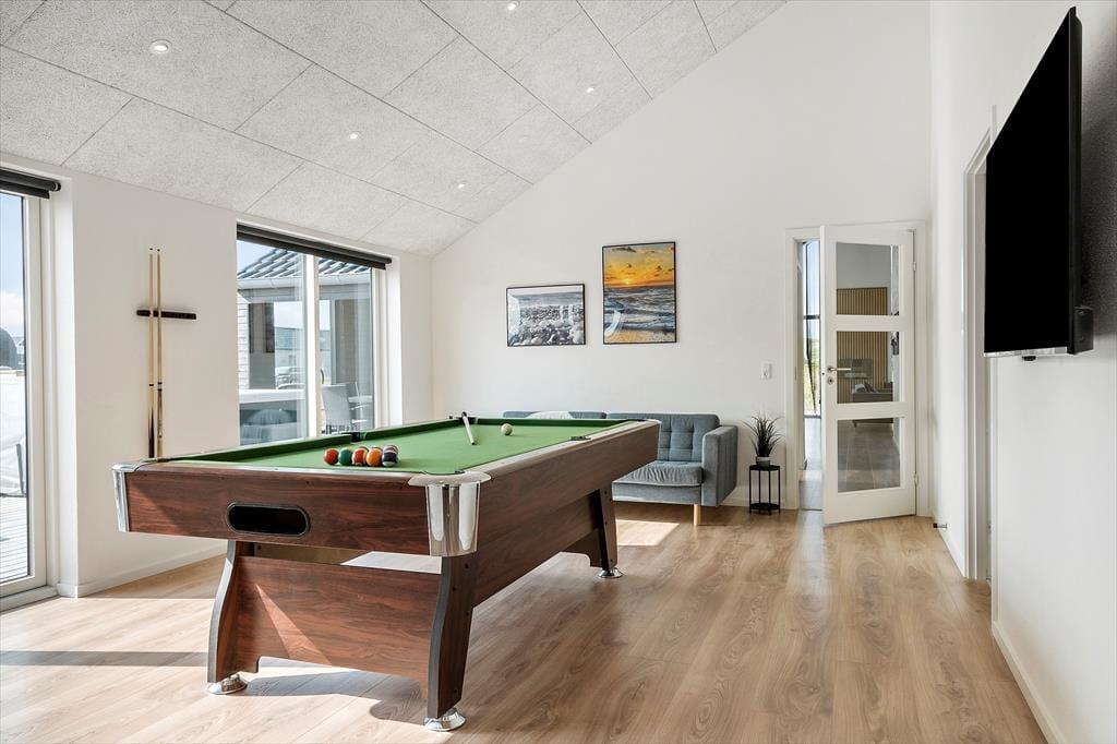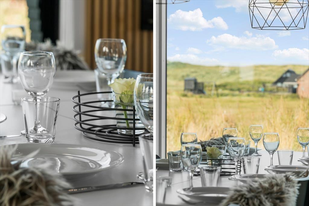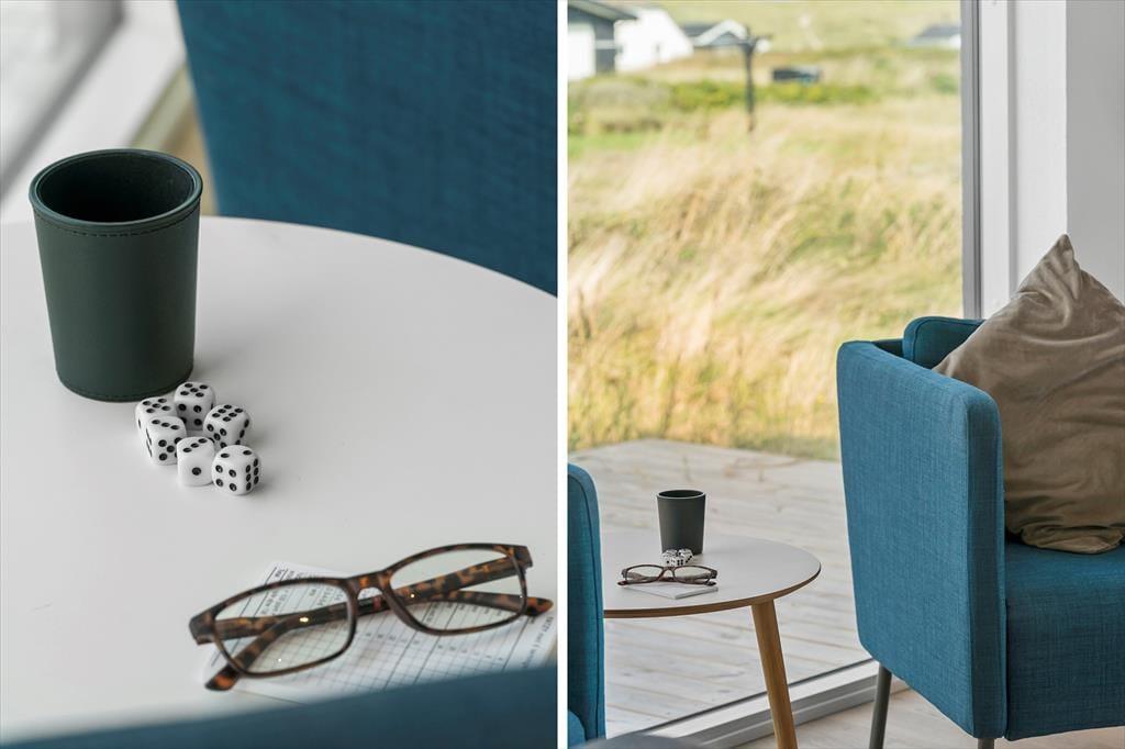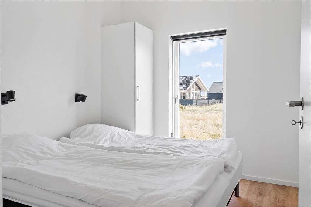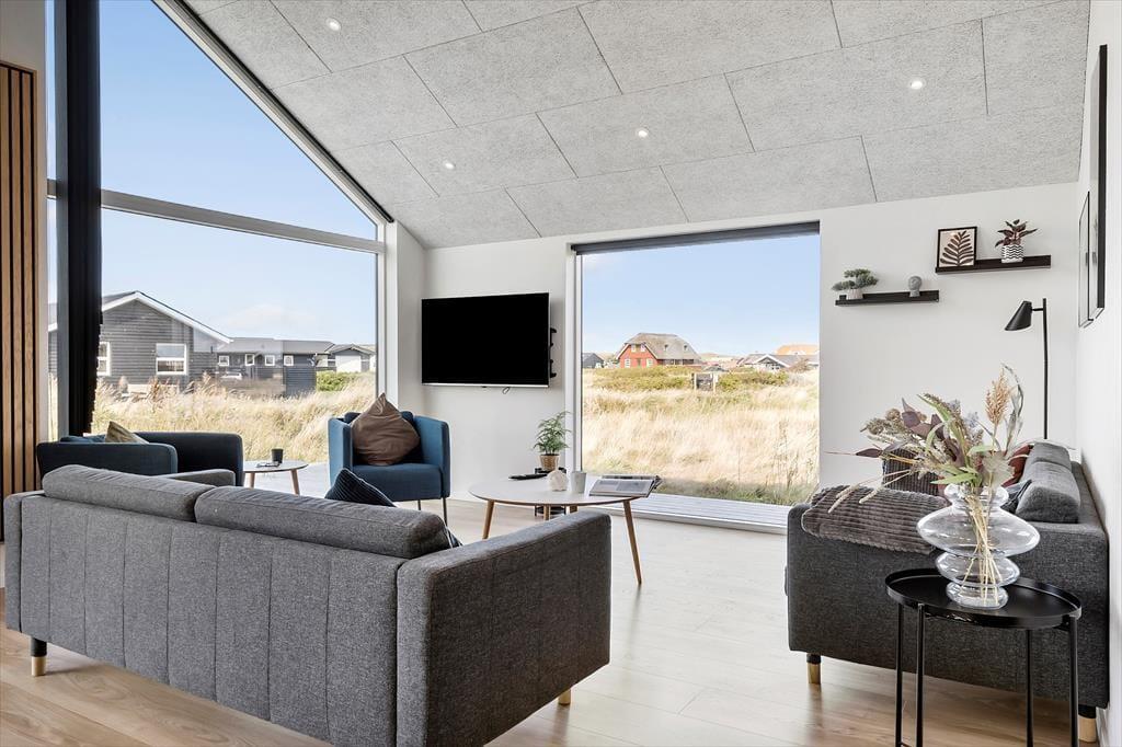 Når du træder indenfor i sommerhuset på Alkajavej 11, møder du et lyst og moderne interiør, hvor der samtidig er kræset for hyggen. Store vinduespartier lader lyset strømme ind og skaber en åben og luftig stemning, og de rolige, lyse farver understøtter følelsen af ro og afslapning. Huset er perfekt til en ferie med både familie og venner – der er god plads til samvær i opholdsrummet, som samler stue og køkken i ét, så det bliver naturligt at være sammen, uanset om nogen laver mad, spiller spil eller hygger med kaffe i sofaen. Efter en lang dag med strandture og aktiviteter kan I forkæle jer selv med en tur i det varme spabad – eller hoppe i husets sauna og mærke varmen brede sig i kroppen. De mange detaljer i indretningen – både praktiske og luksuriøse – gør det let at falde til og føle sig hjemme, allerede fra første øjeblik.