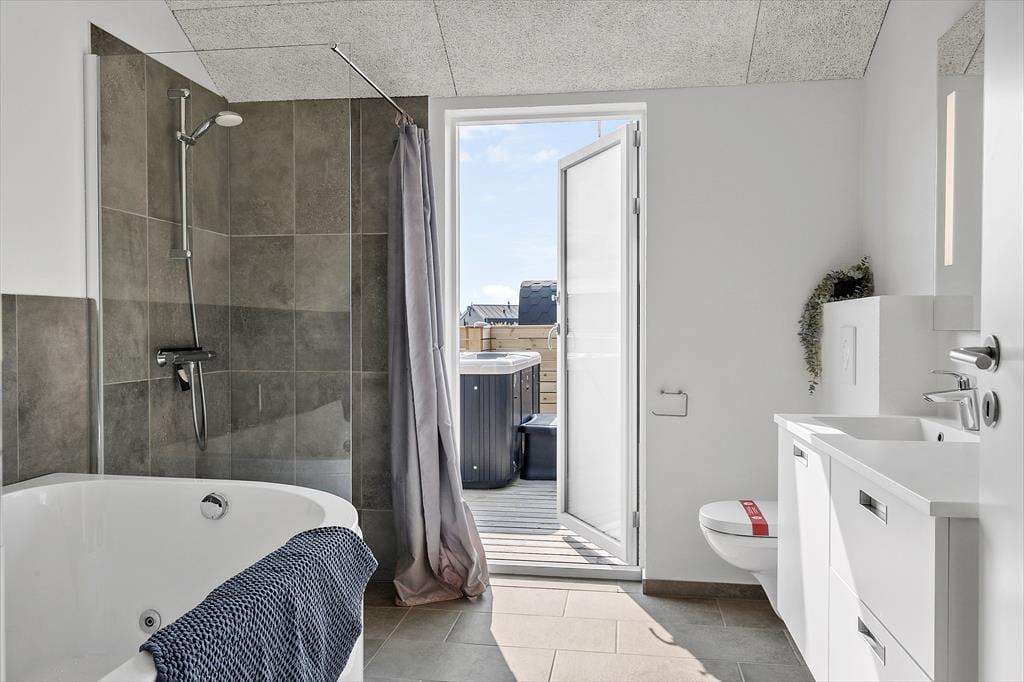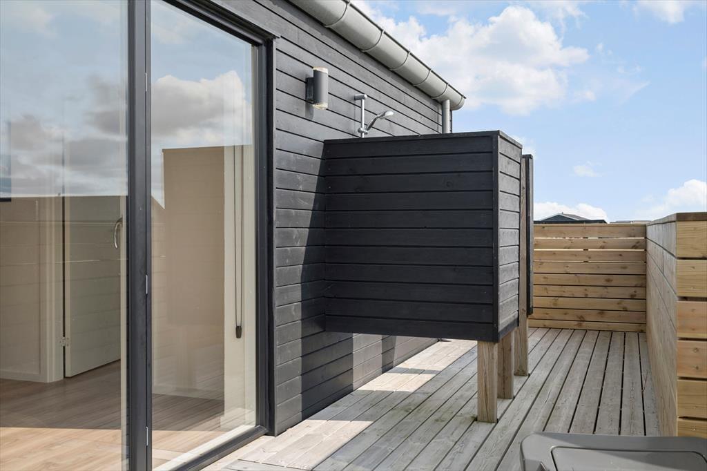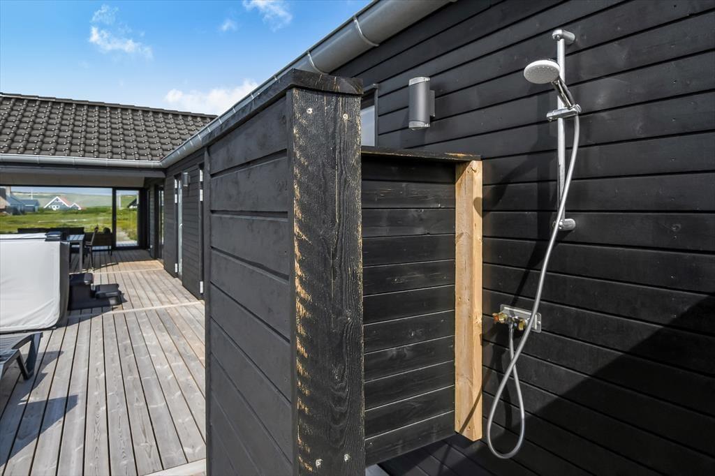 Lige så indbydende som huset er indvendigt, lige så meget får du lyst til at være udenfor. Den store terrasse, som delvist er overdækket, giver mulighed for at nyde både solrige eftermiddage og lange sommeraftener under åben himmel – eller under tag, hvis det danske vejr driller lidt. Spaen udenfor gør det muligt at sidde under stjernerne med damp omkring skuldrene, mens den udendørs sauna og bruser inviterer til ægte wellness-stemning i det fri. En frisk dukkert efterfulgt af en tur i saunaen – det er ferie på højt niveau. Her er plads til, at både børn, voksne og hunde kan nyde udelivet, hvad enten det er med boldspil på græsset, en god bog i liggestolen eller fælles måltider omkring havebordet. Den fredelige stemning i området omkring Alkajavej giver ekstra plus på afslapningskontoen – og i den lune aftensol føles verden pludselig langt væk.