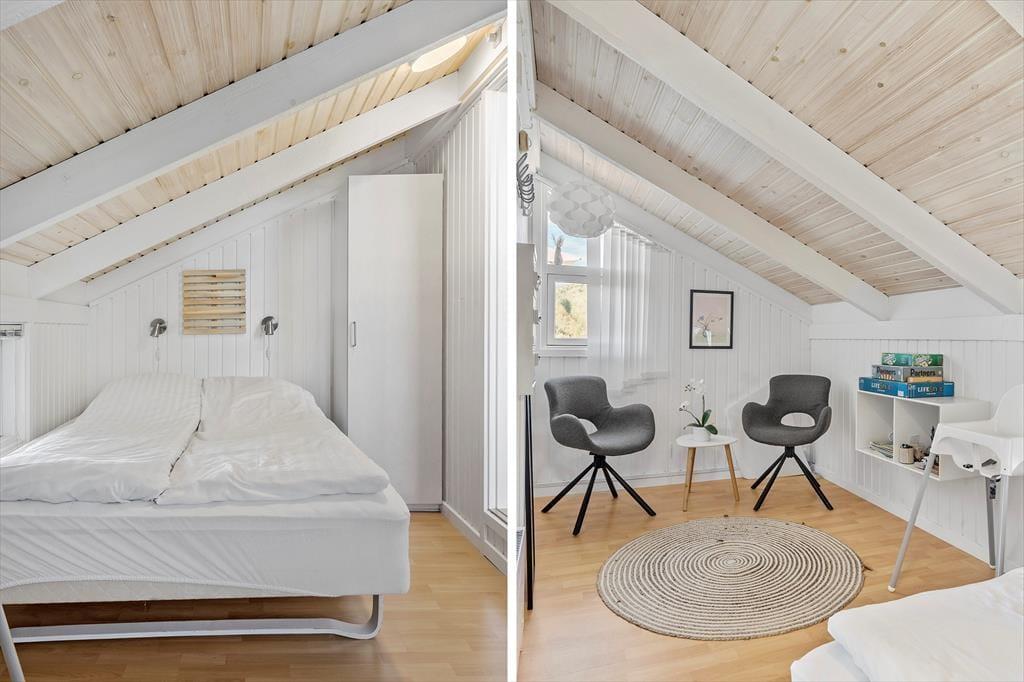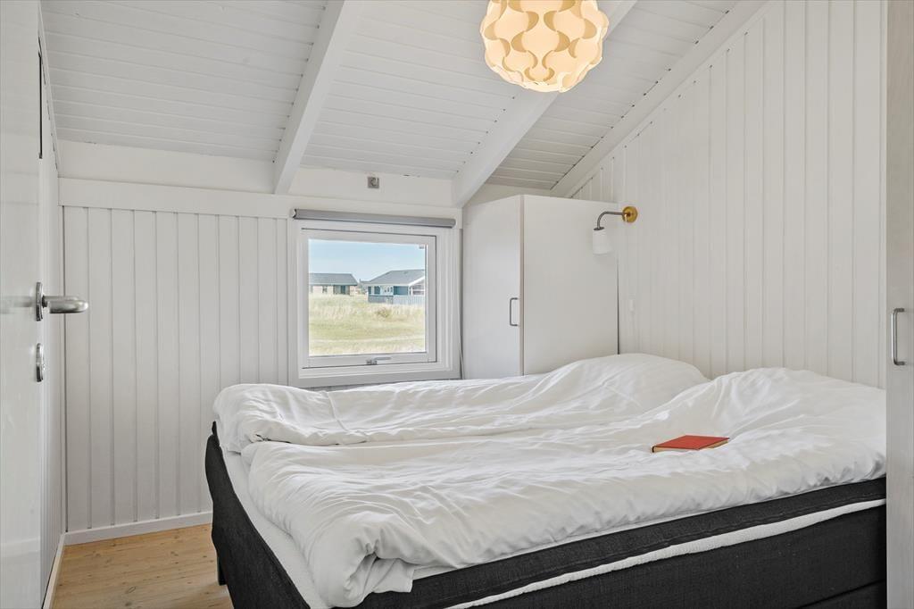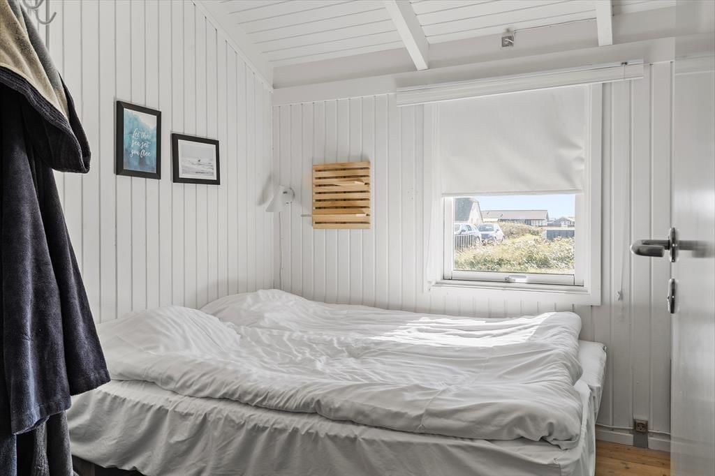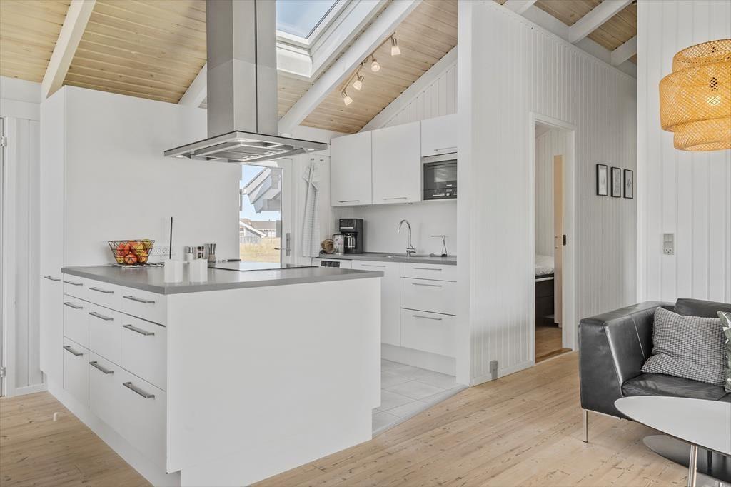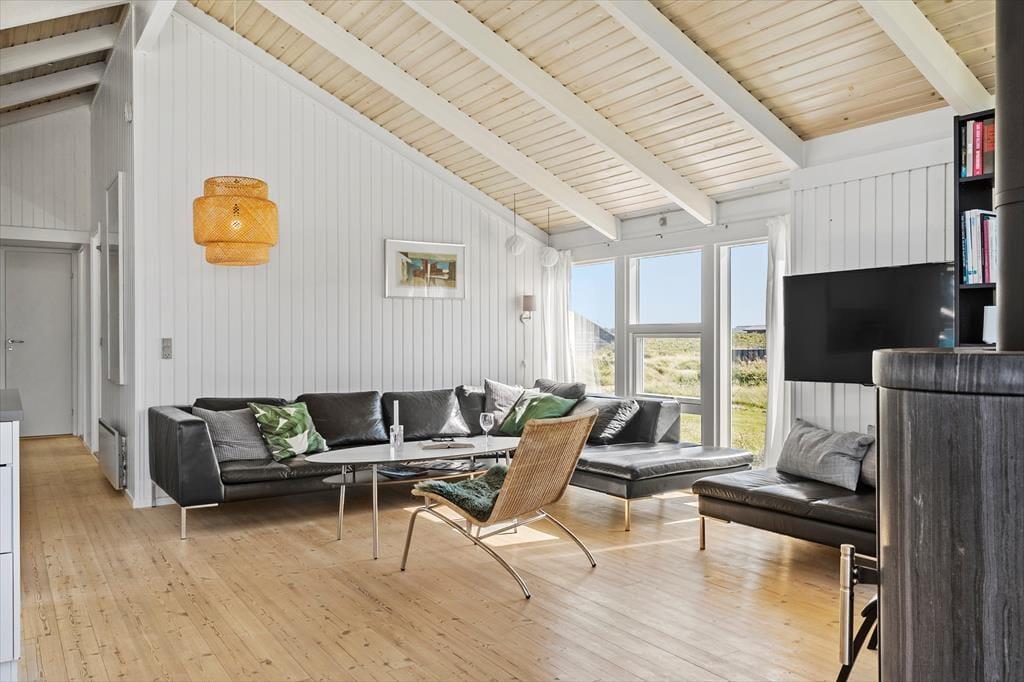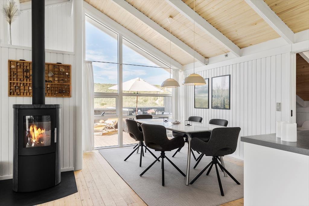 Når du træder ind i sommerhuset, bliver du mødt af en lys og hyggelig atmosfære, der inviterer til samvær og afslapning. Stuen og køkkenet ligger i åben forbindelse, hvilket skaber et skønt samlingspunkt for familien. Fra stuen har du direkte udgang til terrassen, hvor du kan nyde morgenkaffen med udsigt til klitterne. Når dagen går på hæld, er det oplagt at tænde op i brændeovnen, læne sig tilbage i sofaen og lade feriestemningen brede sig, mens flammerne knitrer og spreder varme. Husets 4 soveværelser giver gode muligheder for både store og små til at trække sig tilbage og hvile sig efter en dag fyldt med oplevelser ved Vesterhavet.