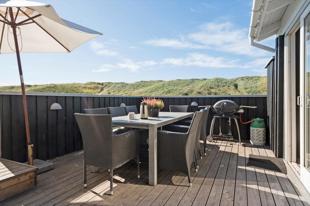 Sommerhusets beliggenhed i første klitrække giver dig nem adgang til strandlivet, og du kan hurtigt tage turen over klitterne for at nyde en forfriskende dukkert i Vesterhavet eller en gåtur langs vandkanten. Den lille private strandplet er en særlig perle, hvor du kan lægge håndklædet og nyde roen. På terrassen er der god plads til at nyde lange måltider under åben himmel, og hvis du har en god bog med, er det oplagt at finde et roligt hjørne og lade tankerne flyde frit, mens du lytter til naturens lyde omkring dig. På terrassen er der også et hyggeligt hjørne med udebruser og udespa, hvor du kan nyde den fantastisk udsigt til klitterne.