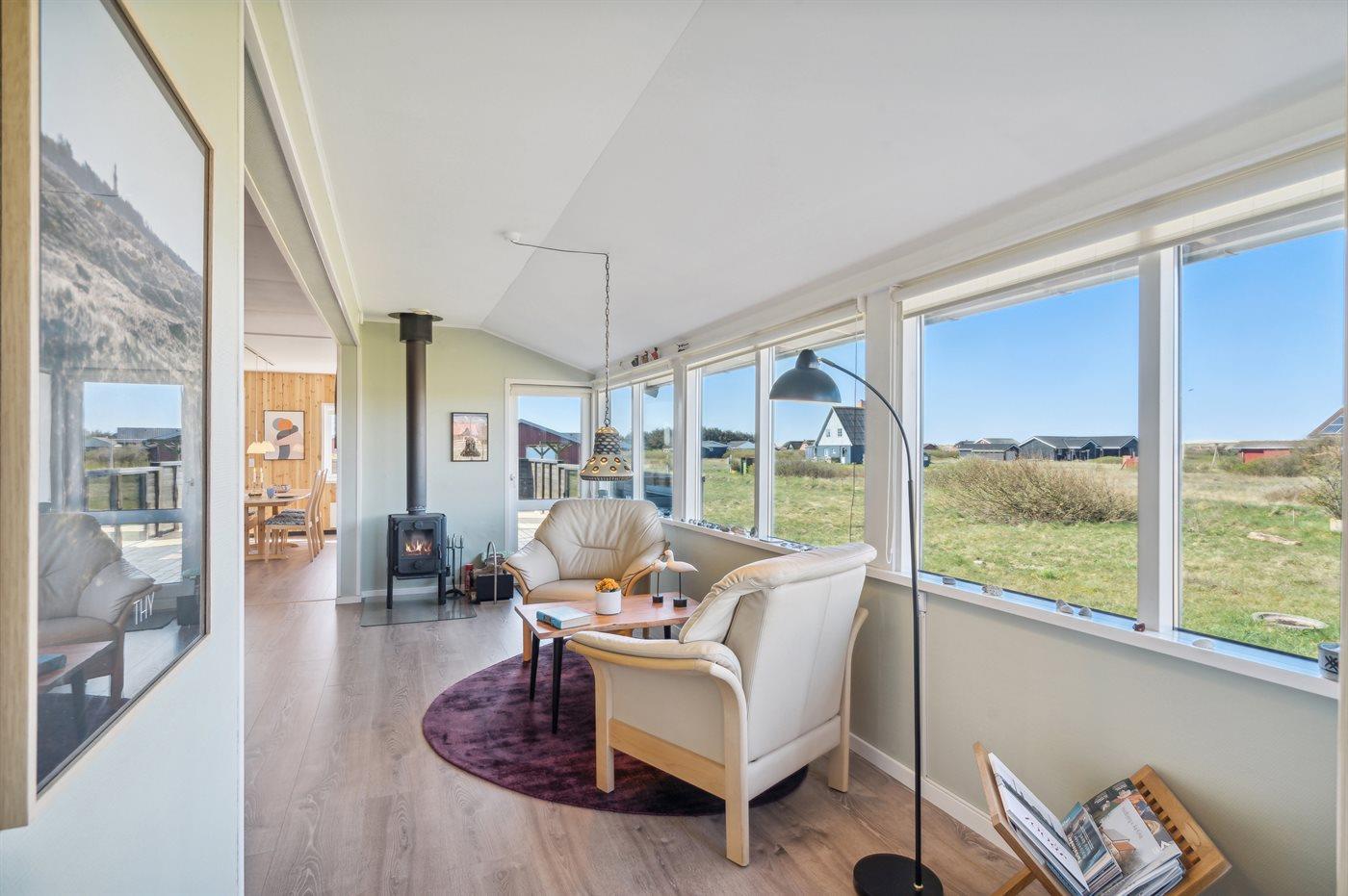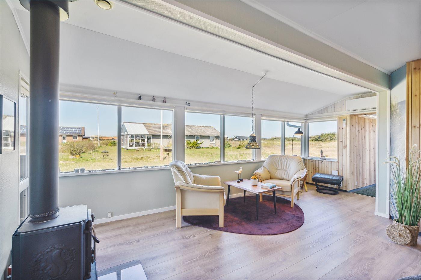 I dette dejlige sommerhus er man tæt på Vesterhavet og lyden af bølgernes brusen. Huset er stilfuldt indrettet, lyst og venligt med inspiration af områdets skønne natur, som indbyder til lange gåture.