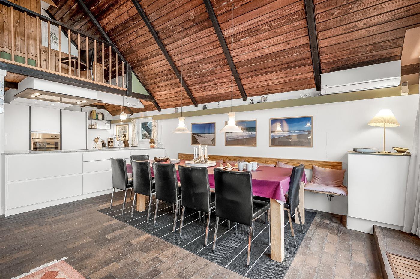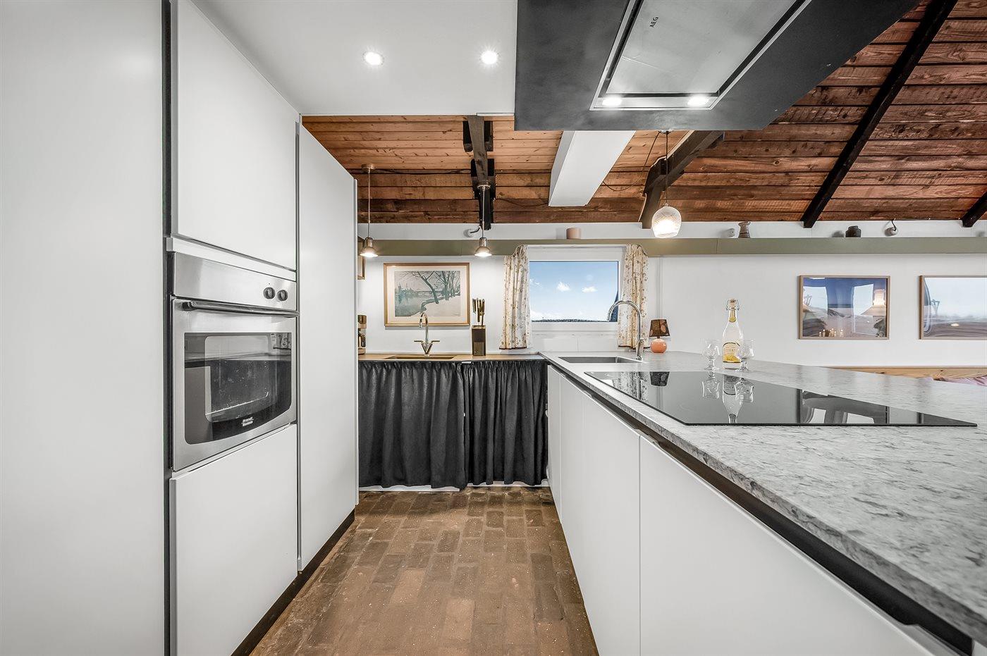 Køkkenet er udstyret med 1 køleskab. Der er 4 keramiske kogeplader, varmluftovn, mikrobølgeovn samt opvaskemaskine.