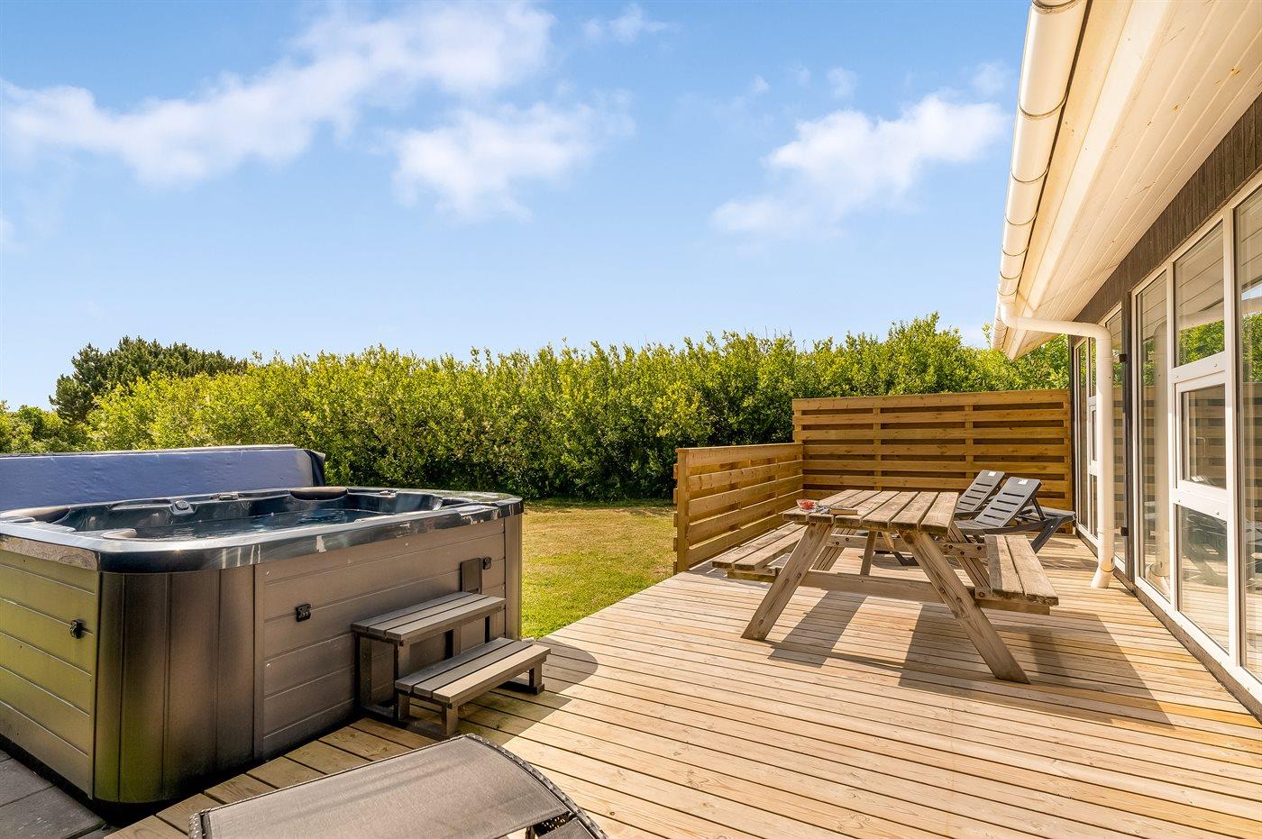 Huset ligger på en afskærmet grund omgivet af skov og natur. Den store terrasse har et udendørs standvandspa og havemøbler, og for de mindste er der både sandkasse og gynger.
