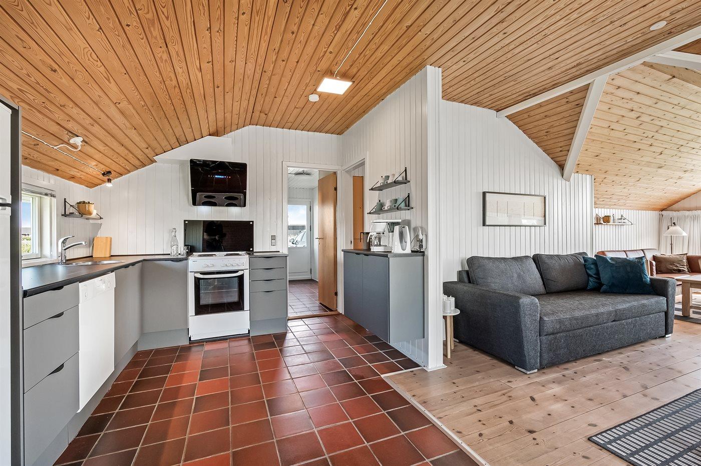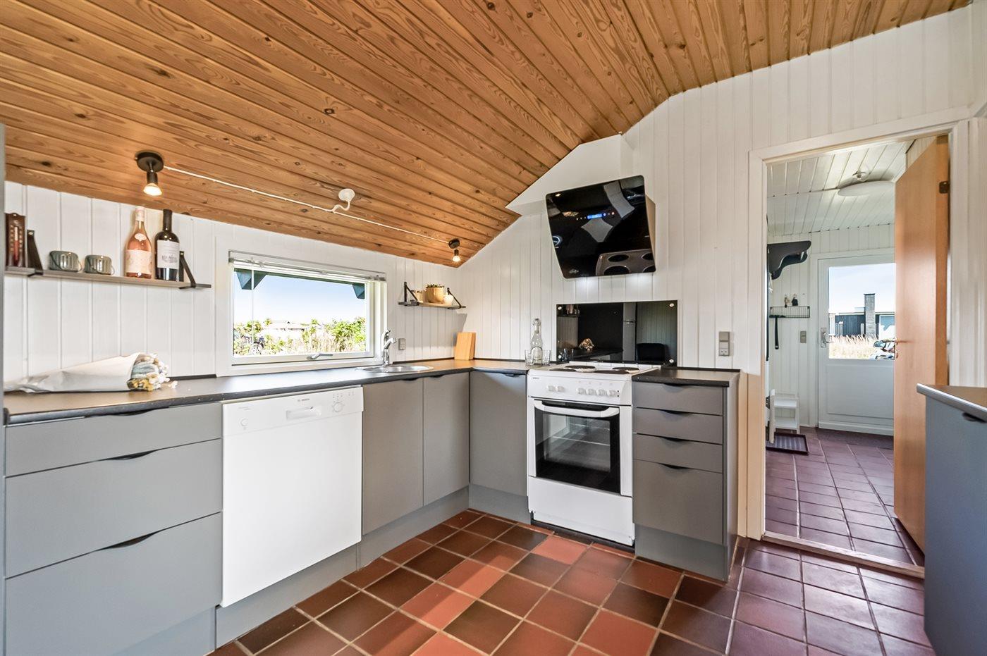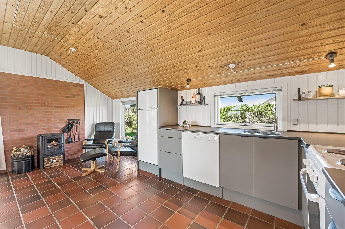 Køkkenet er udstyret med 1 køleskab. Der er 4 elkogeplader, varmluftovn, mikrobølgeovn samt opvaskemaskine.