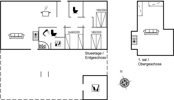 Der er i alt 3 soveværelser. Sovepladserne fordeler sig på: 4 sovepladser i dobbeltsenge. 2 sovepladser i enkeltsenge. 2 sovepladser i sovesofa (enkelt). 2 af disse sovepladser befinder sig på husets hems. Derudover er der 1 stk. barneseng.