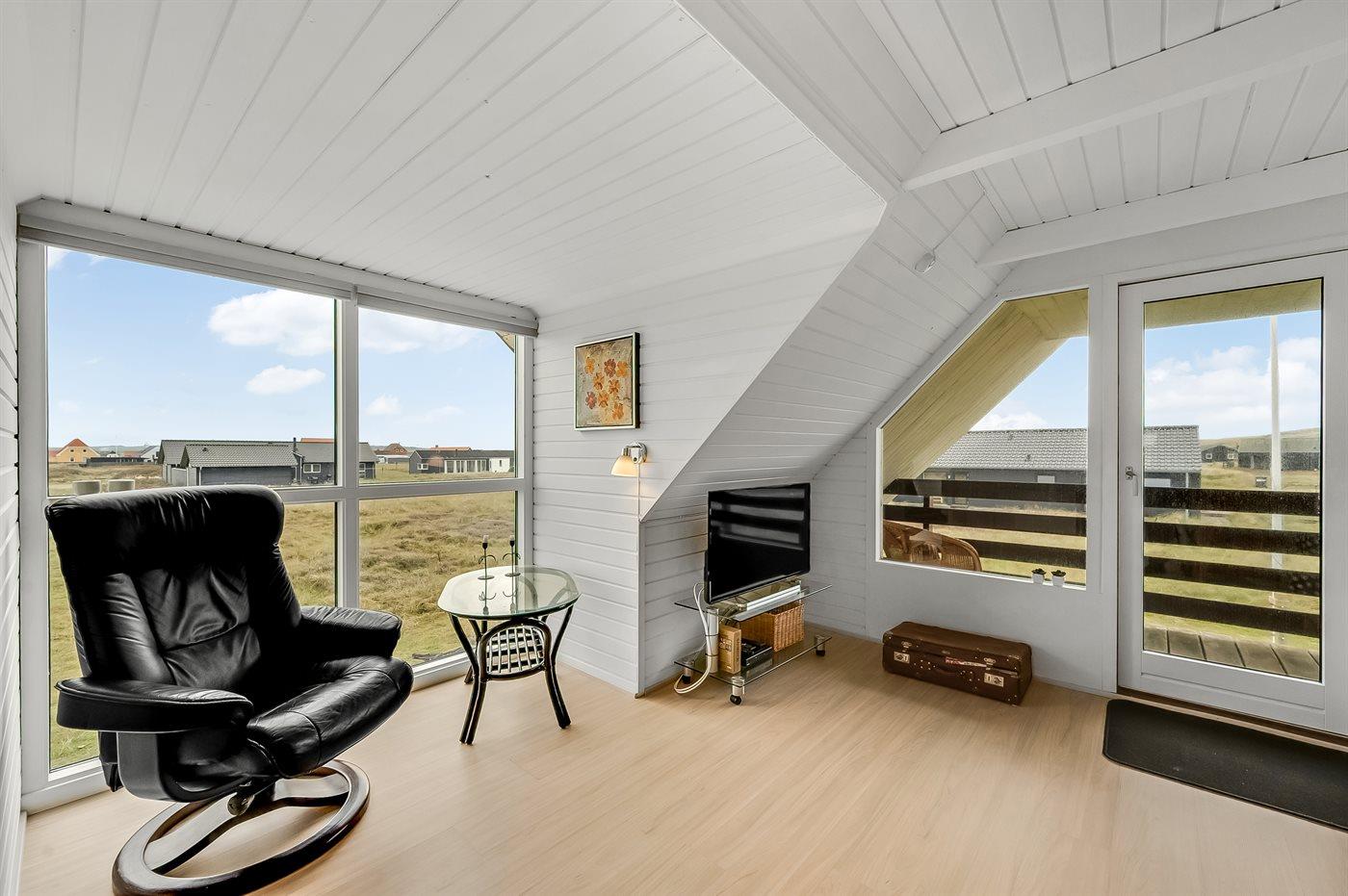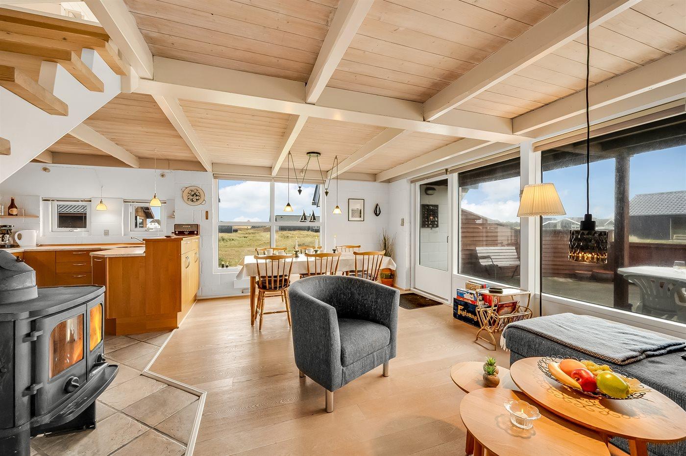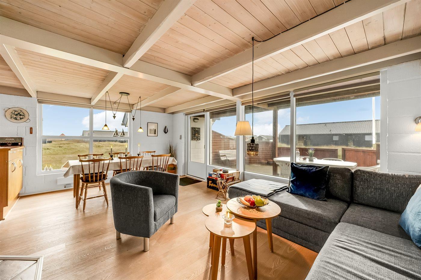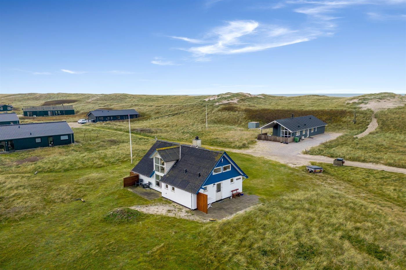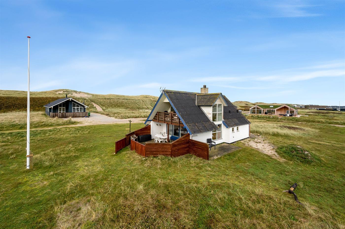 Lige ved Vesterhavet ligger dette dejlige sommerhus på en meget stor grund. Fra såvel altanen som fra opholdsstuen på 1. sal kan man nyde solnedgangen over klitterne.