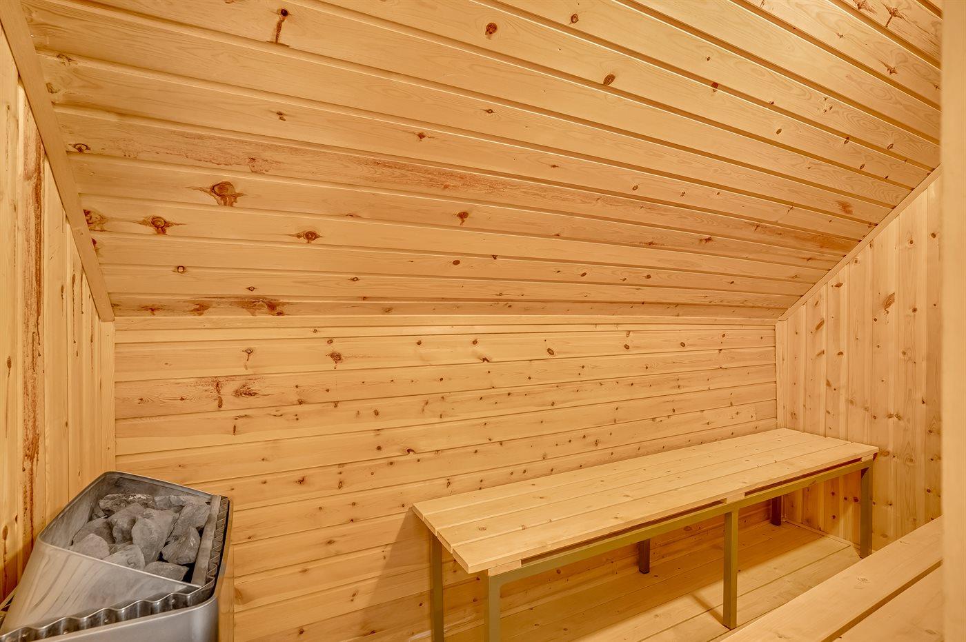 Lille sauna med plads til 2 personer, bruseniche, dobbelt håndvask, vaskemaskine og pusleplads