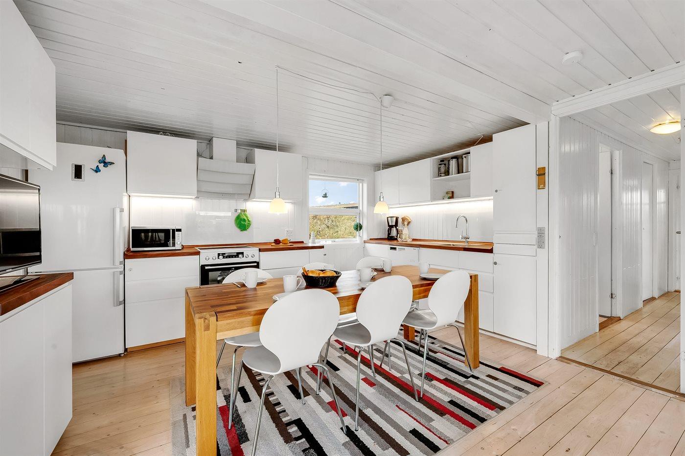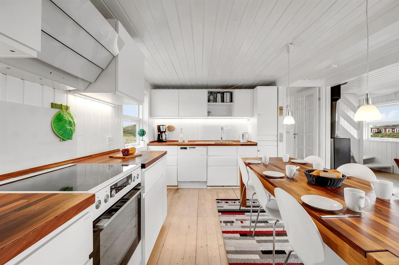 Køkkenet er udstyret med 1 køleskab. Der er 4 keramiske kogeplader, varmluftovn, mikrobølgeovn samt opvaskemaskine.