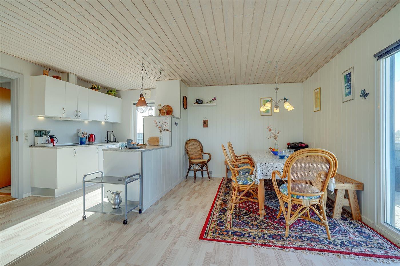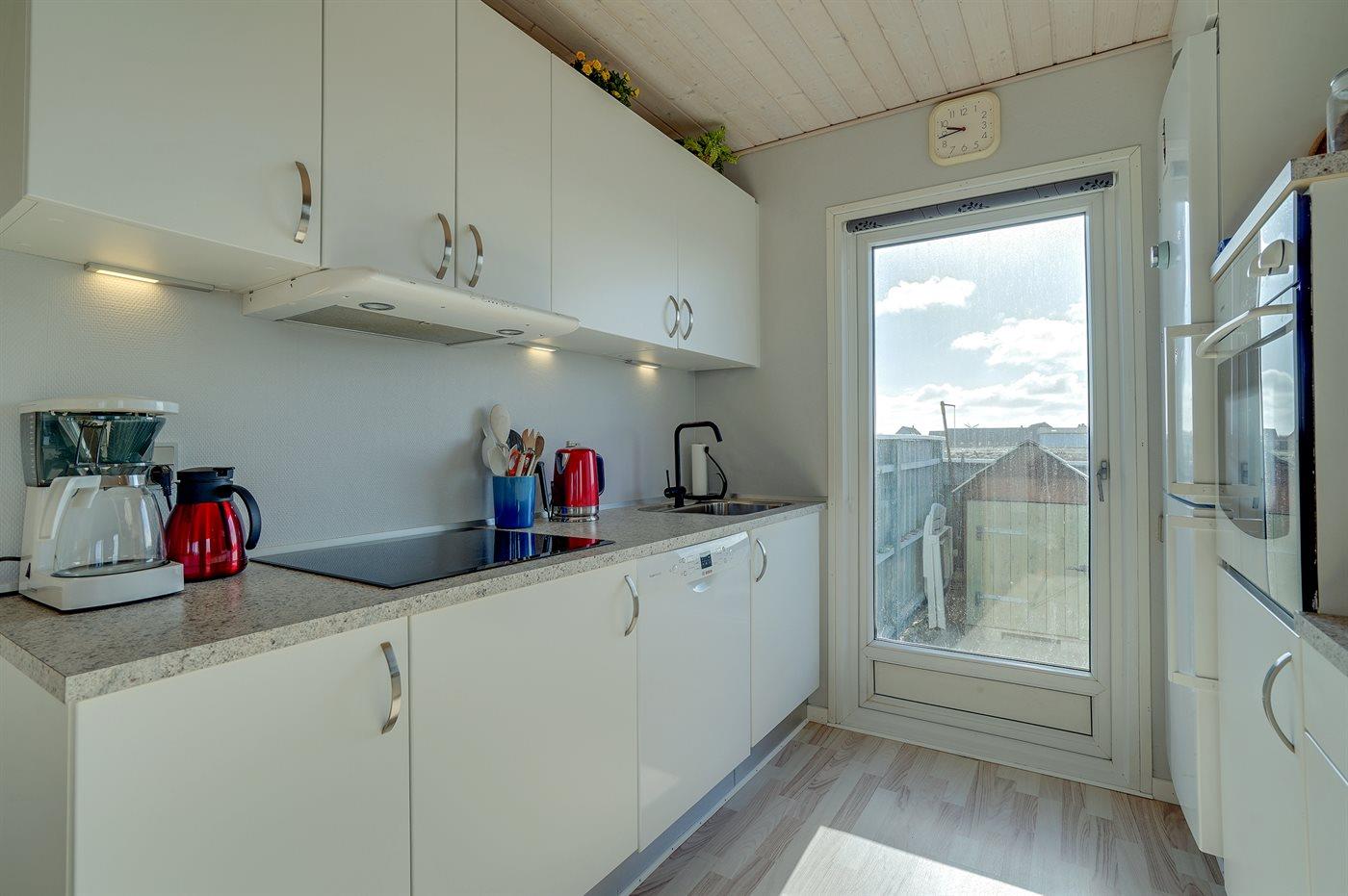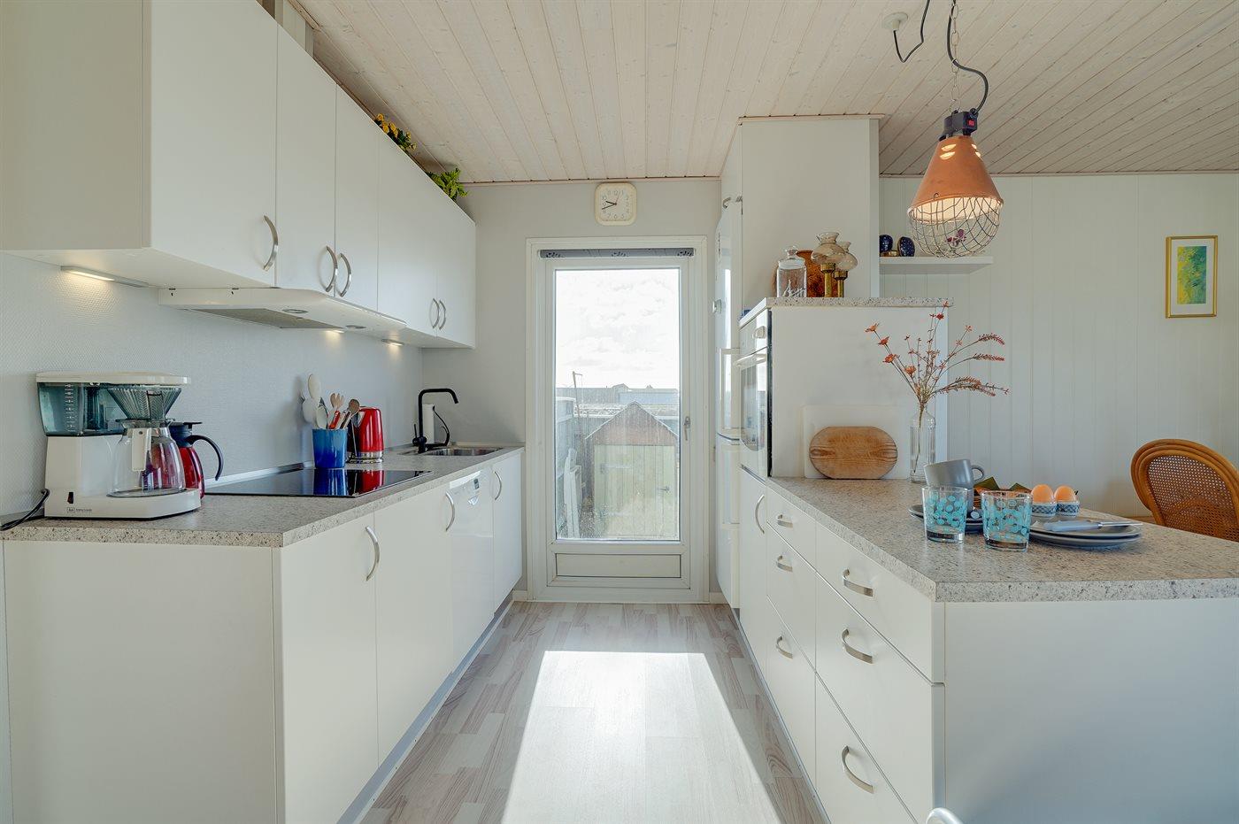 Køkkenet er udstyret med 1 køleskab. Der er 4 keramiske kogeplader, varmluftovn, mikrobølgeovn samt opvaskemaskine.