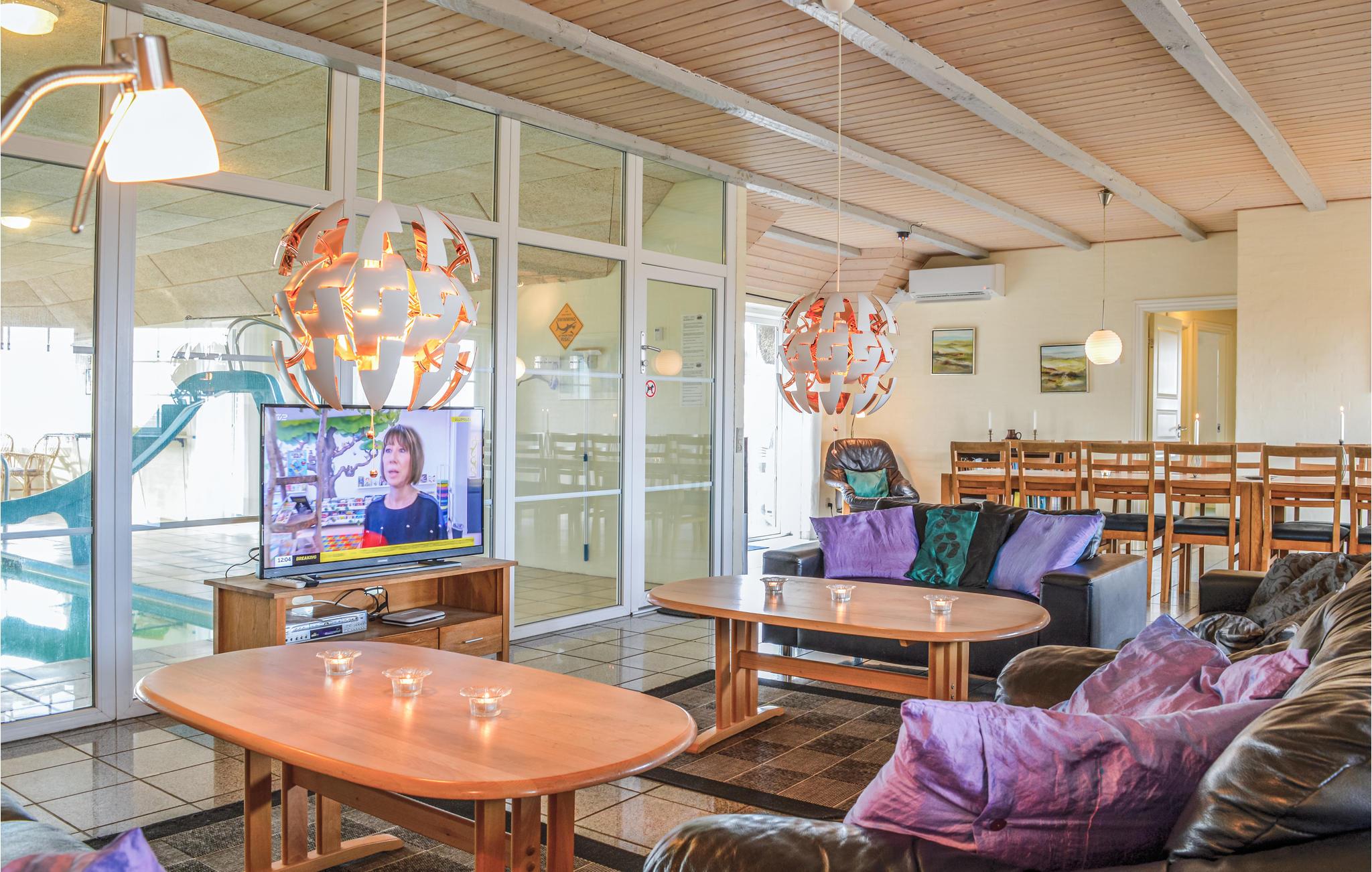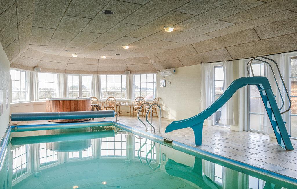 Stort sommerhus med pool der ligger i det attraktive og naturskønne Vejlby klit. Huset er rummeligt med plads til 18 gæster og med et stort køkken i åben forbindelse med stuen som naturligt opdeler huset i to, da de 7 soverum er fordelt i to fløje. Derudover er der 3 badeværelser samt en dejlig pool afdeling med både en 6 personers spa, sauna og vandrutsjebane. Udenfor kan I hygge på terrassen hvorfra I har udsigt til klitterne. Vejlby Klit området er kendt for sin unikke og varierende natur, som spænder lige fra havet mod vest, de store flade vådområder med fugletræk mod nord og øst, samt Ferring Sø mod syd, til halvstore klippeformationer ved Bovbjerg fyret, hvor den smukke udsigt er betagende, uanset årstid. Den lange trappe ned til havet er en god anledning til en lille konkurrence eller hvad med at tage turen op i fyret, hvor I har en fantastisk udsigt over området! I Harboøre, som har eksisteret som fiskerleje siden 1500-tallet, kan I besøge Flyvholm redningsstation som vidner om mange dramatiske redningsaktioner på havet eller måske vandre en tur ved Haarum, som er et naturområde med et rigt fugleliv. I Thyborøn finder I flere forskellige seværdigheder. Der er Jyllands Akvariet, Sea War Jutland museet, Kystcentret, Sneglehuset, Thyborøn fæstningen mm. Melder sulten sig eller vil I have fisk med hjem til grillen, købes alt på havnen. Her har I også mulighed for selv at fiske med stang. Har I lyst til en shoppetur eller spiller I golf, så tag til Lemvig, også kaldet Vestjyllands bjergby, på grund af dens flotte beliggenhed i det kuperede terræn. Den 18 hullers golfbane ligger kun 2 km. fra byens centrum, så I har god tid til begge dele. Hjemme igen er mulighederne mange – en tur i poolen, nyde varmen i saunaen, slappe af med en bog i sofaen eller måske bare finde en solvogn og lade tankerne få frit spil, mens de sidste solstråler forsvinder bag klitterne?