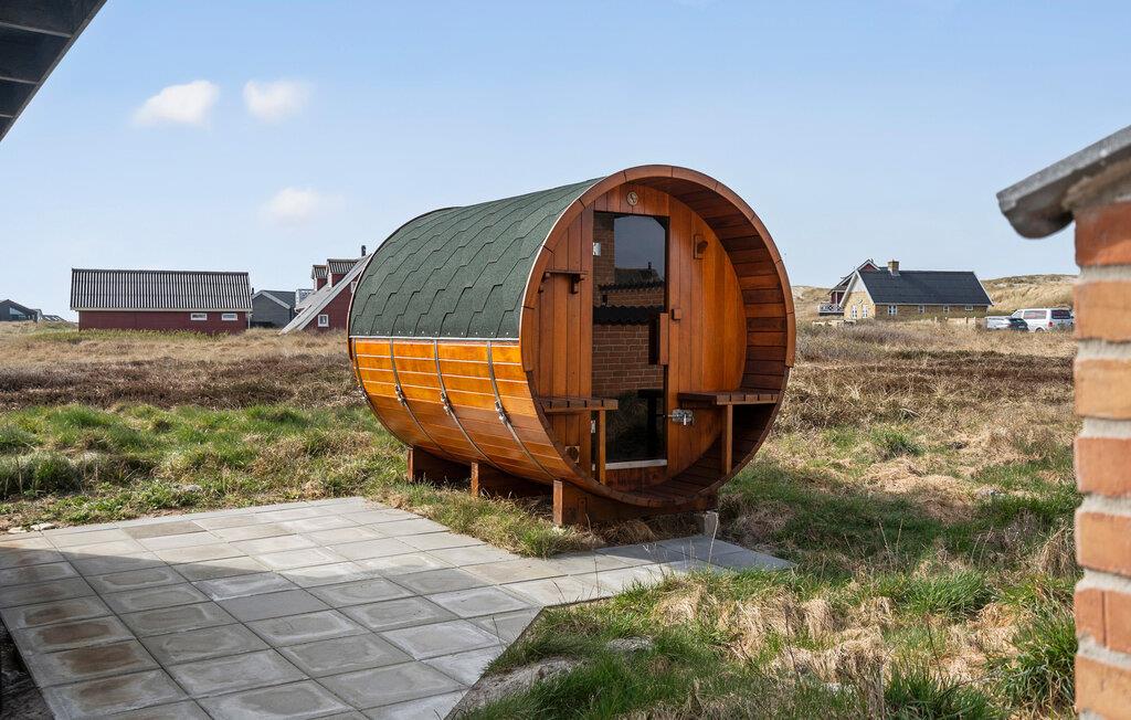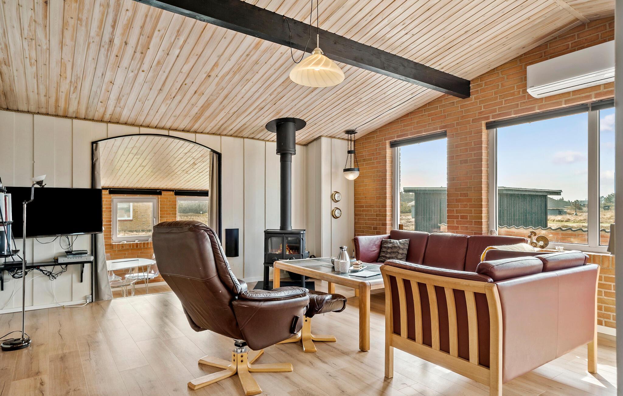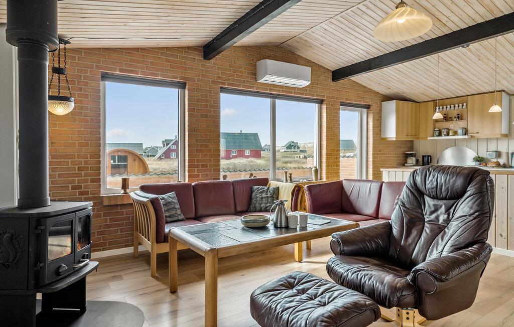 Hvad er bedre end en ferie kun få meter fra en smuk sandstrand ved Vesterhavet? Det er nemlig det, der venter jer i dette veludstyrede hus, hvor de lyse lokaler skaber de ideelle rammer for jeres familieferie. Her kan I starte dagen ud med en fælles morgenmad i det åbne køkken. Dagens andre måltider kan I nyde i spisestuen eller på den solrige terrasse, og om aftenen kan I bare smække benene op i sofaerne og lune jer ved brændeovnen, mens jeres yndlingsfilm glider hen over skærmen. Huset byder på alt, hvad I behøver for at I hurtigt vil føle jer hjemme, og i haven er der god plads til at grille eller lege og spille bold med børnene.