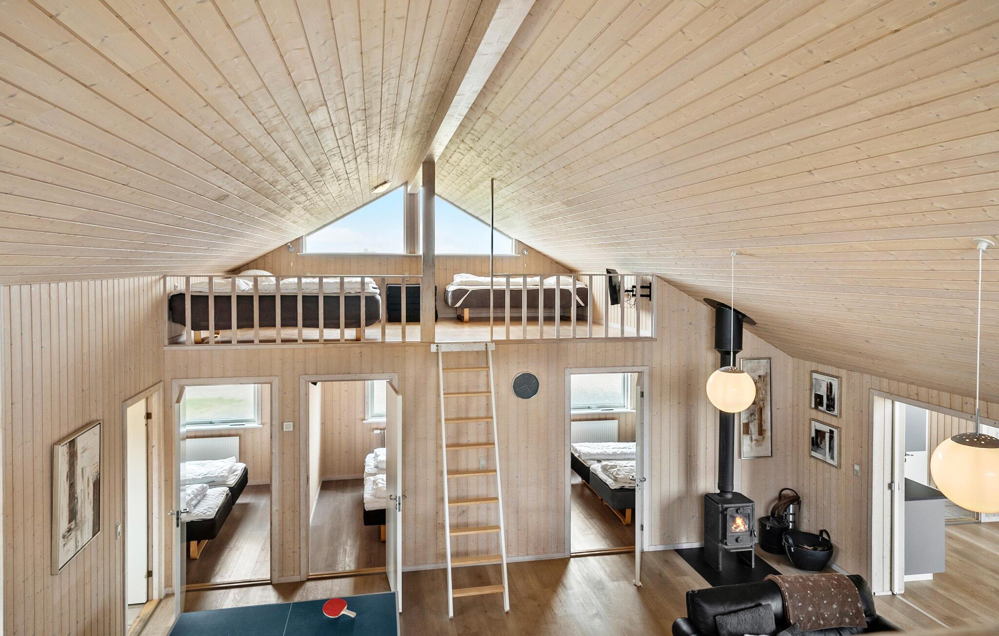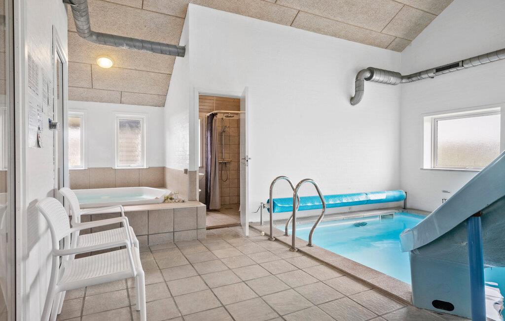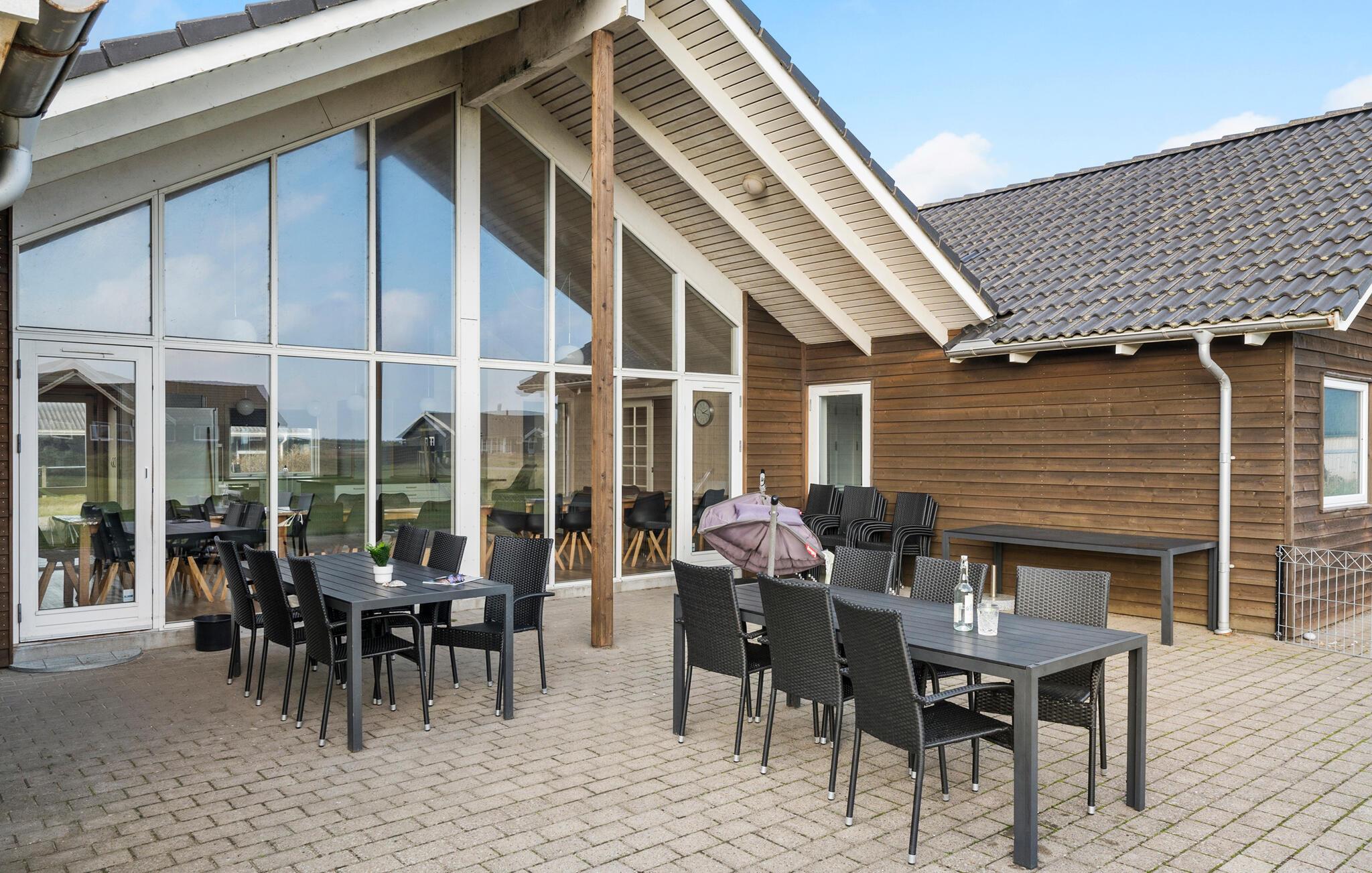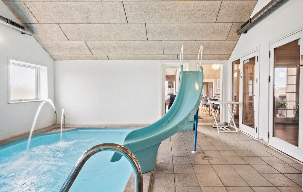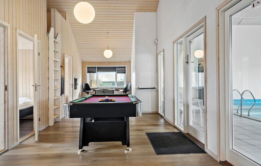 Dette moderne indrettede feriehus giver jer ideelle betingelser for et afslappet ophold med familien eller venner. Huset ligger omgivet af klitlandskab og kun et stenkast fra vandet. Udnyt det generøse boligareal og den gennemtænkte rumopdeling til fælles stunder. I har også mulighed for at trække jer tilbage hver for sig. Lav mad i det moderne køkken, som går i ét med den åbne opholds- og spisestue. Nyd måltiderne ved det lange bord med udsigt til klitterne. Slap af i stuen med komfortable sofaer og brændeovn, eller udfordr jer selv i spillerummet med bordtennis, billard og bordfodbold. I poolområdet venter en stor swimmingpool med rutsjebane, vandfontæner, spabad og sauna.