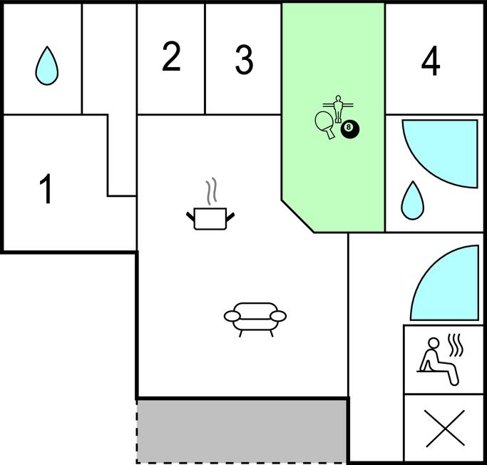Huset har 4 store soveværelser samt en hems, derudover er der aktivitetsrum med poolbord, så I kan få en masse gode turneringer. Huset har 2 badeværelser med bruser, i det ene er der desuden vaskemaskine og tørretumbler, og i det andet er der et spabad. Fra det store badeværelser er der udgang til det udendørs wellnessområde, med 6 personers udendørs standvandsspa og en udesauna, som begge kan bruges hele året. Efter en lang gåtur ved Vesterhavet er der rig mulighed for at nyde varmen fra både spa og sauna, mens I indånder den salte, friske vesterhavsluft.