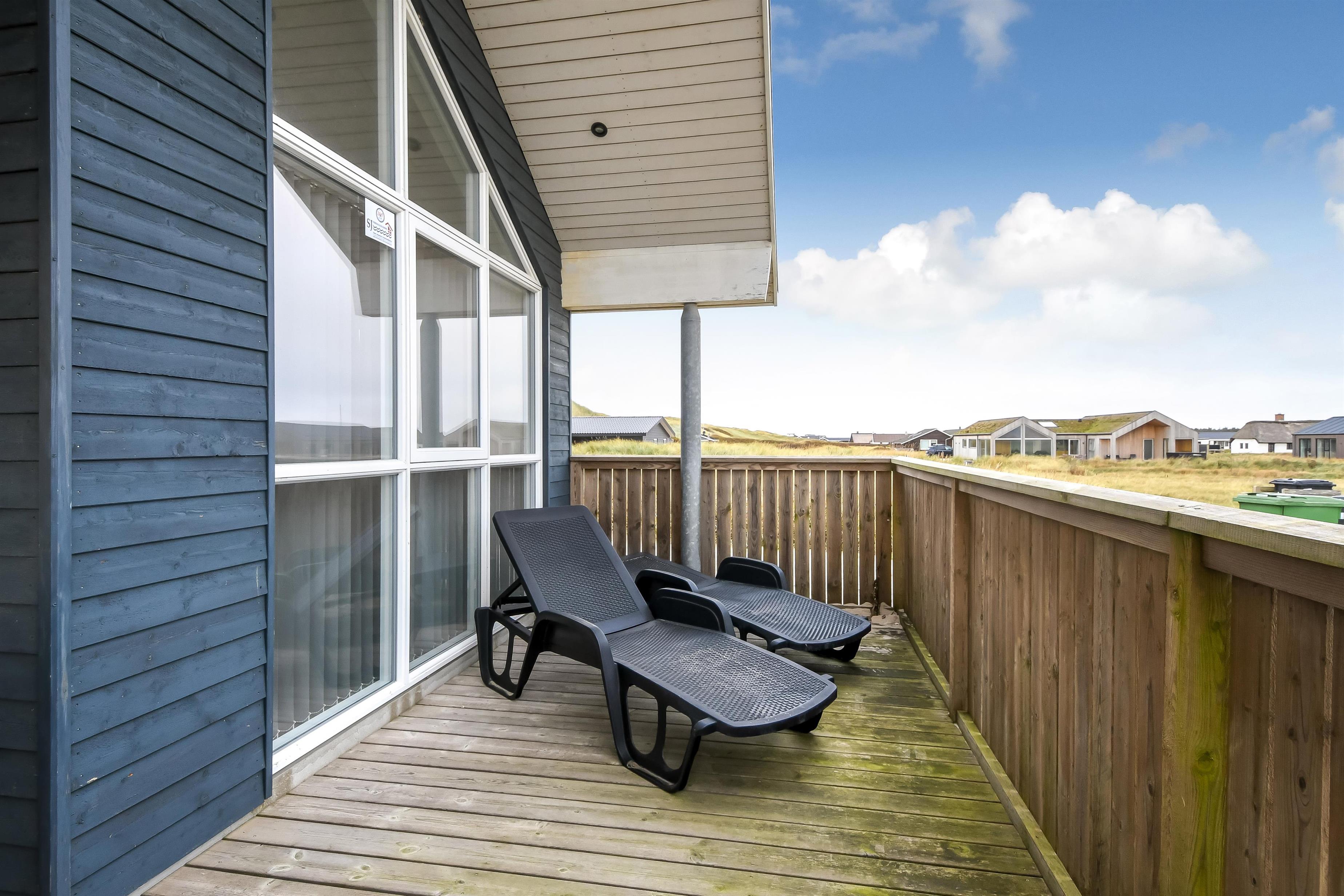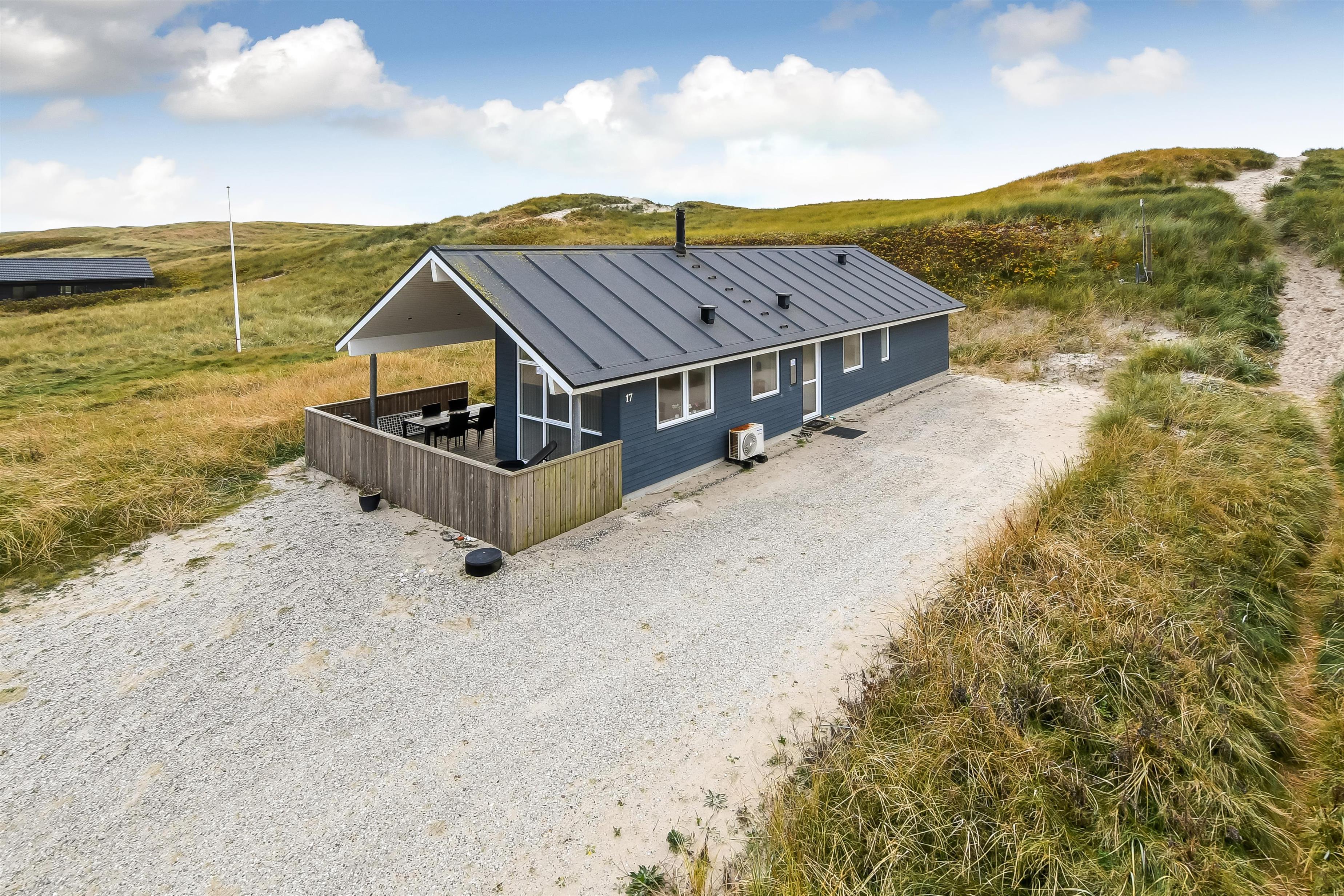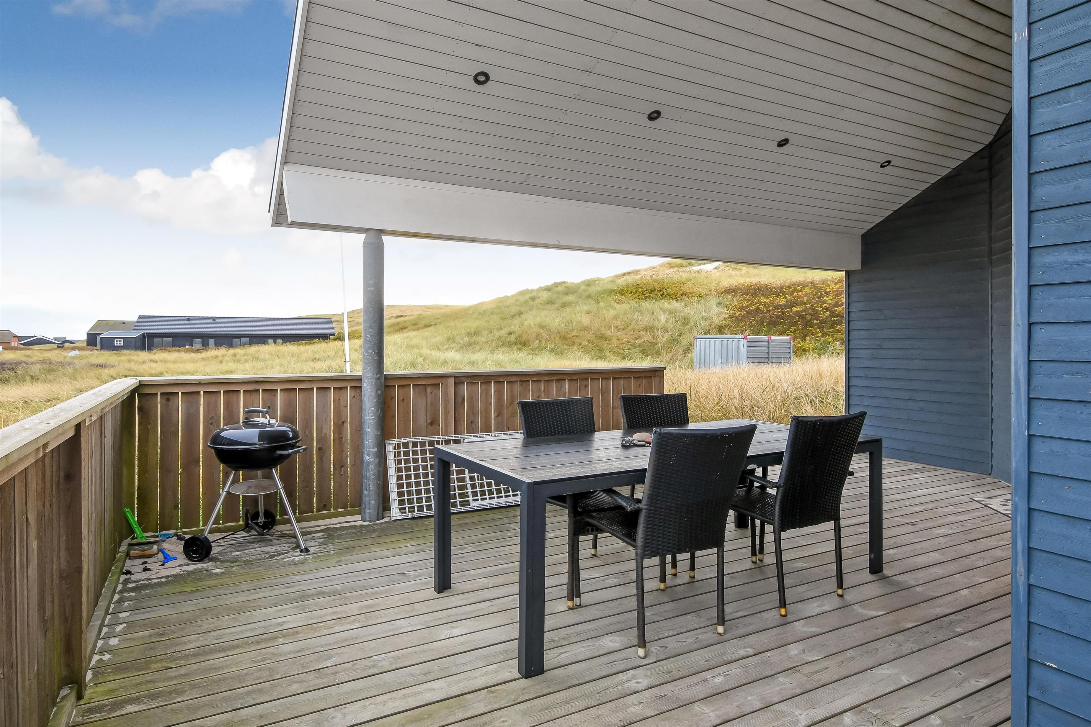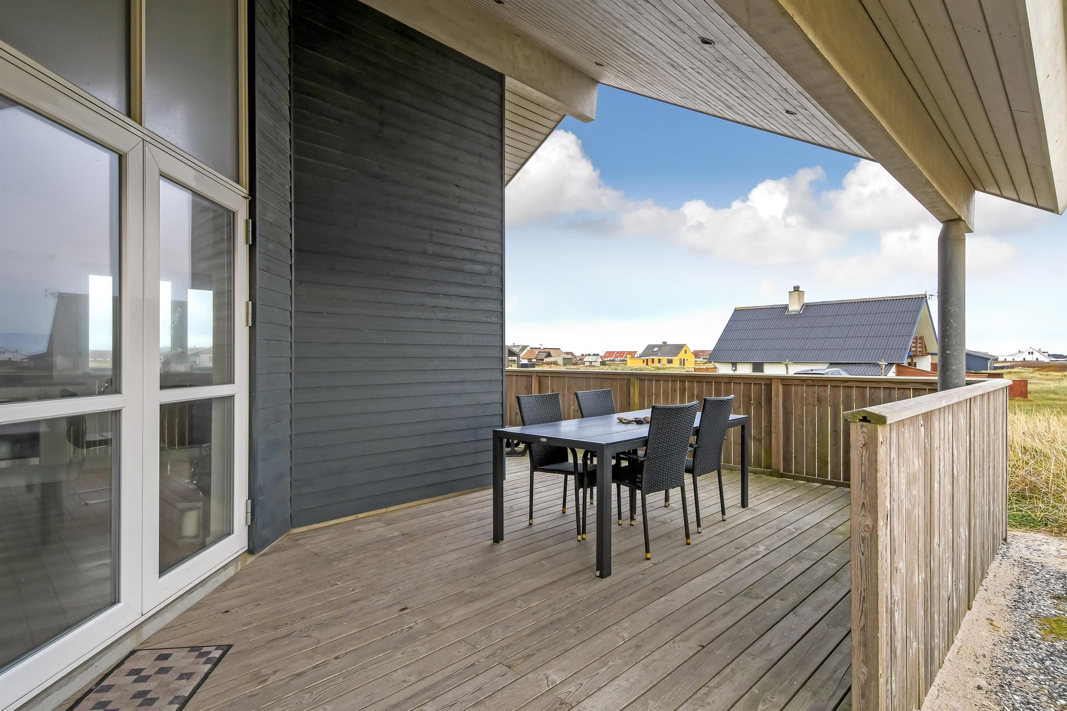 Udgang til delvis overdækket morgenterrasse samt yderligere terrasse med havemøbler og liggestole. Beliggende for enden af en blind vej, kun ca. 50m fra Vesterhavet på en ca. 1.000 m2 grund bag Vesterhavets høje klitter.
