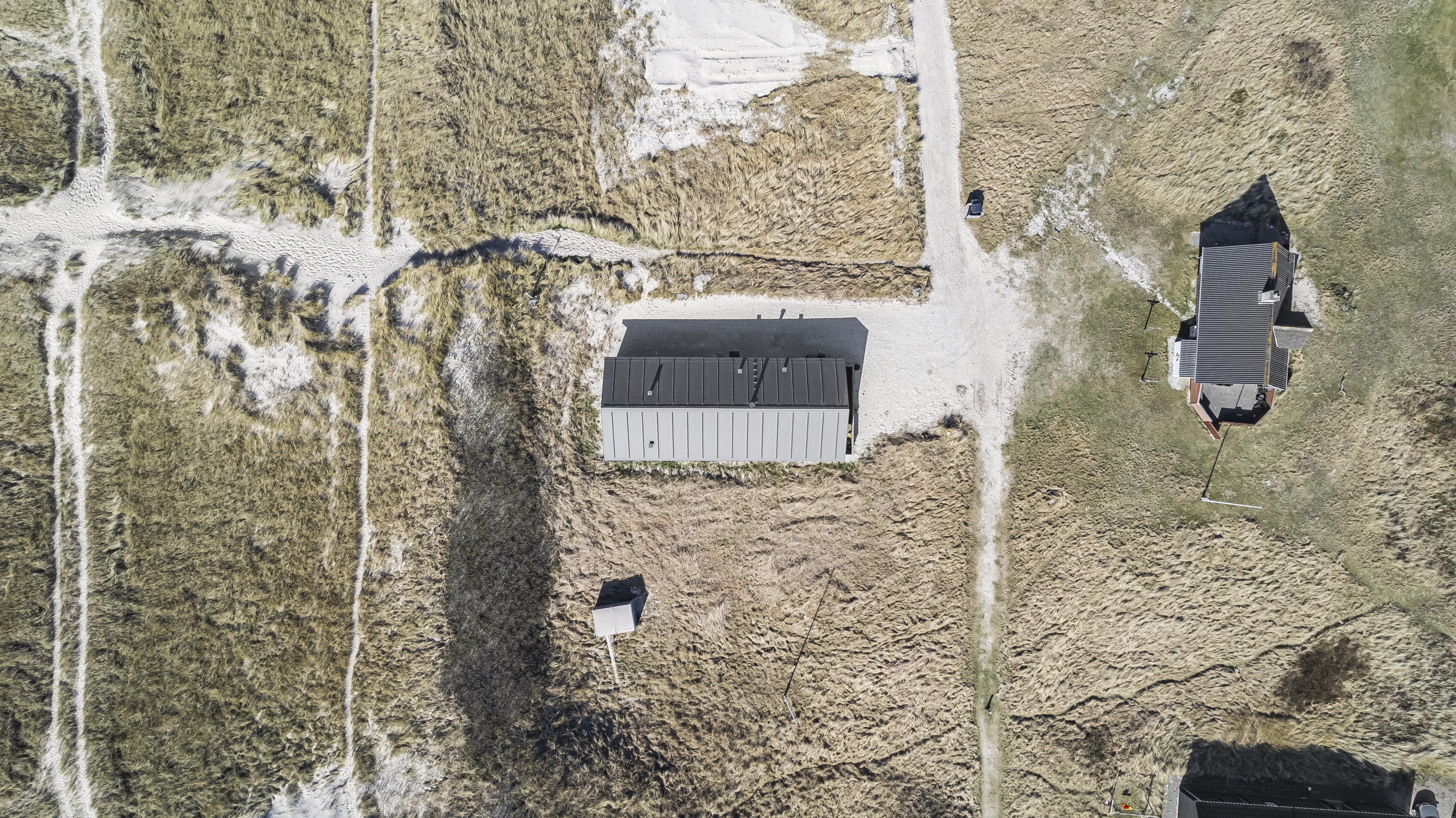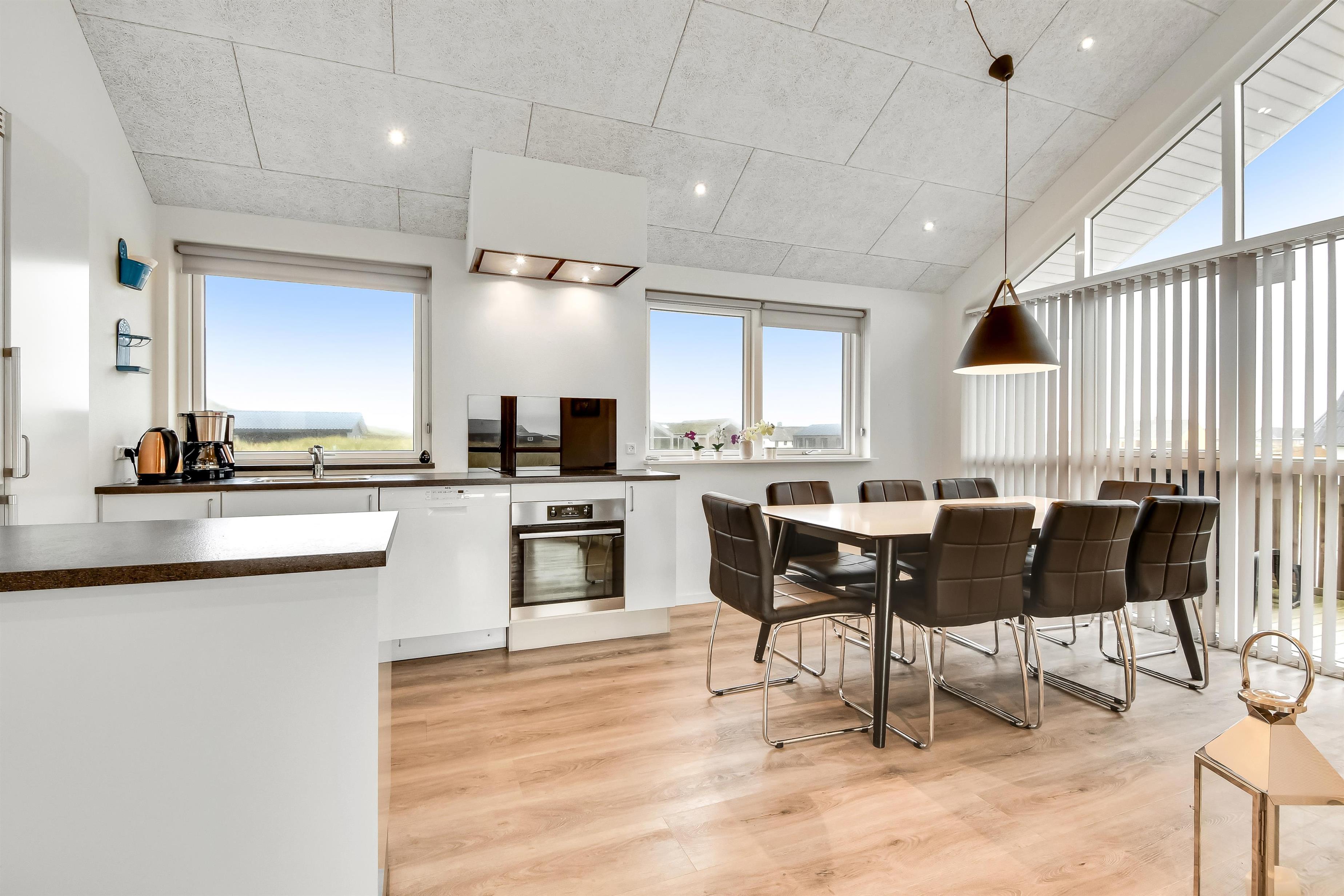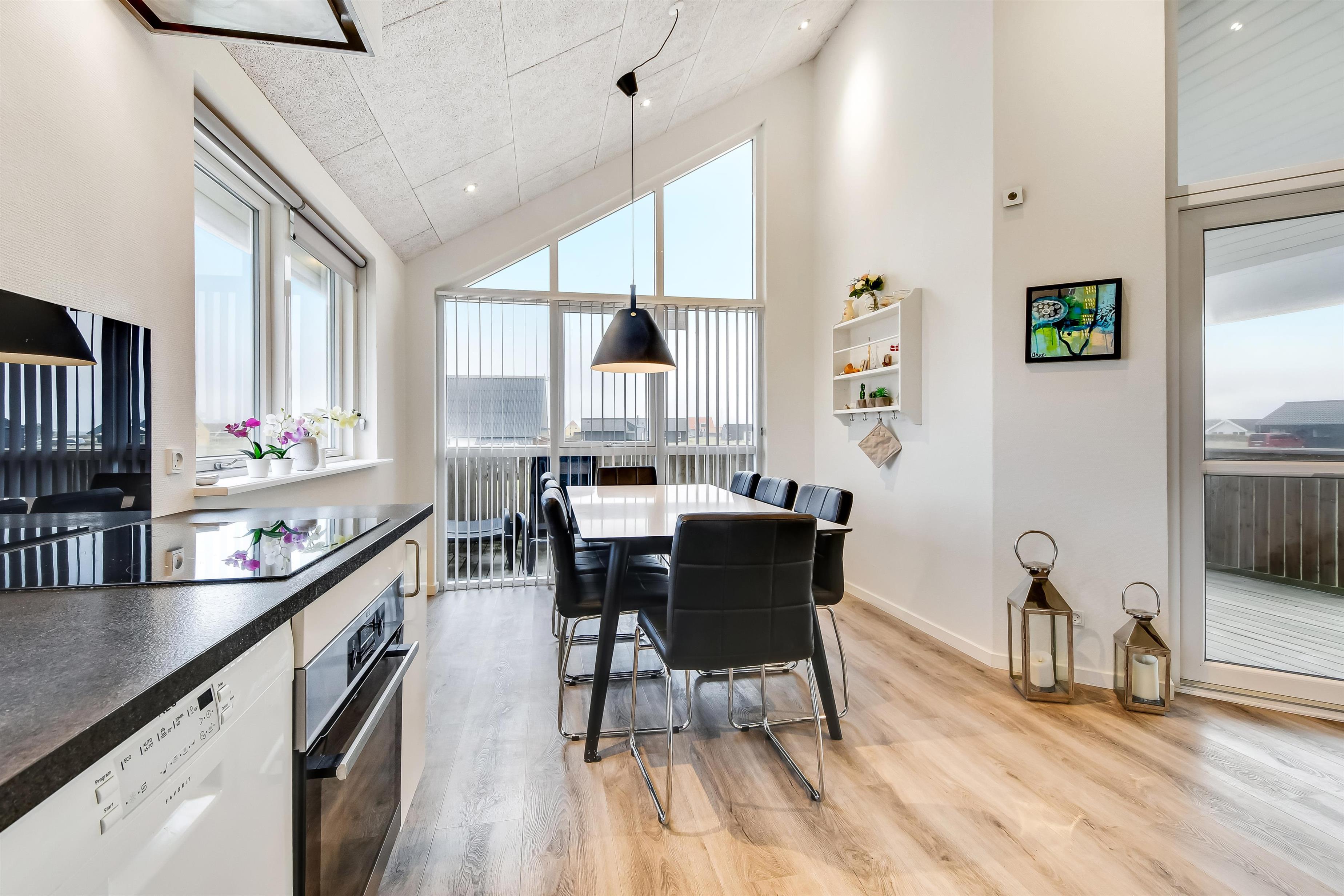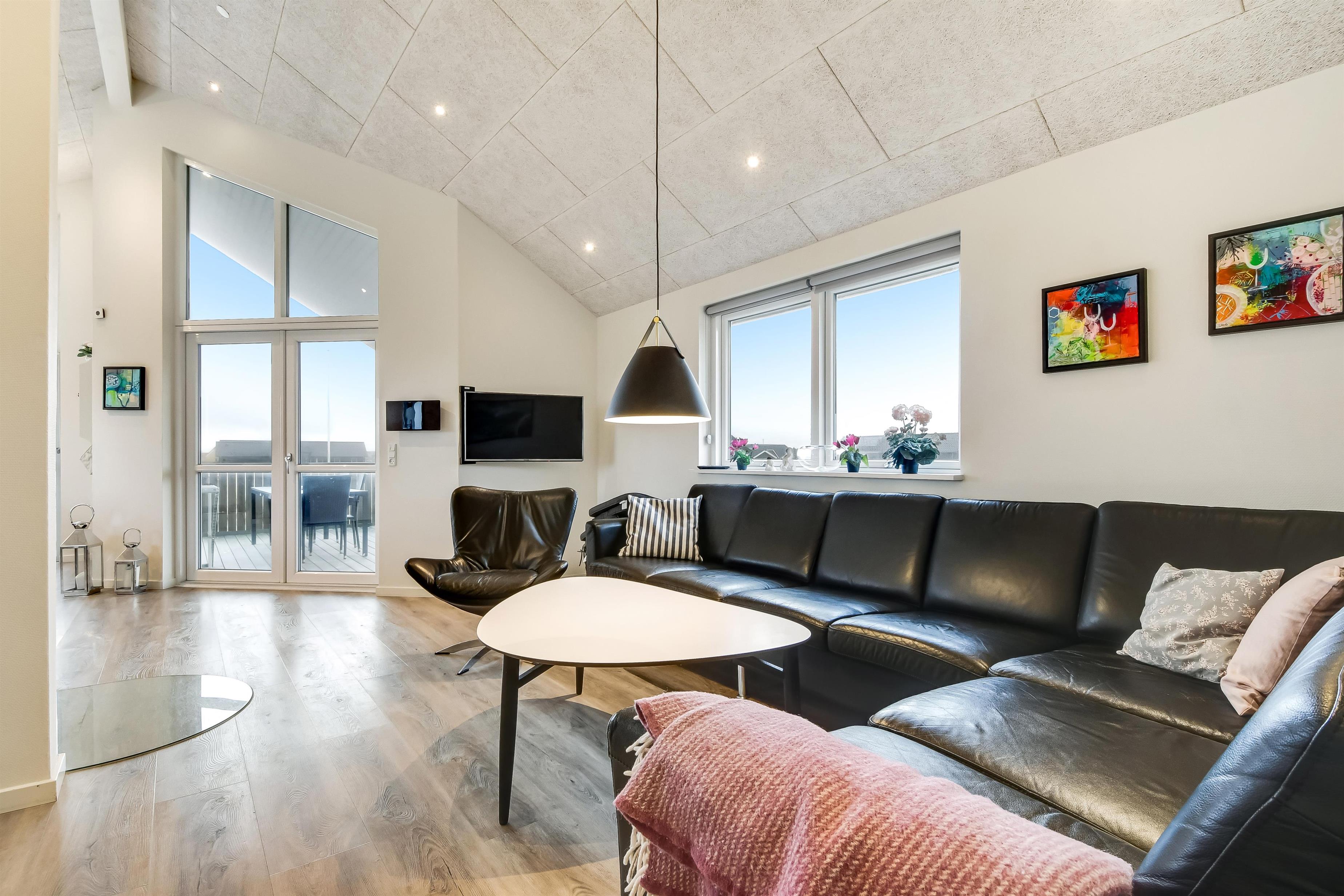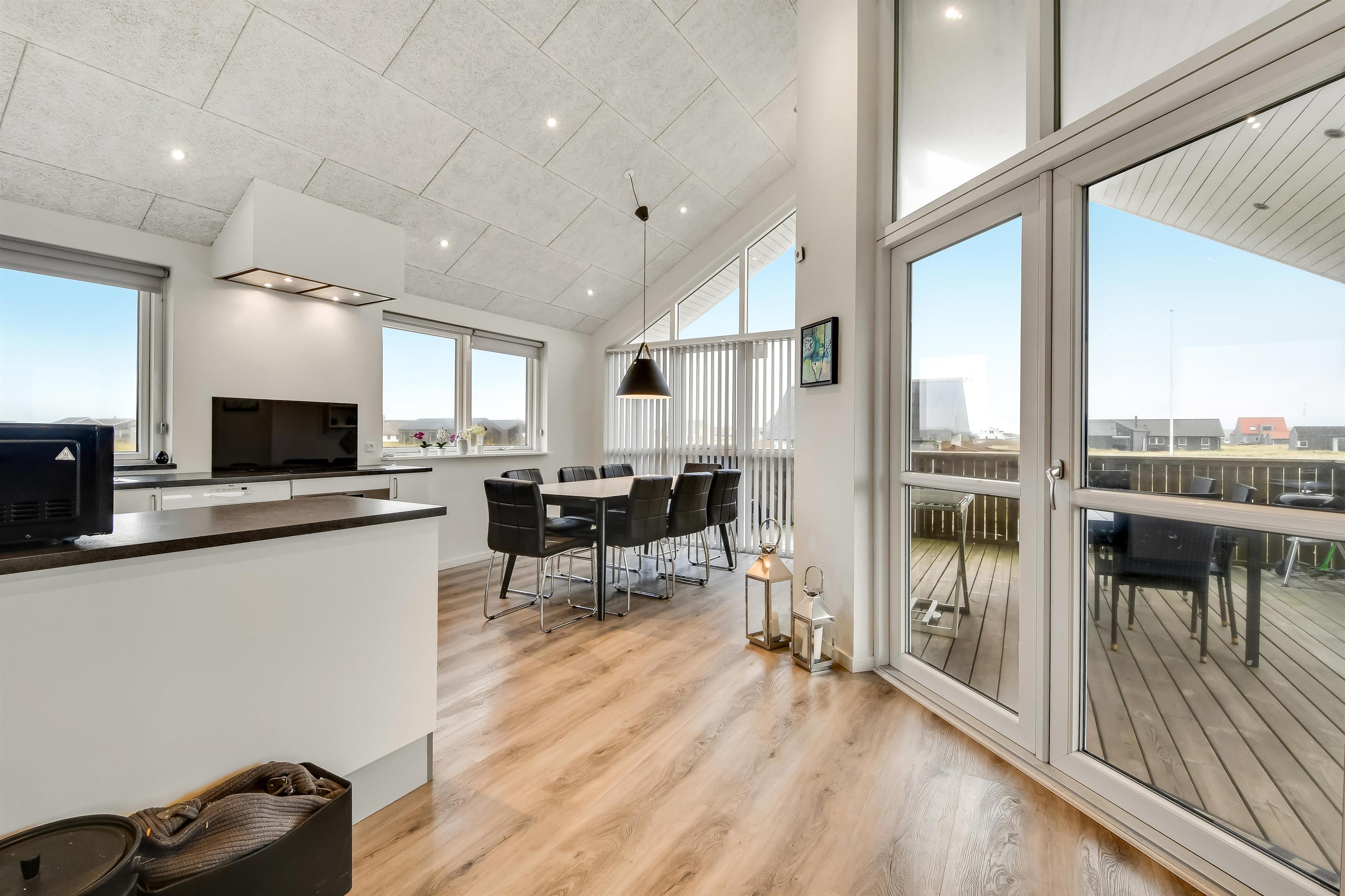 Udgang til delvis overdækket morgenterrasse samt yderligere terrasse med havemøbler og liggestole. Beliggende for enden af en blind vej, kun ca. 50m fra Vesterhavet på en ca. 1.000 m2 grund bag Vesterhavets høje klitter.