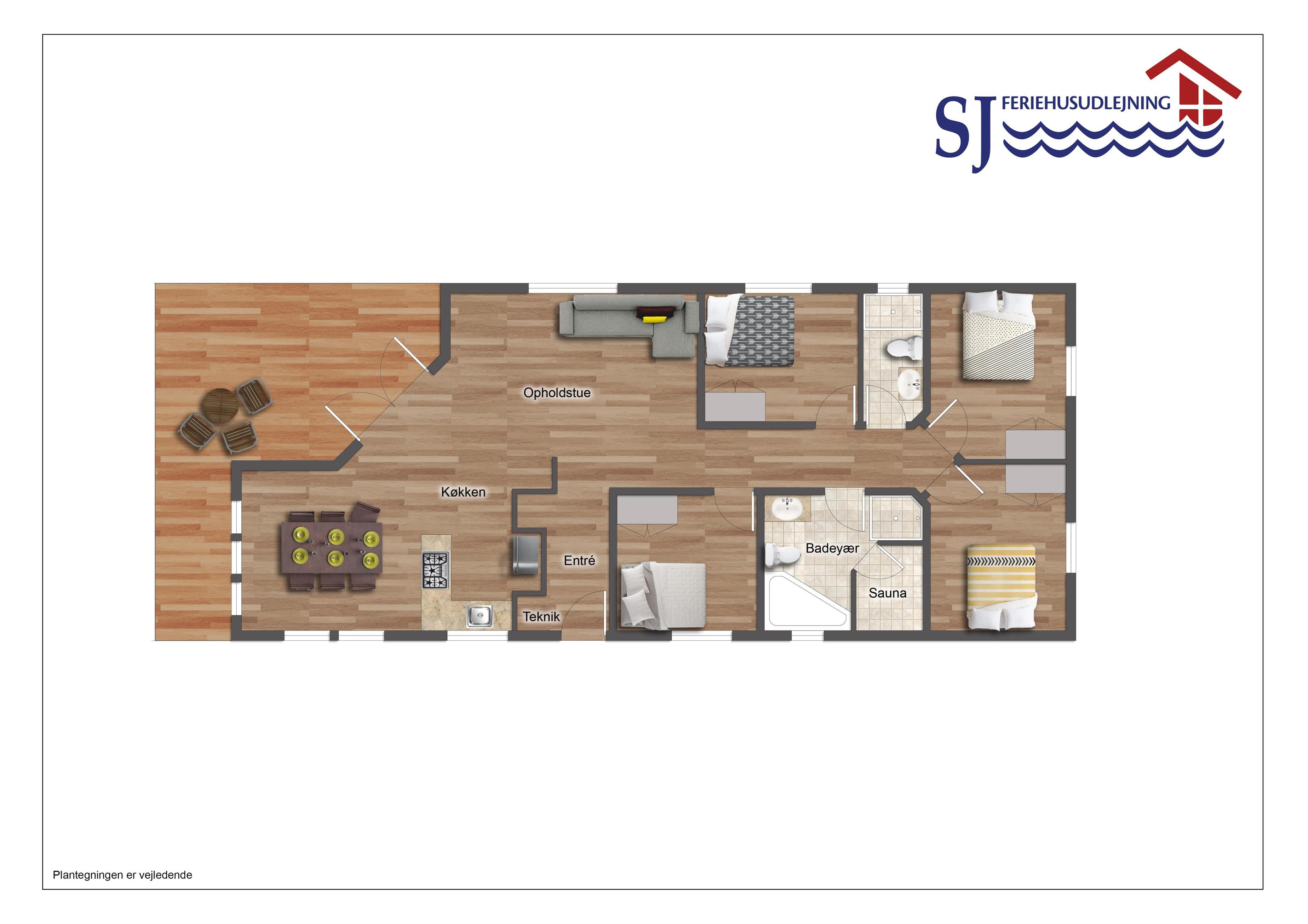 Godt udnyttet feriehus på ca. 100 m2 med 4 værelser (1DS, 1DS, 1DS, 2S). Entré med vaskemaskine, tørretumbler. Kombineret køkkenhjørne og opholdsstue med gulvvarme, TV med tyske og danske kanaler samt brændeovn. Lyst og venligt indrettet med nye møbler. Veludstyret køkkenhjørne med bl.a. opvaskemaskine og mikroovn. Stort, moderne badeværelse med toilet, spa, sauna, bruseniche og gulvvarme. Ekstra badeværelse ligeledes med toilet, bruseniche og gulvvarme. Obligatorisk slutrengøring.