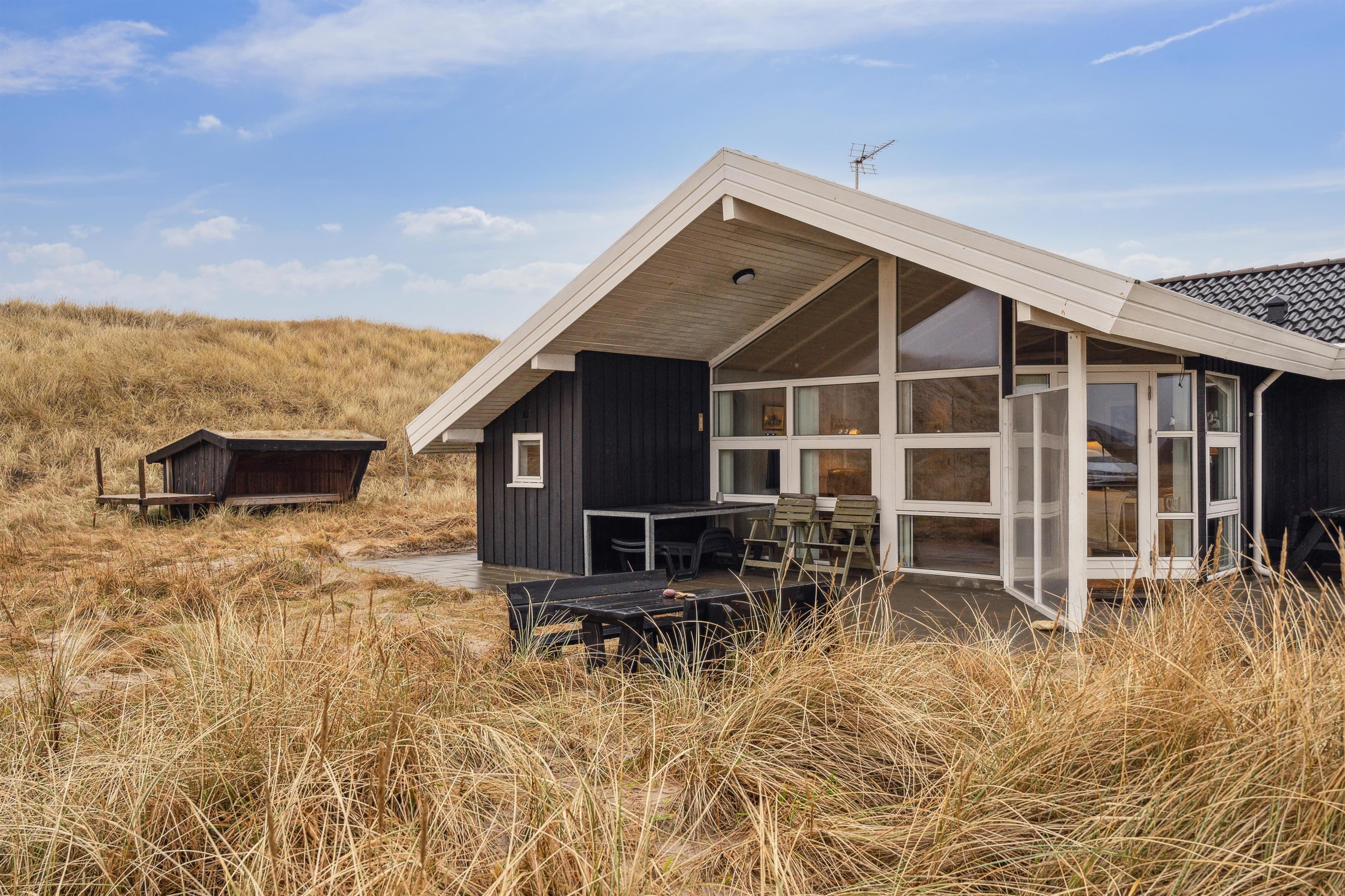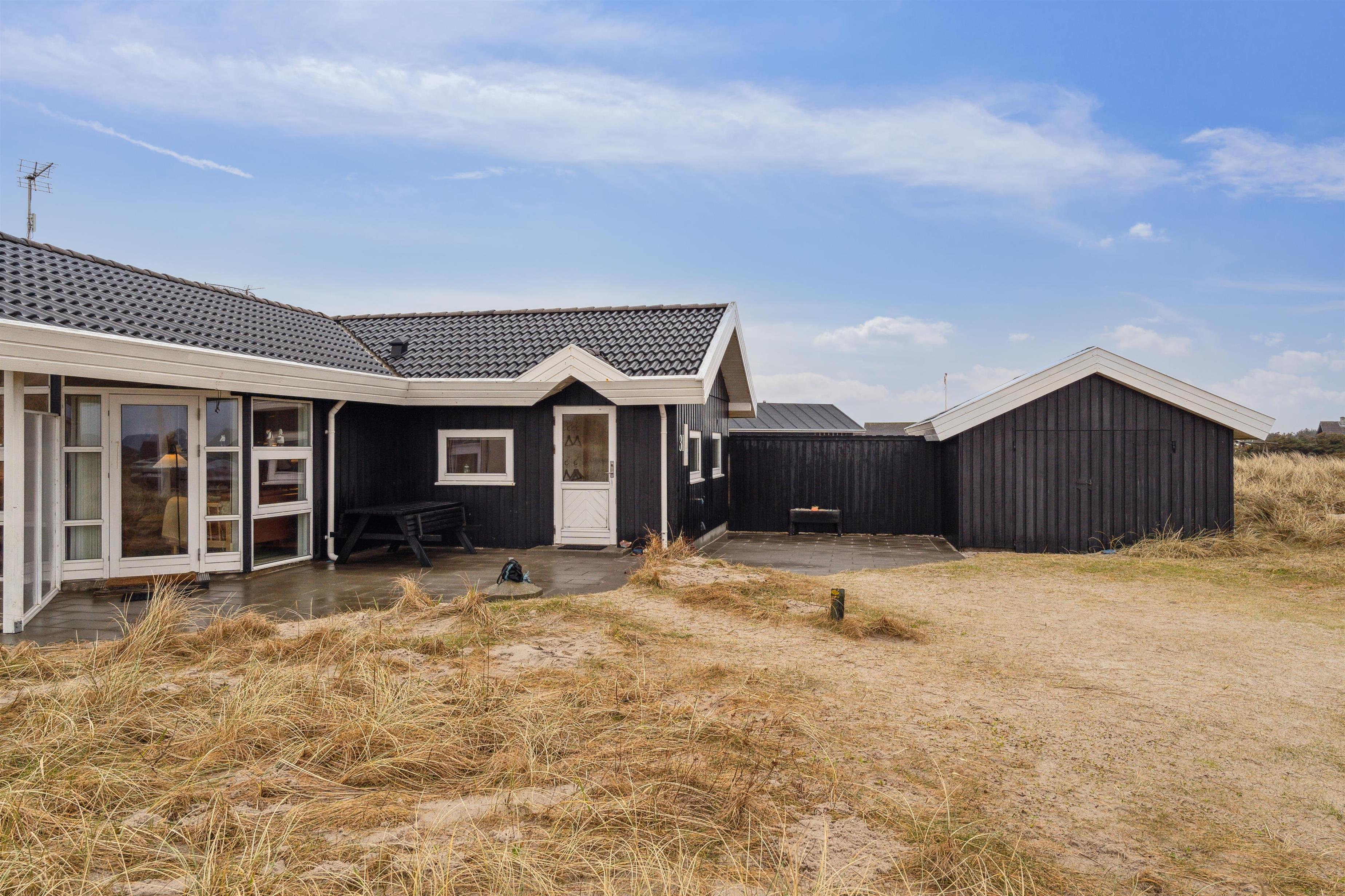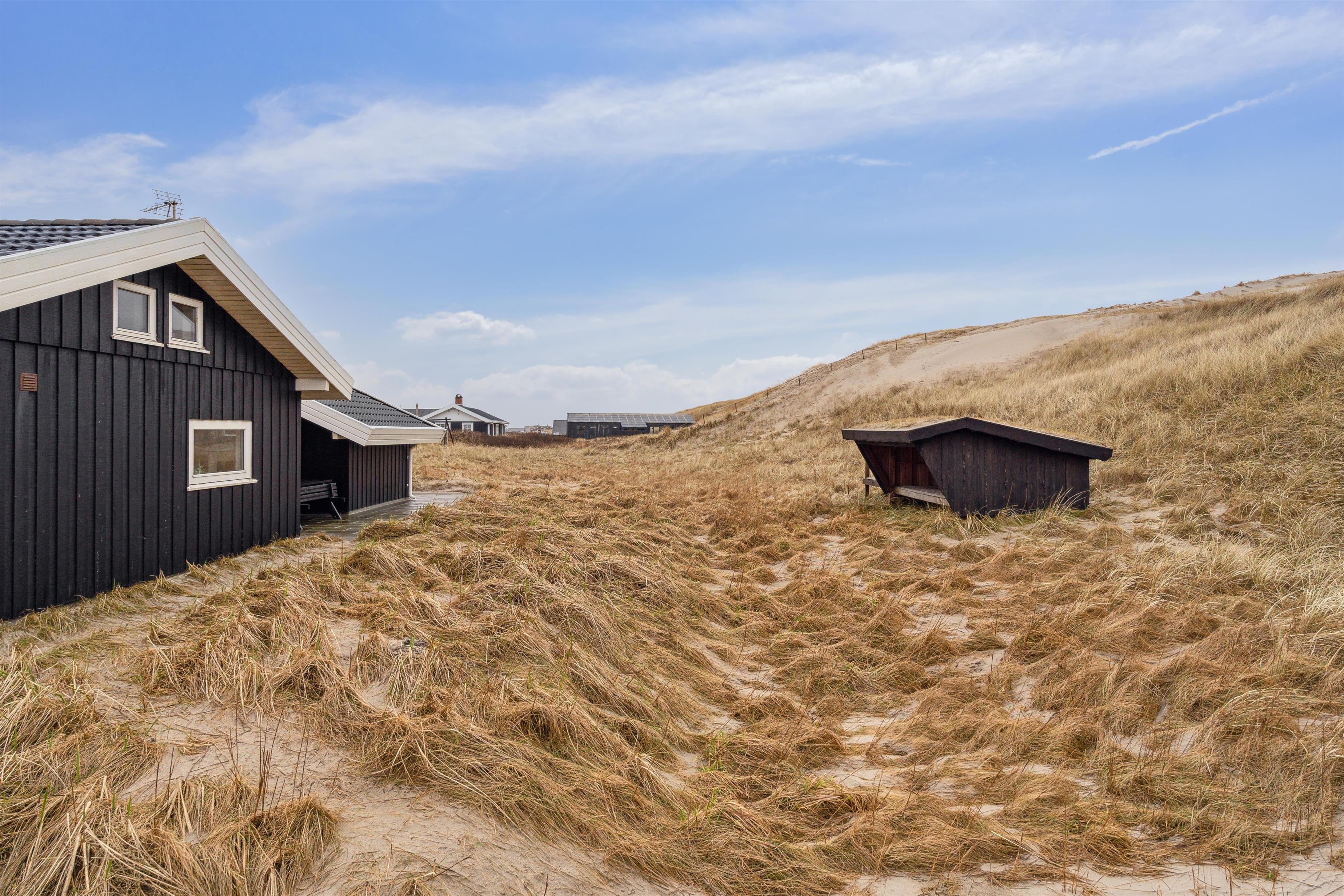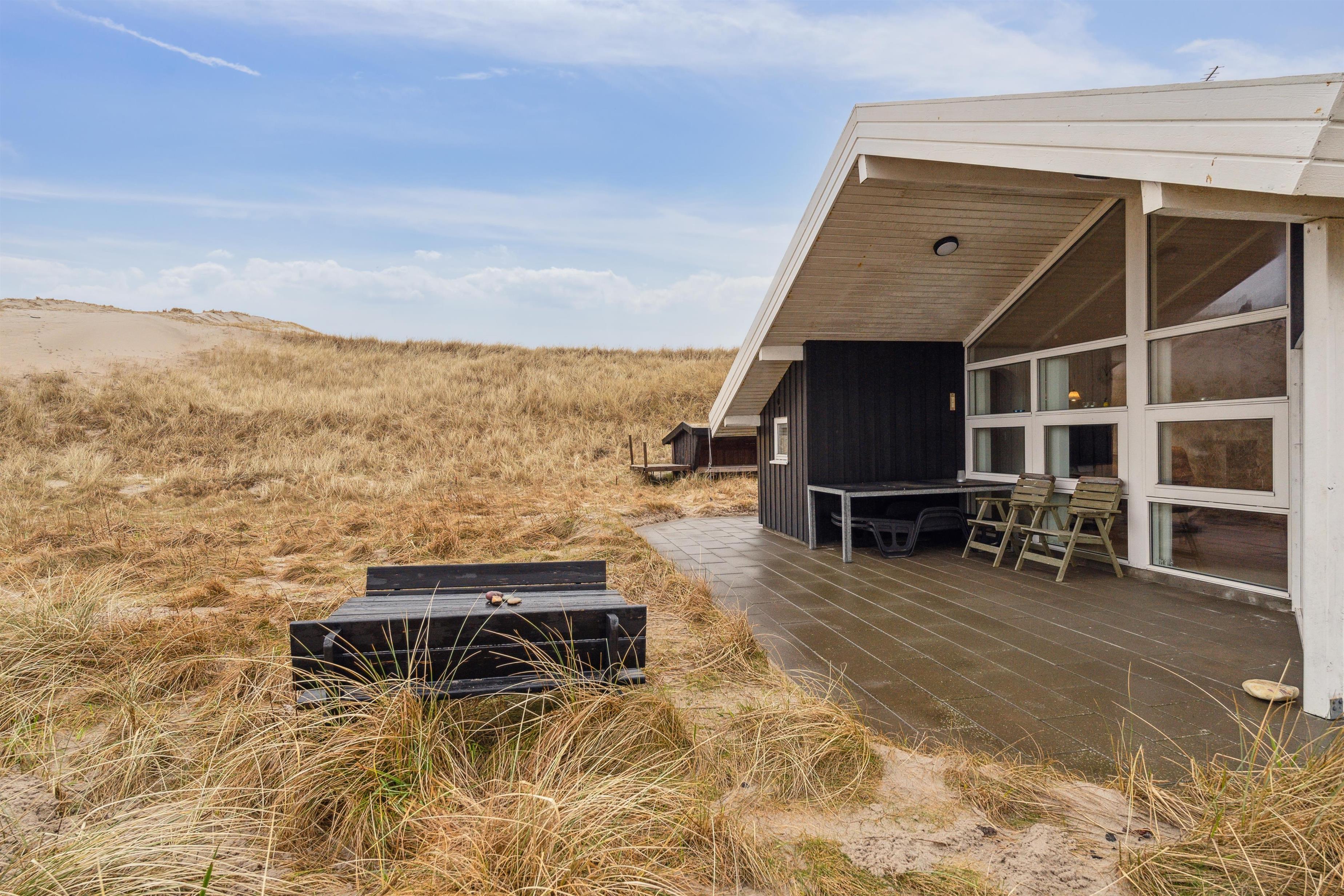 Huset har udgang til en delvis overdækket terrasse med havemøbler, parasol, liggestole og grill. Nyd solen eller en grillaften til lyden af bølgernes brusen som høres i baggrunden. Perfekt beliggende feriebolig med klitudsigt, der vil danne rammerne om jeres hel unikke ferie tæt ved Vesterhavet. Her er fantastiske omgivelser, og det er en oplevelse i sig selv at bo helt tæt ved de høje klitter, som er det eneste der adskiller huset fra Vesterhavet. Huset er beliggende for enden af en blind vej kun ca. 50 m fra Vesterhavet på en ca. 3.500 m2 grund. Nyd at Vesterhavet hver dag fortæller en ny historie, som i kan opleve på tætteste hold.