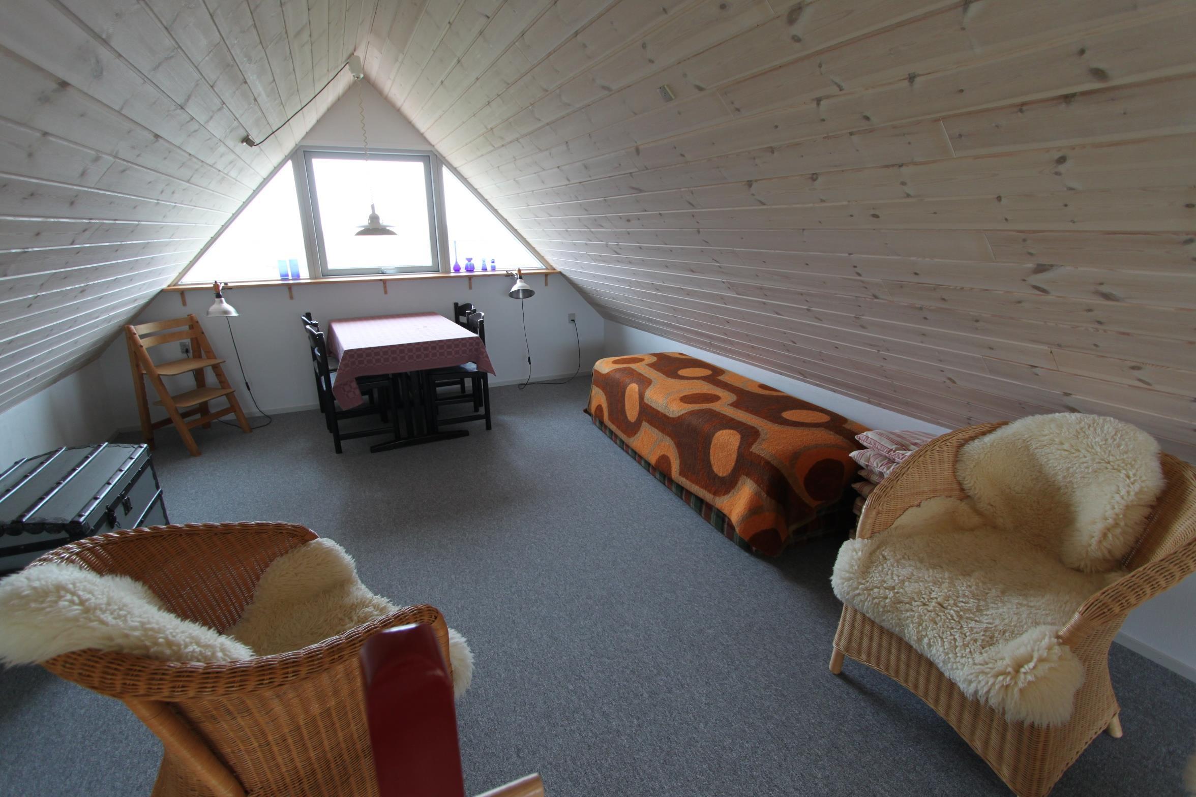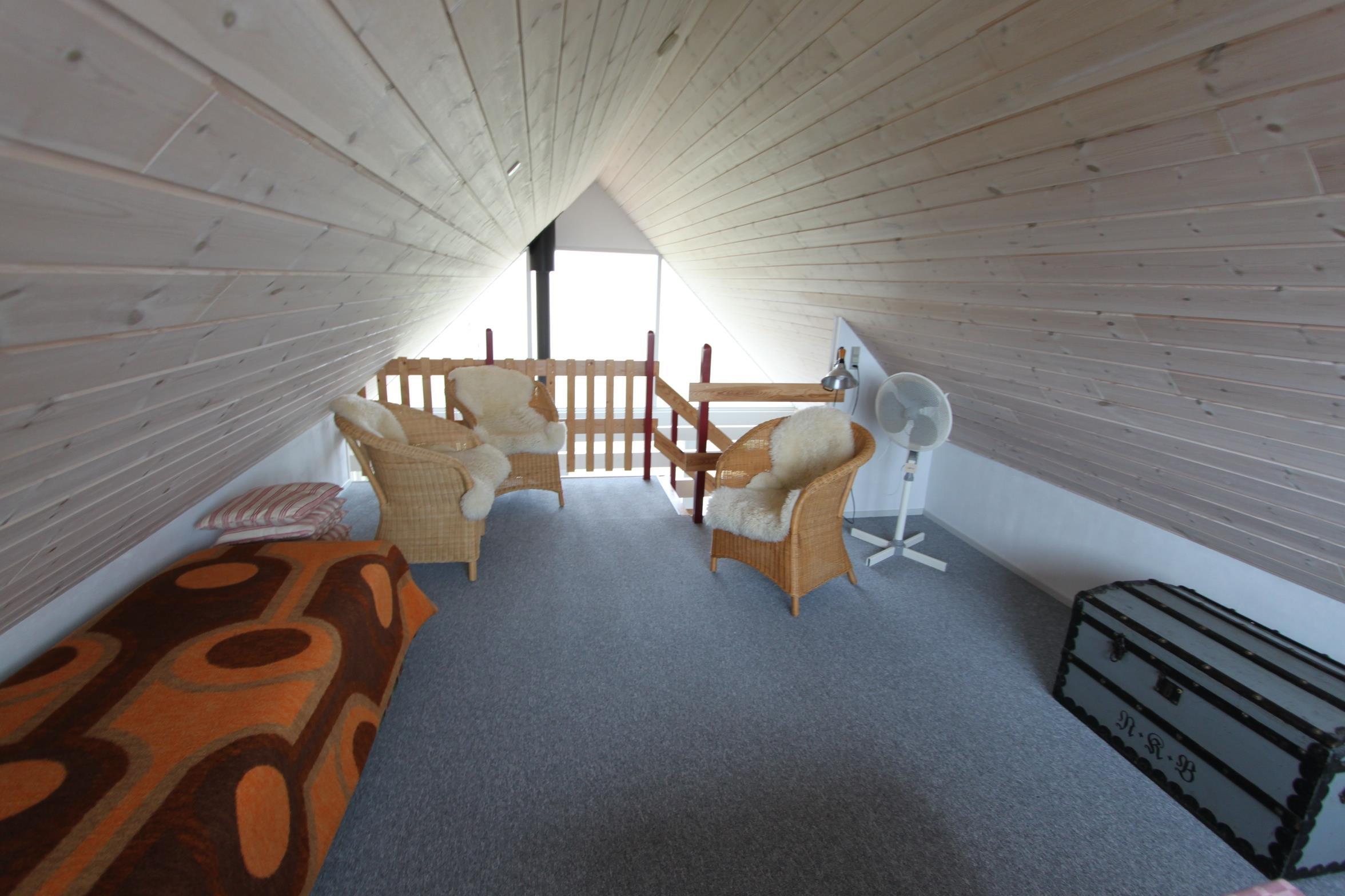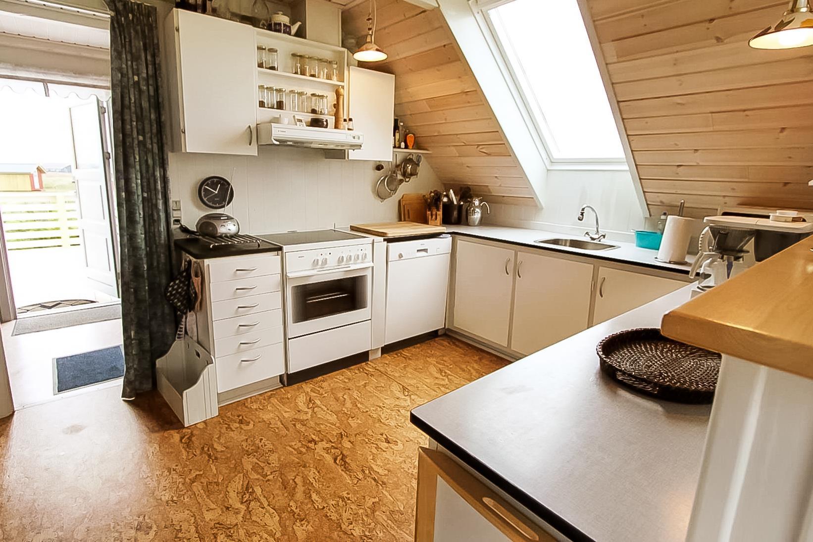Dejlig køkken som er kombineret med stuen, på den anden side af køkkenet står spisebordet og i stuen er der polstermøbler, F-TV med DR og TV2 programmer, parabol (kun tyske programmer) samt Chromecast med mulighed for streaming af radio / TV / Apps som du selv har et abonnement til, brændeovn og varmepumpe som begge er medvirkende til en dejlig varme og en billigere el-regning. Fra stuen er der en trappe op til 1. sal hvor der et opholdsrum med spisebord og kurvemøbler, herfra er der en god udsigt over området. Køkkenet er med el-komfur, køleskab med frostboks, opvaskemaskine og mikroovn. Badeværelse med toilet, håndvask og bruser. 2 soverum hver med 1 ¾ seng. Der er gulvtæpper i værelser og i stuen. Vaskemaskine. Ikke rygerhus.