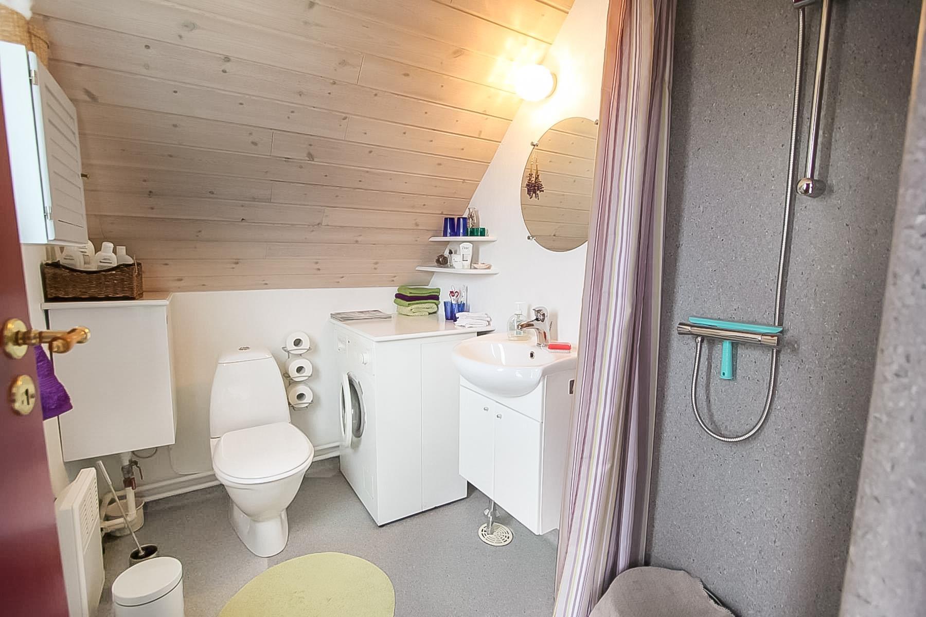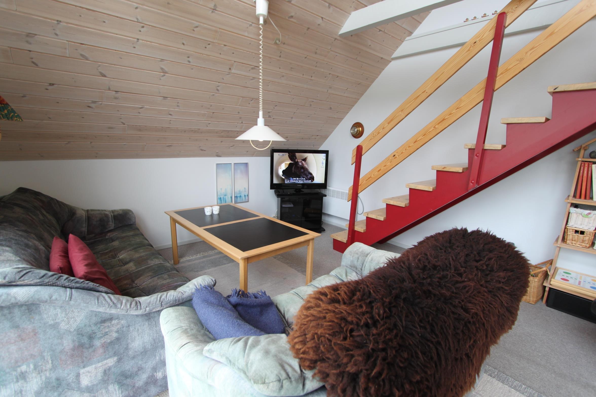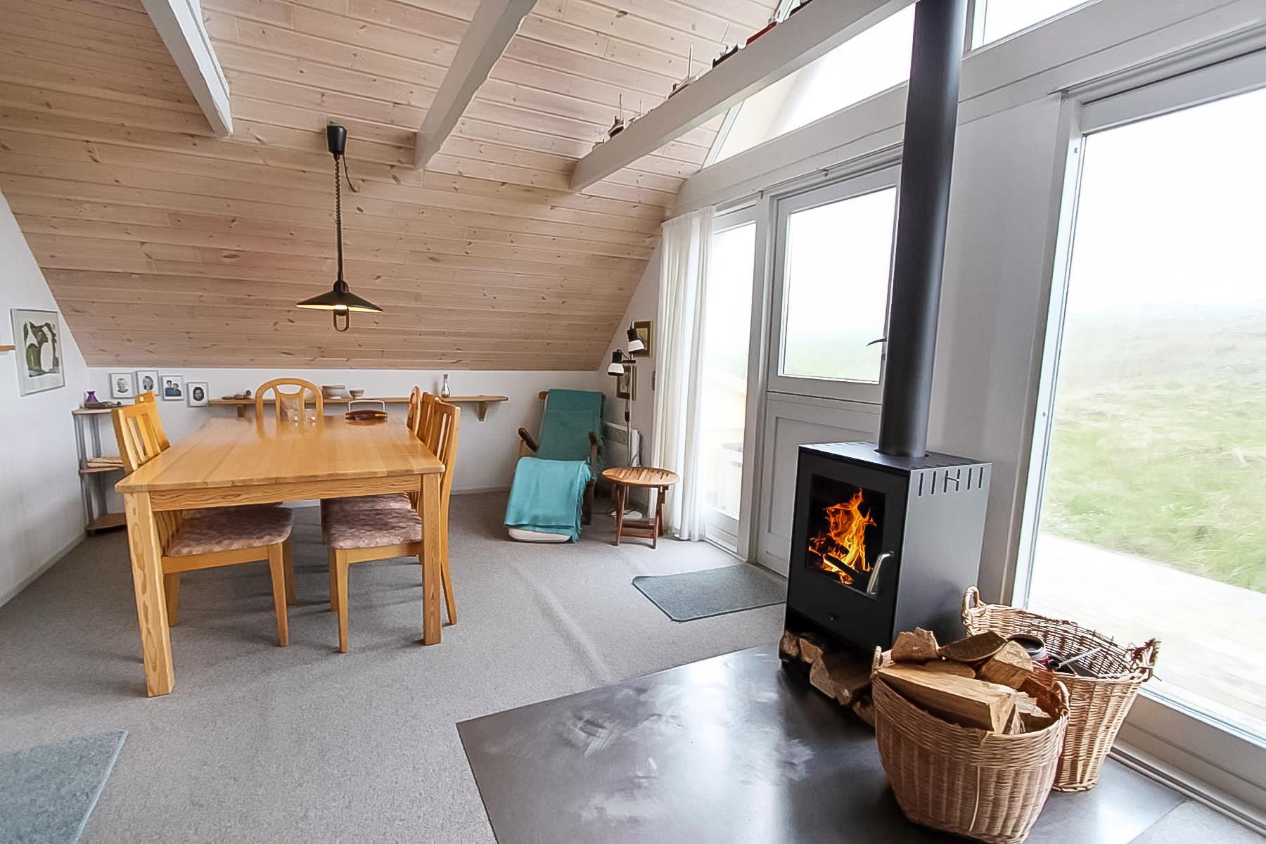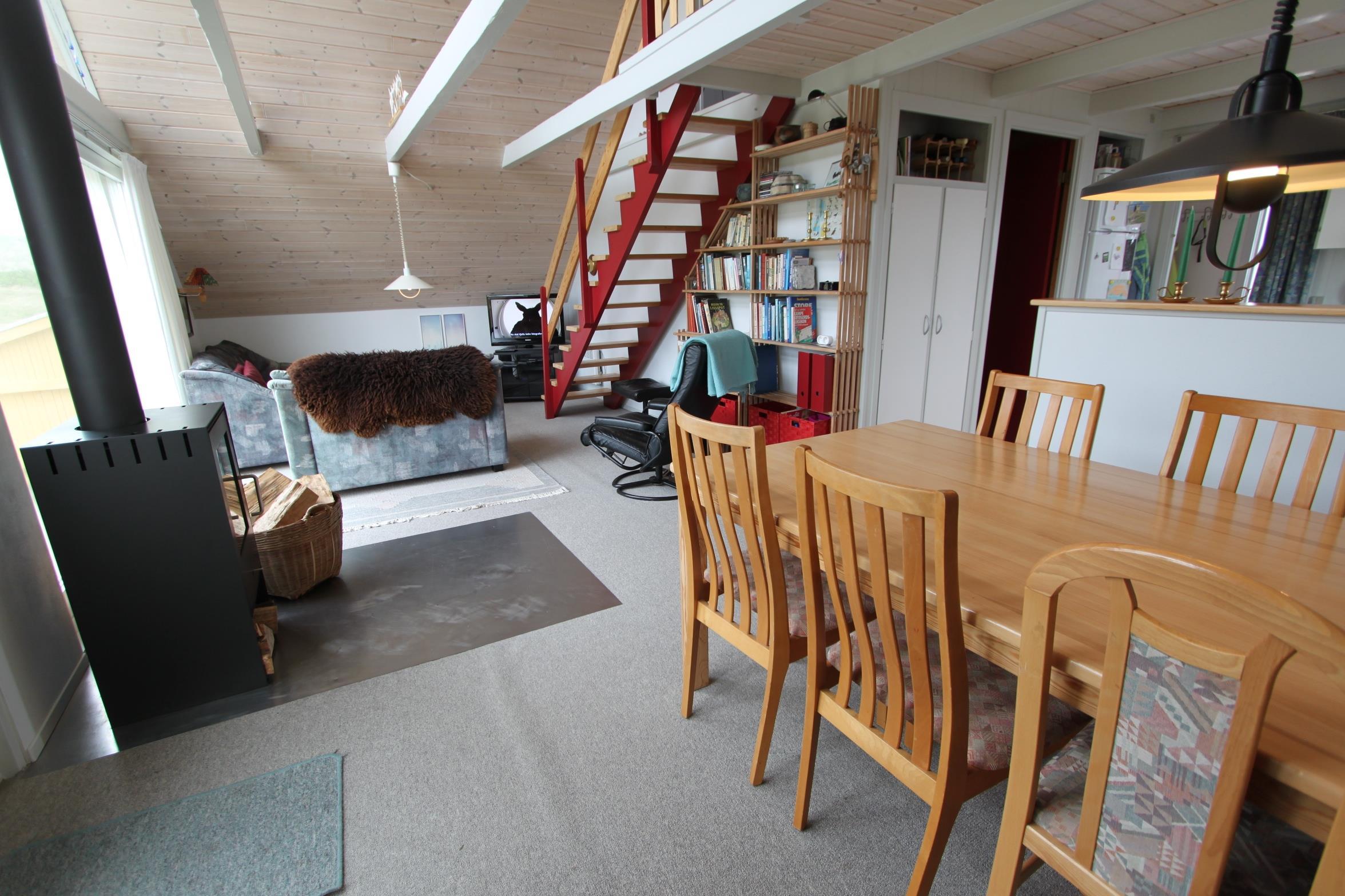 Dejlig køkken som er kombineret med stuen, på den anden side af køkkenet står spisebordet og i stuen er der polstermøbler, F-TV med DR og TV2 programmer, parabol (kun tyske programmer) samt Chromecast med mulighed for streaming af radio / TV / Apps som du selv har et abonnement til, brændeovn og varmepumpe som begge er medvirkende til en dejlig varme og en billigere el-regning. Fra stuen er der en trappe op til 1. sal hvor der et opholdsrum med spisebord og kurvemøbler, herfra er der en god udsigt over området. Køkkenet er med el-komfur, køleskab med frostboks, opvaskemaskine og mikroovn. Badeværelse med toilet, håndvask og bruser. 2 soverum hver med 1 ¾ seng. Der er gulvtæpper i værelser og i stuen. Vaskemaskine. Ikke rygerhus.
