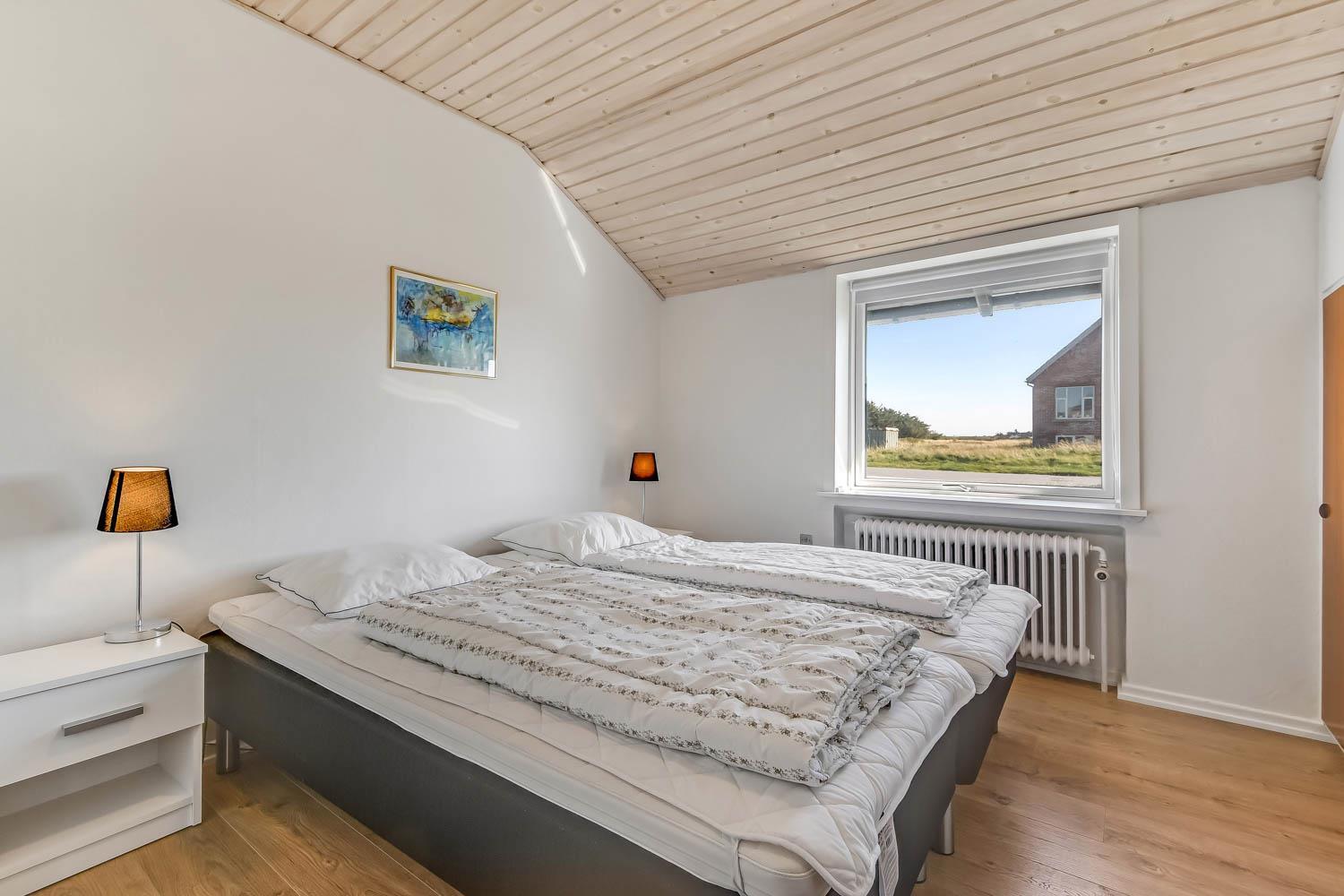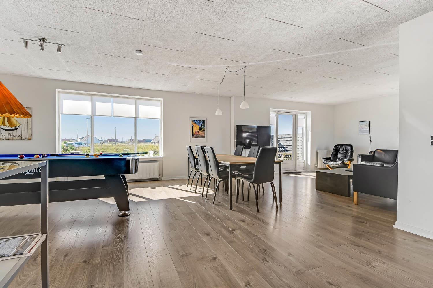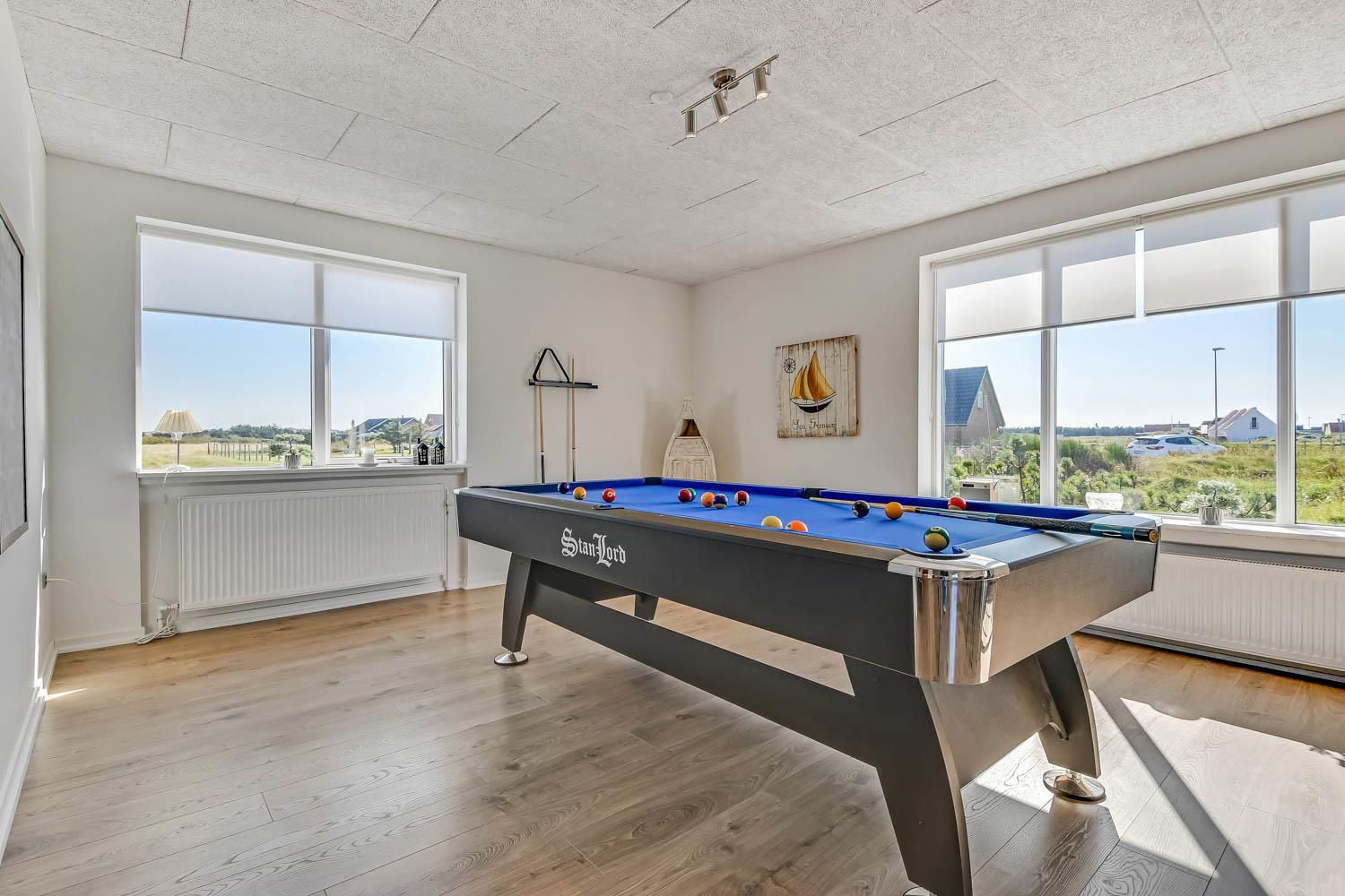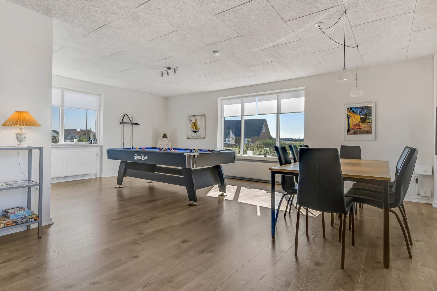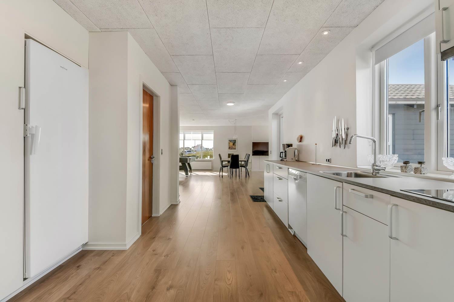 Feriehus på 145 m2. Huset er bygget i 1967 – men er i 2021 blevet totalt istandsat. Huset er minimalistisk i sit udtryk og praktisk indrettet. Entrè med ekstra afliggeplads byder velkommen. Kombineret opholdsstue og køkkenhjørne som er holdt i lyse og venlige farver. Opholdsstuen med, nye lækre lædermøbler, spisebord, Smart-TV med danske og tyske programmer samt mulighed for streaming af TV / radio / Apps samt billardbord. Ideelt til aktivitet hen over hele dagen. Varmepumpen hjælper med at reducere udgiften til varmeregningen. Praktiske og rengøringsvenlige hårde gulve i hele huset. 4 gode soverum med gode nye senge (1DS, 1DS, 1DS, 1DS). Helt nyt og lækkert køkkenhjørne med alt i service / køkkengrej samt komfur med glaskeramiske kogeplader, emhætte, opvaskemaskine, køleskab og mikroovn. Flot, nyt badeværelse klinkegulv med gulvvarme, toilet, håndvask, bruser samt vaskemaskine og tørretumbler. Ekstra badeværelse med klinkegulv med gulvvarme, toilet, håndvask og bruser. Fryser i udehus. Ikke ryger hus. Husdyr ikke tilladt.