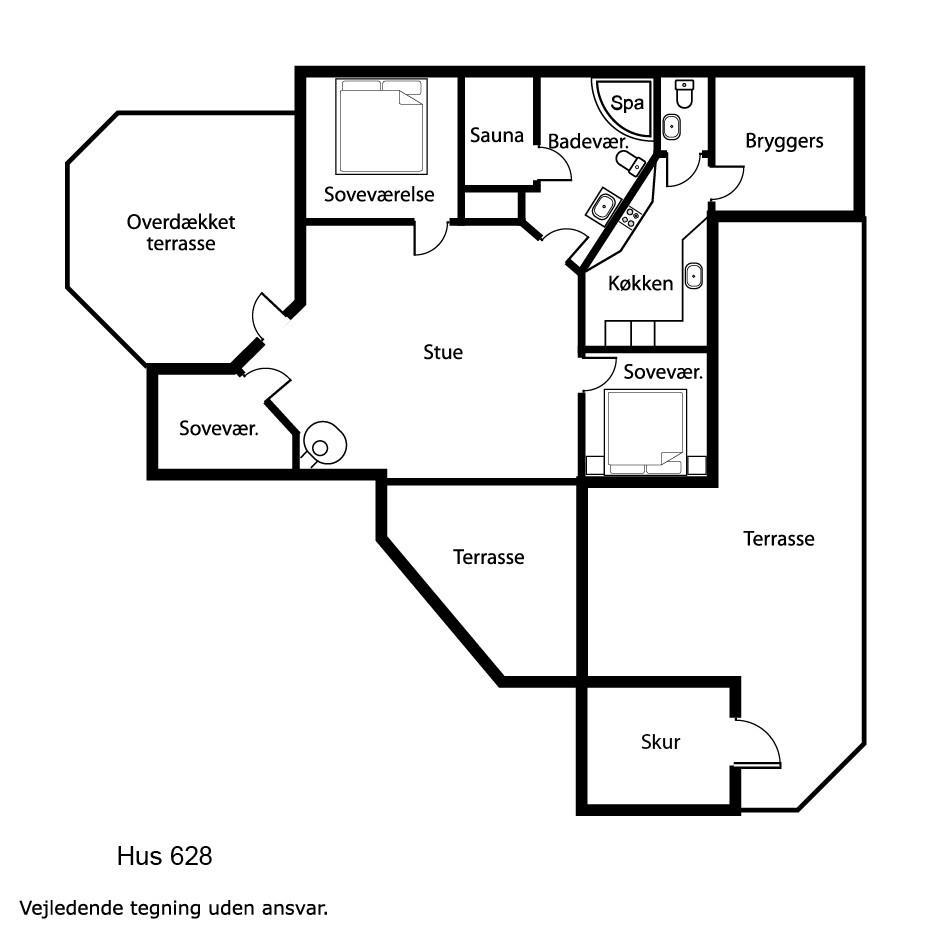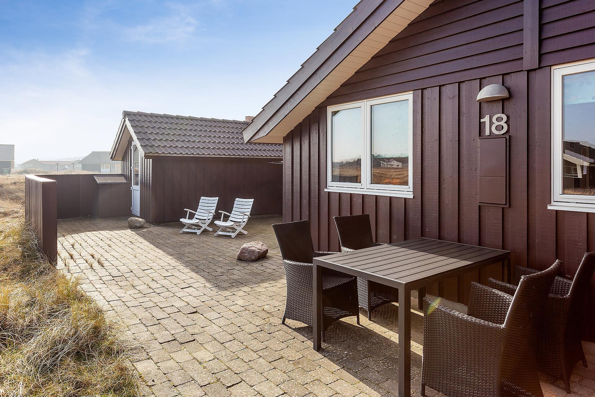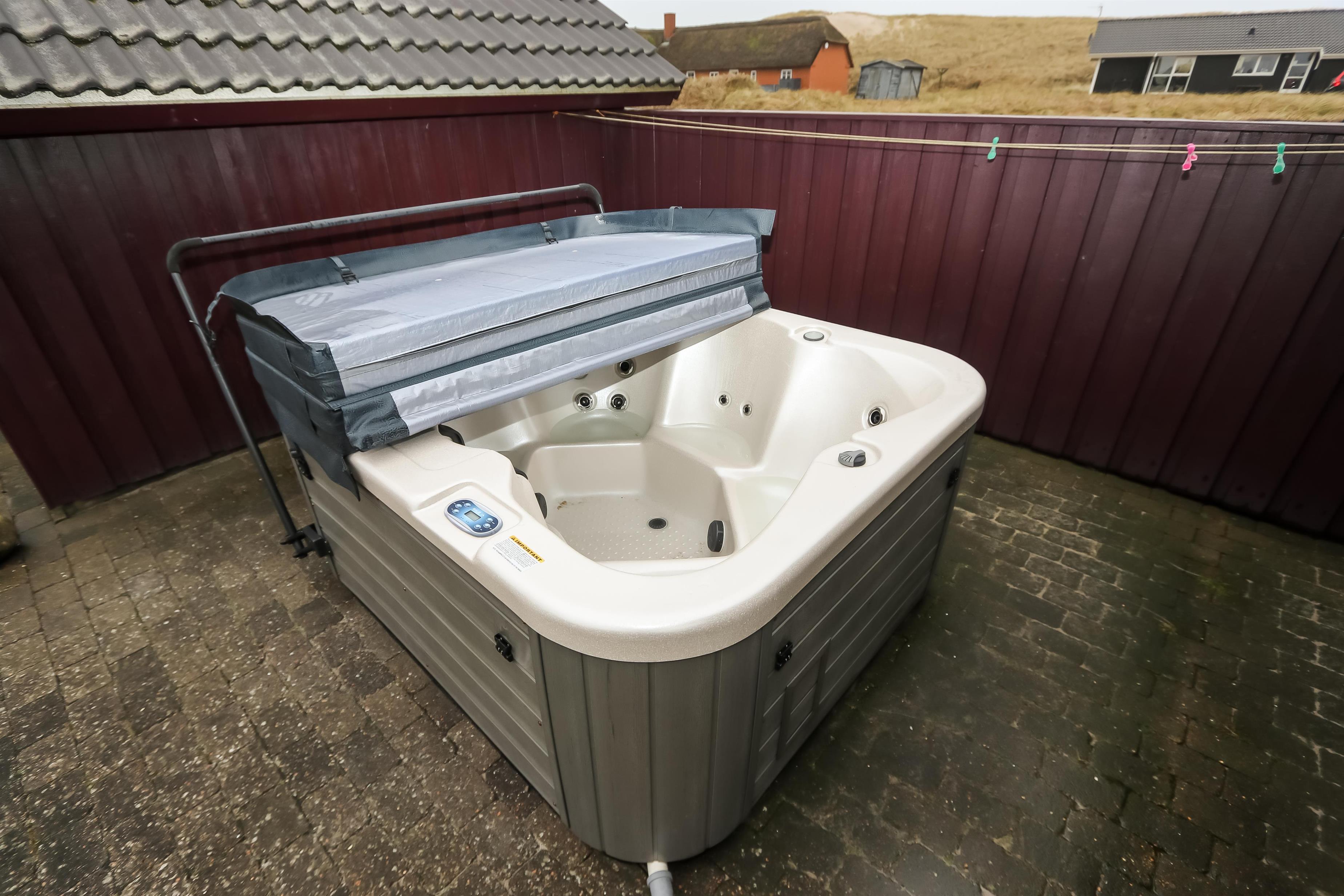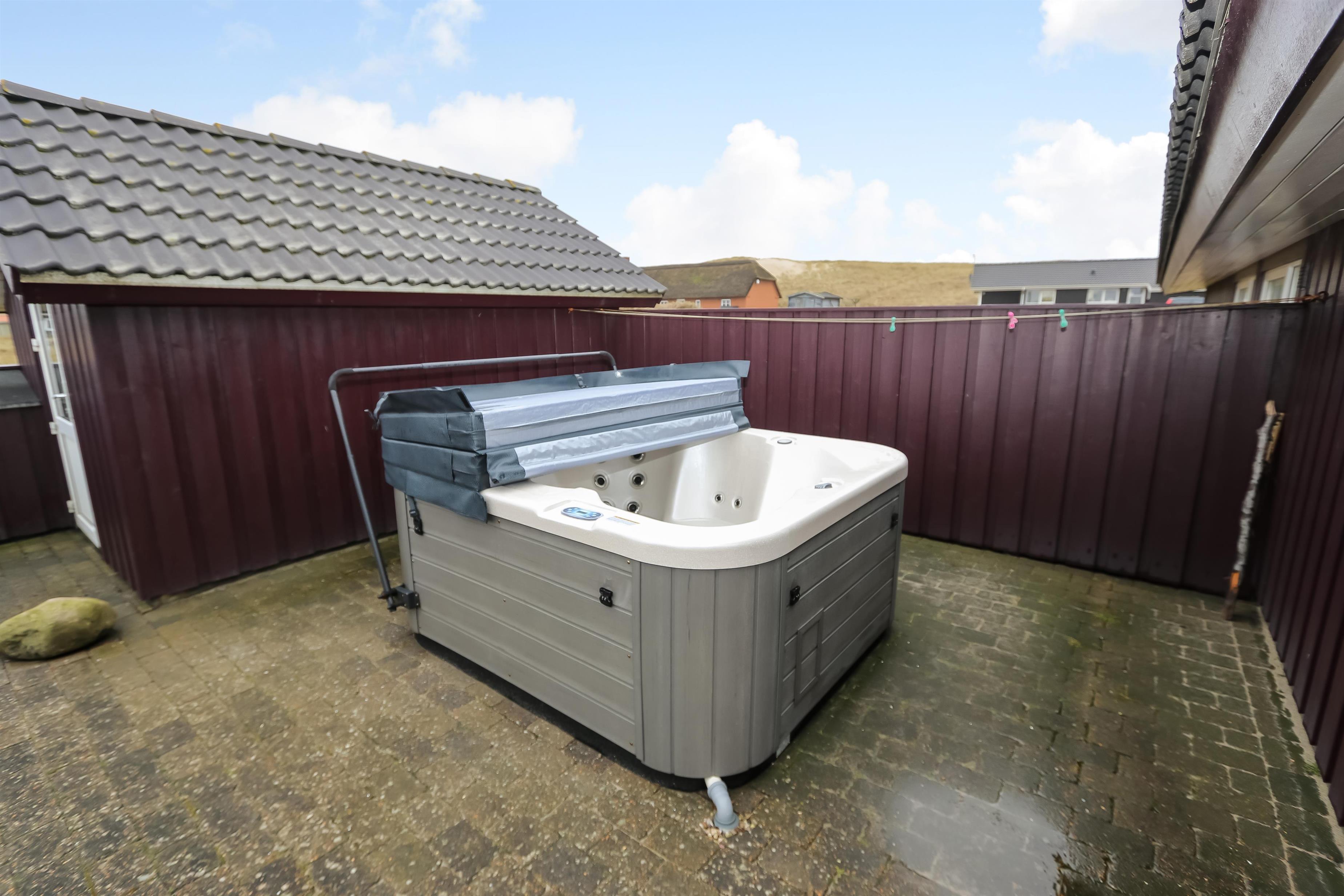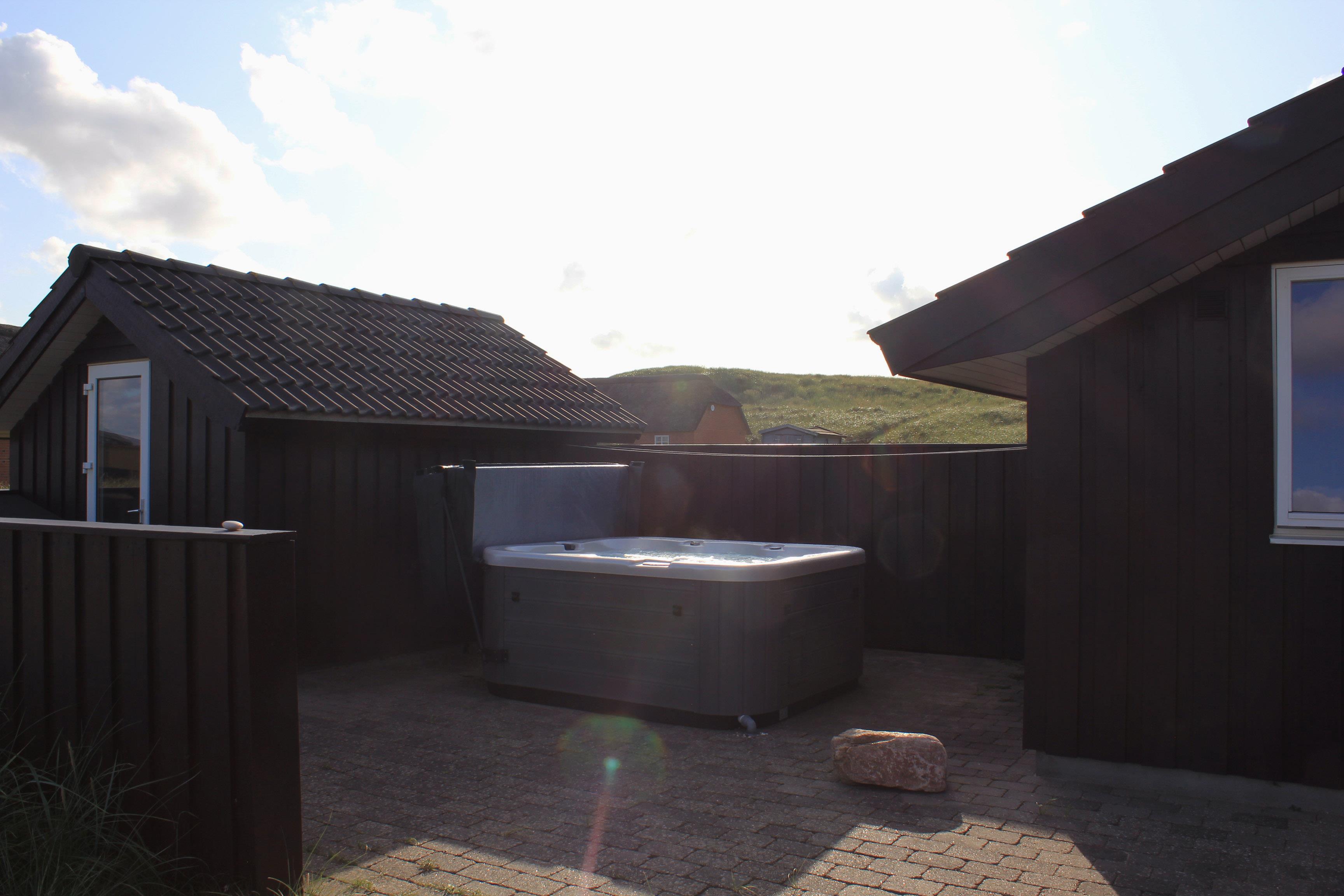 Huset har udgang til et flot terrasseanlæg. En af terrasserne er delvis overdækket og den anden er åben, men der forefindes selvfølgelig havemøbler, solvogne og grill. På terrassen er der adgang til en skøn udendørs spa, så tænk sig at sidde udenfor og nyde udsigten til klitterne og høre havets brusen i baggrunden med et dejlig glas vin og bare slappe af medens spaen sørger for at kroppen blir godt masseret igennem. Husets beliggenhed tæt på Vesterhavet gør det meget nemt at gå over klitterne og straks være nede på stranden, som hver eneste dag uanset årstid giver en ny og dejlig oplevelse. Eller hvad med at gå op på klitten ved aftenstide og sidde og nyde den flotte solnedgang over Vesterhavet. Et absolut kvalitetshus som er perfekt uanset hvilken årstid i ønsker at holde ferie.