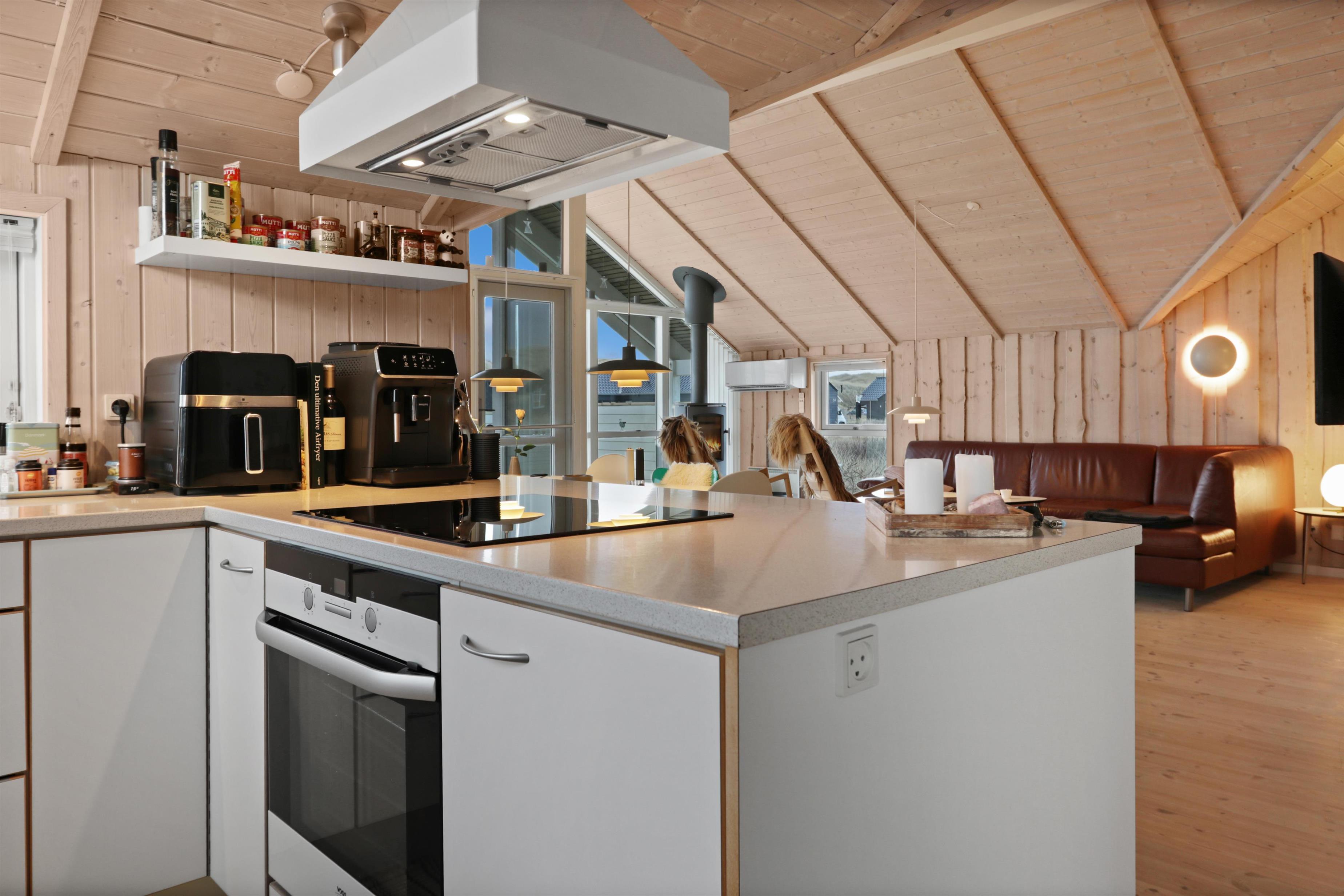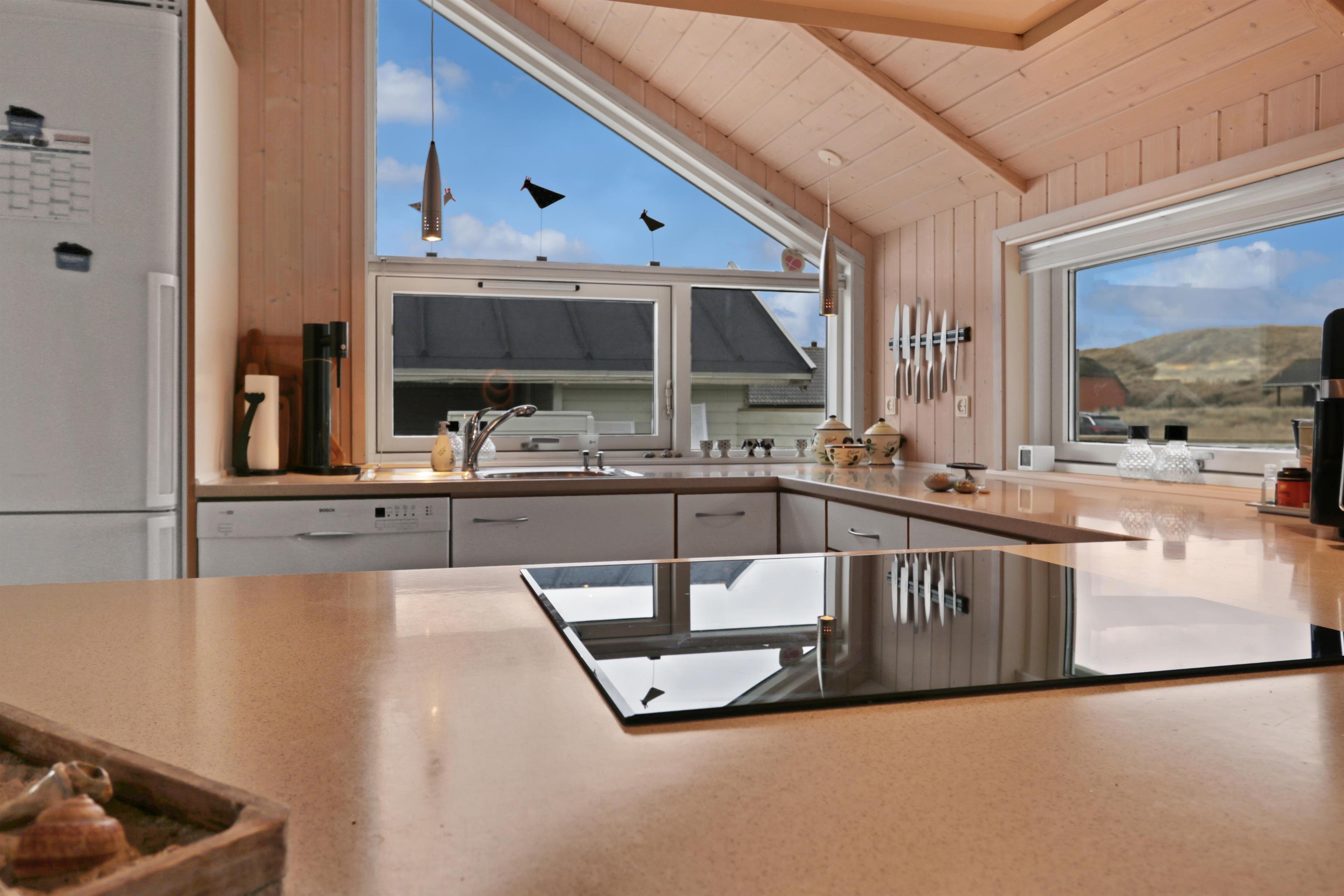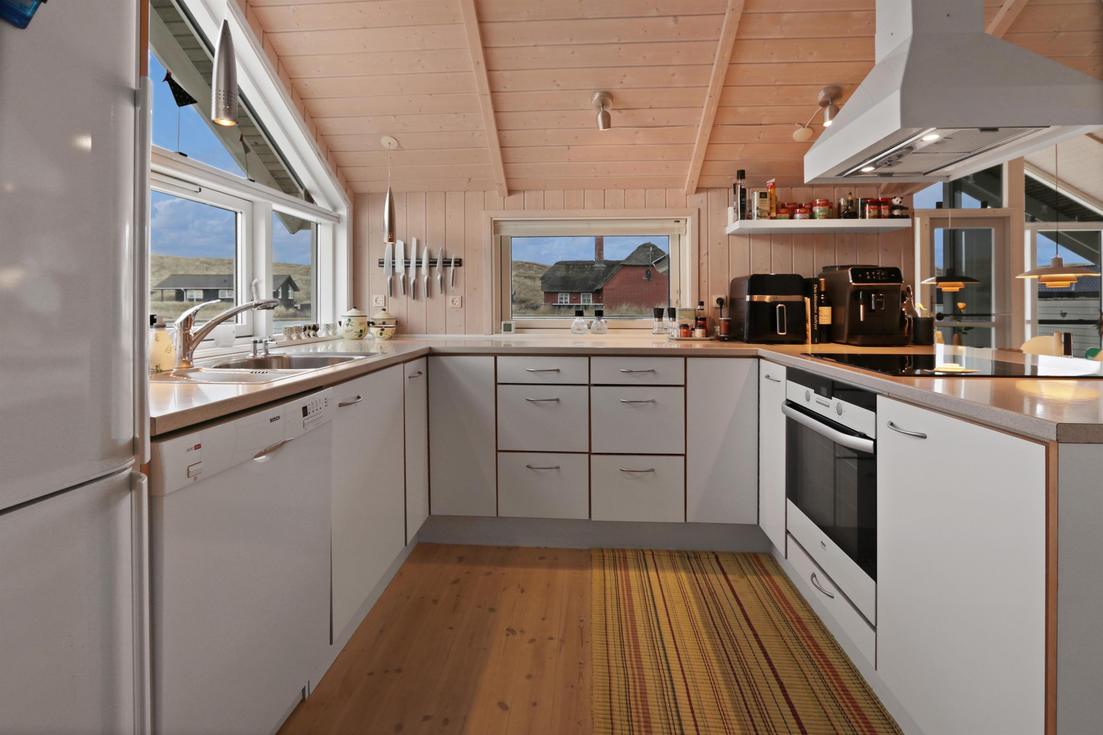 Køkkenet er veludstyret med alt, hvad feriekokken har brug for – herunder opvaskemaskine, glaskeramisk komfur og mikroovn.