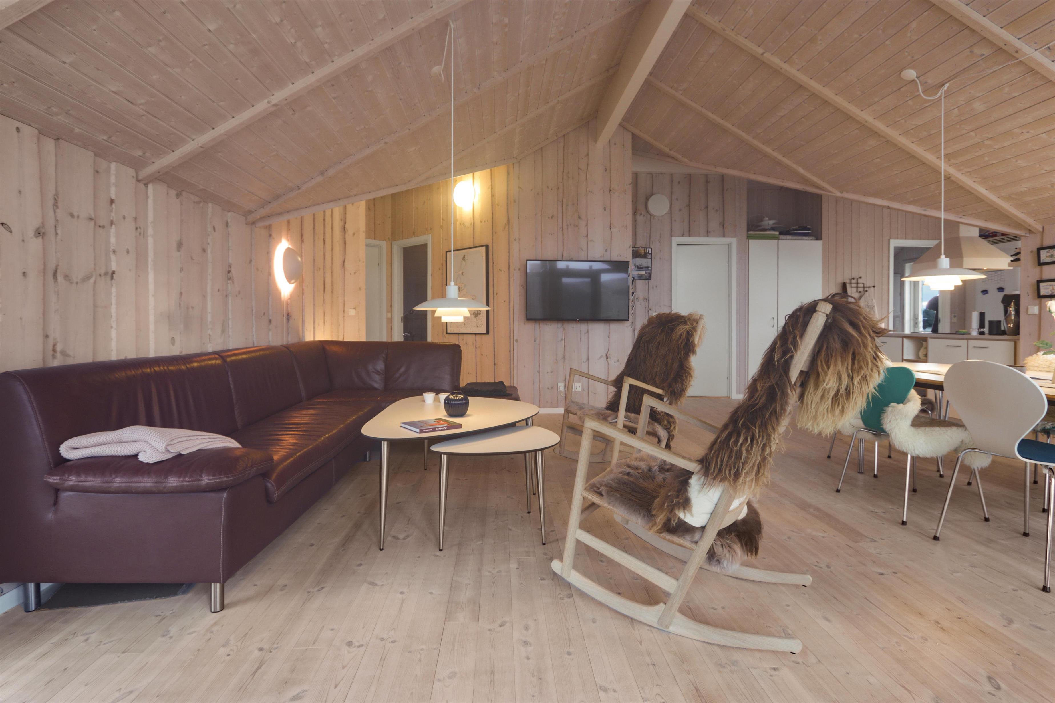 Det åbne køkken-alrum fungerer som husets naturlige samlingspunkt. Her er der plads til både hyggelige måltider og afslappede stunder foran brændeovnen. Stuen er indrettet med komfortable læder- og polstermøbler, spiseplads og TV med Chromecast, så I nemt kan streame jeres yndlingsprogrammer. En moderne varmepumpe og brændeovn sikrer behagelig varme året rundt.