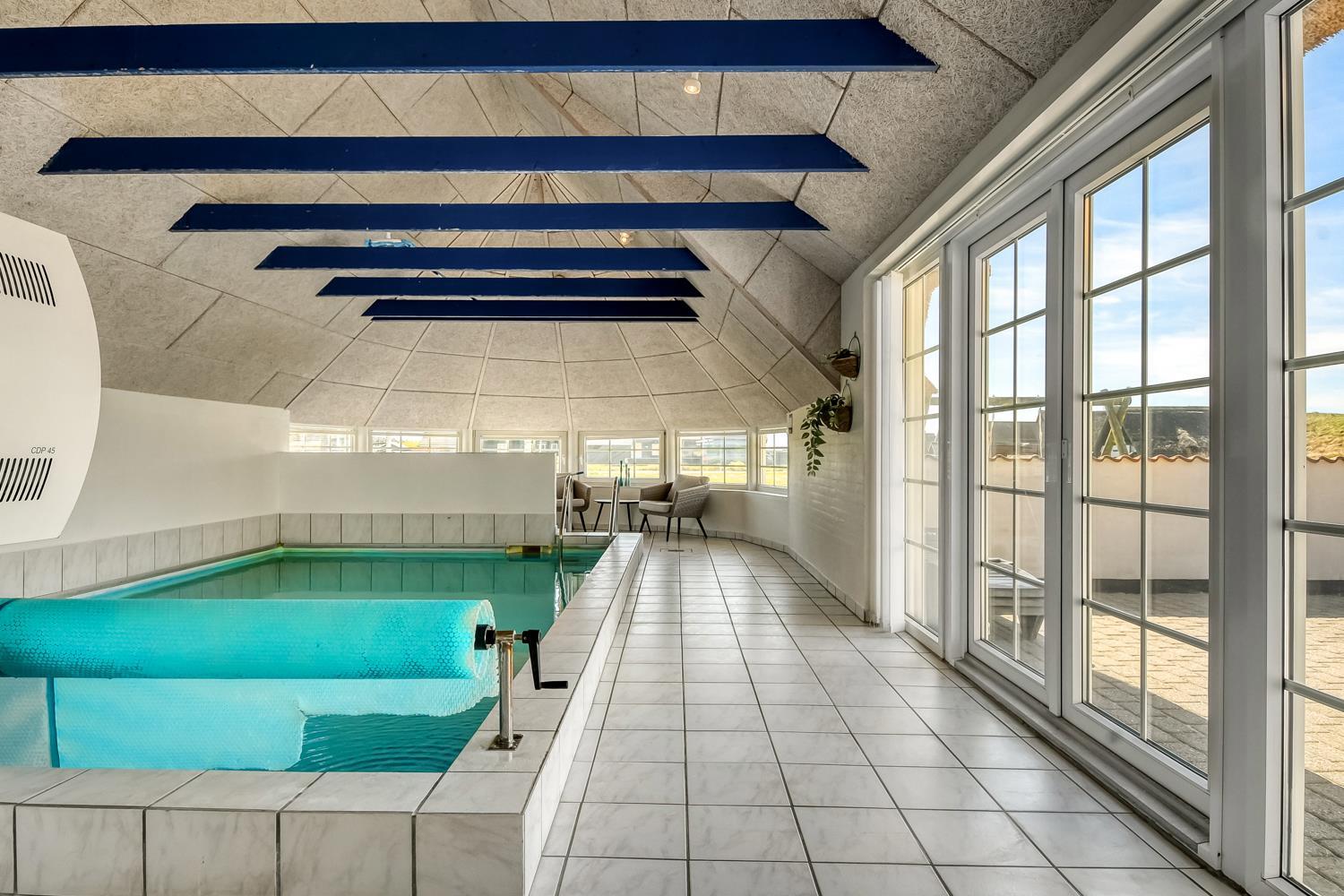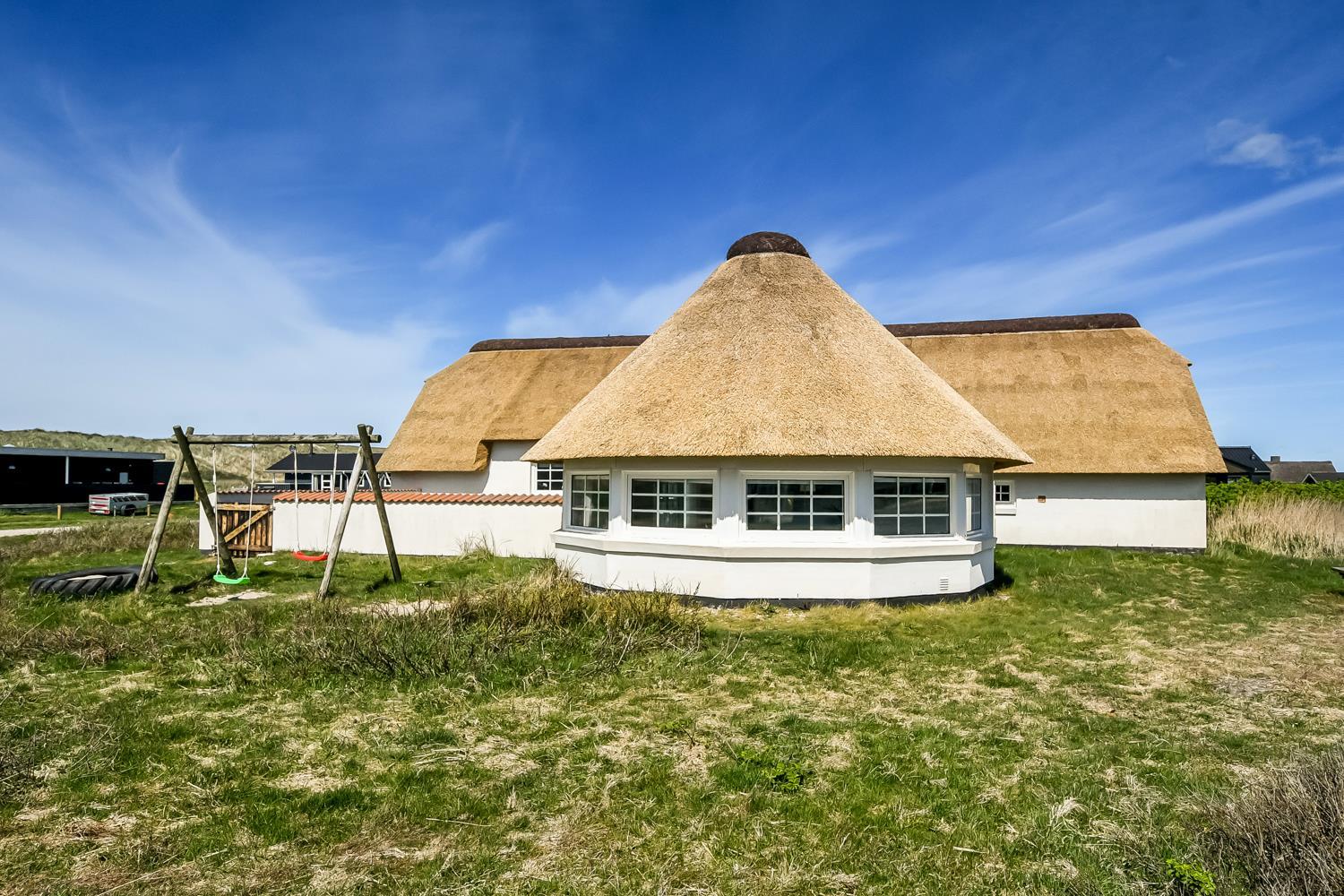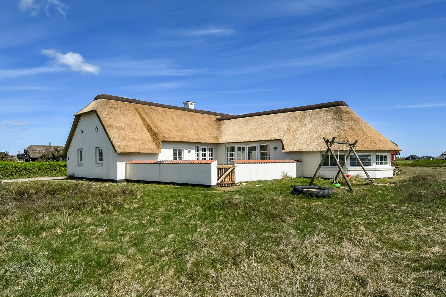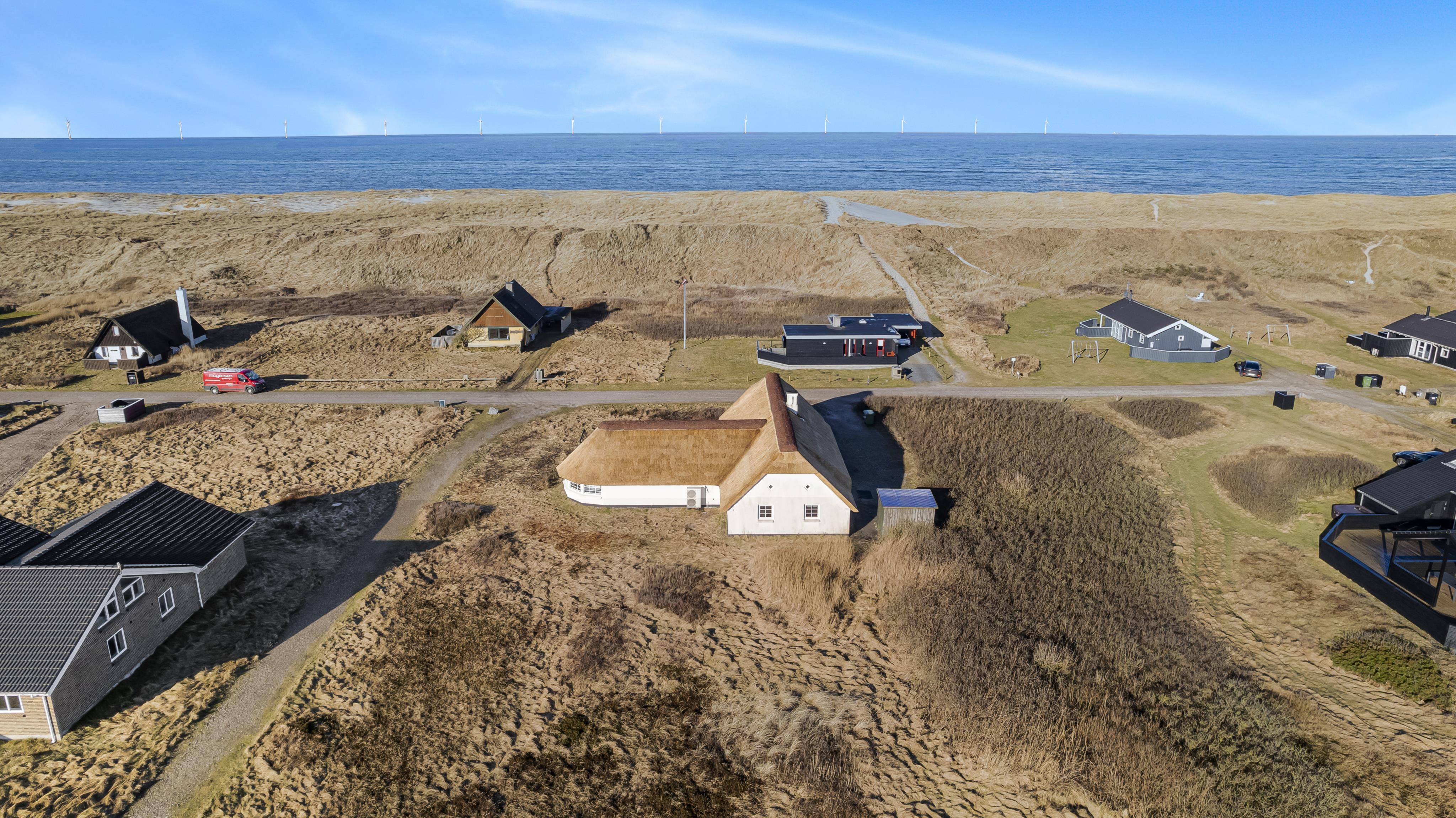 Pænt stråtækt stenhus med Wi-fi og halvcirkelformet poolrum med spa, sauna. Unikt beliggende, moderne feriehus med alle tænkelige faciliteter kun 100 m. til Vesterhavet. Nyd husets mange muligheder eller gå en tur ved Vesterhavet.