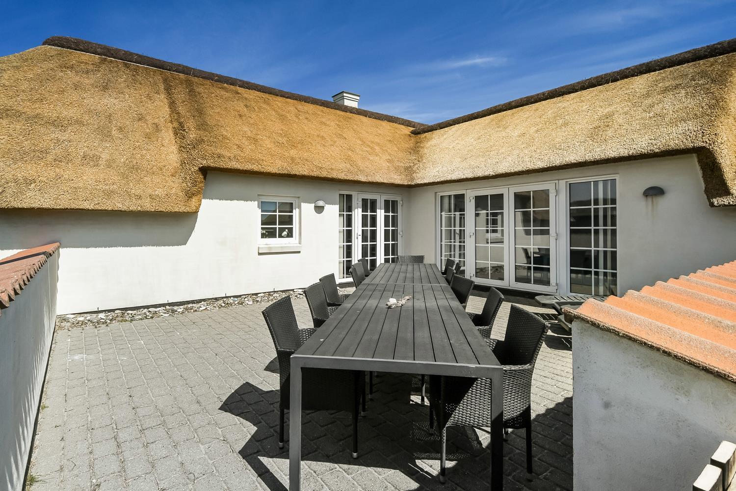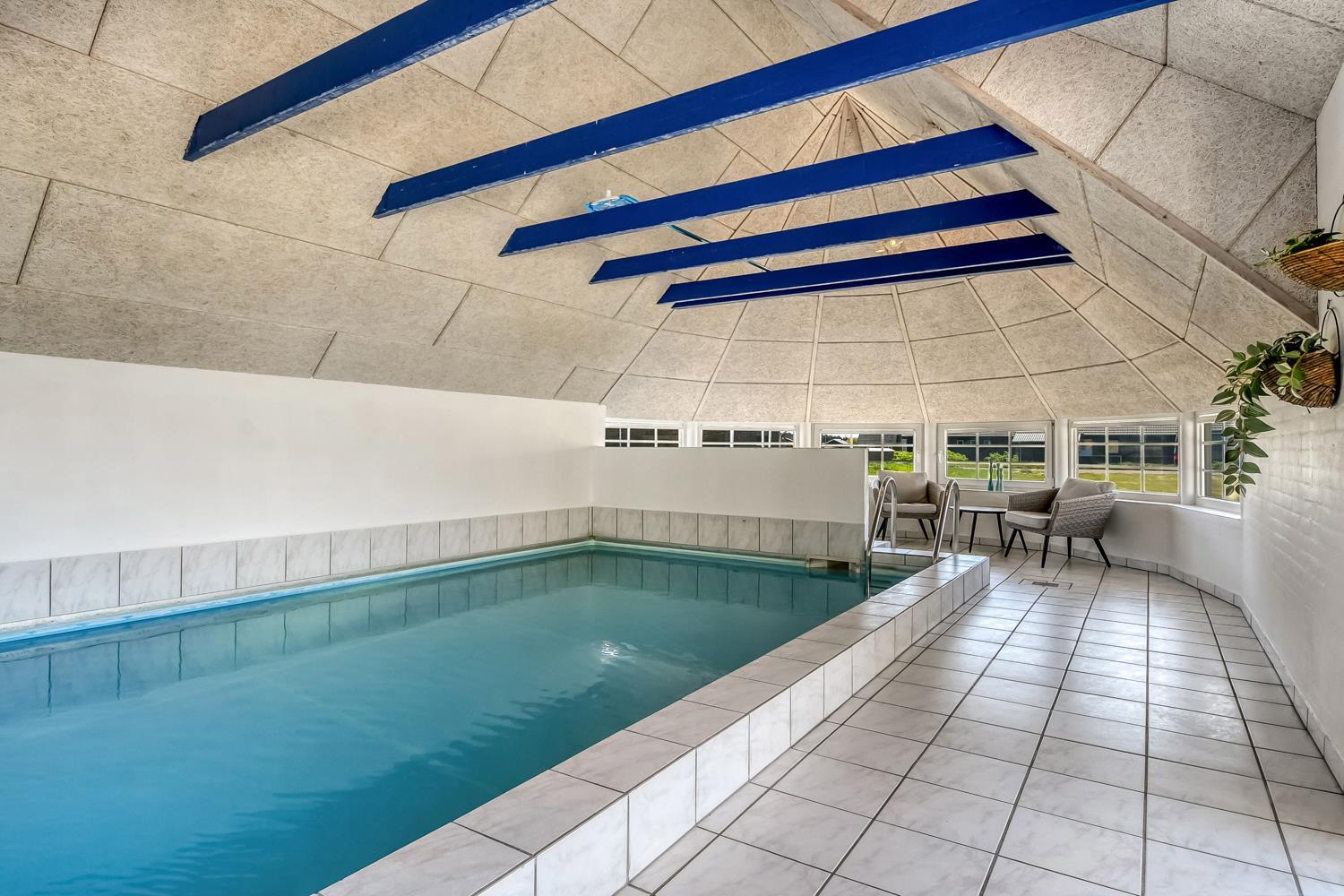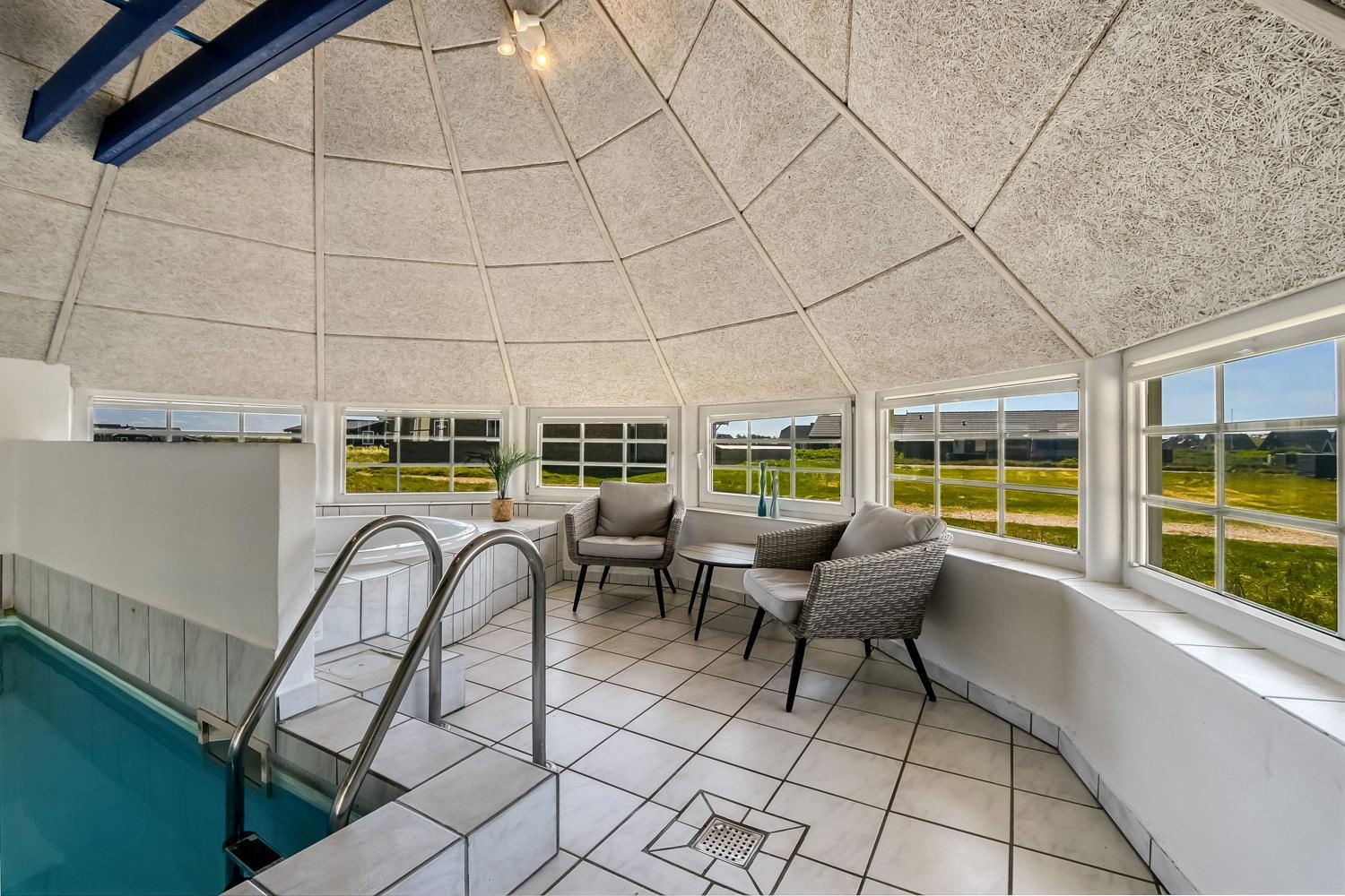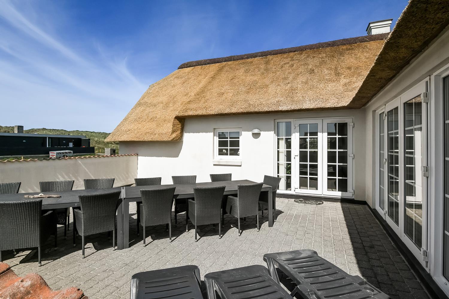 Pænt stråtækt stenhus med Wi-fi og halvcirkelformet poolrum med spa, sauna. Unikt beliggende, moderne feriehus med alle tænkelige faciliteter kun 100 m. til Vesterhavet. Nyd husets mange muligheder eller gå en tur ved Vesterhavet.