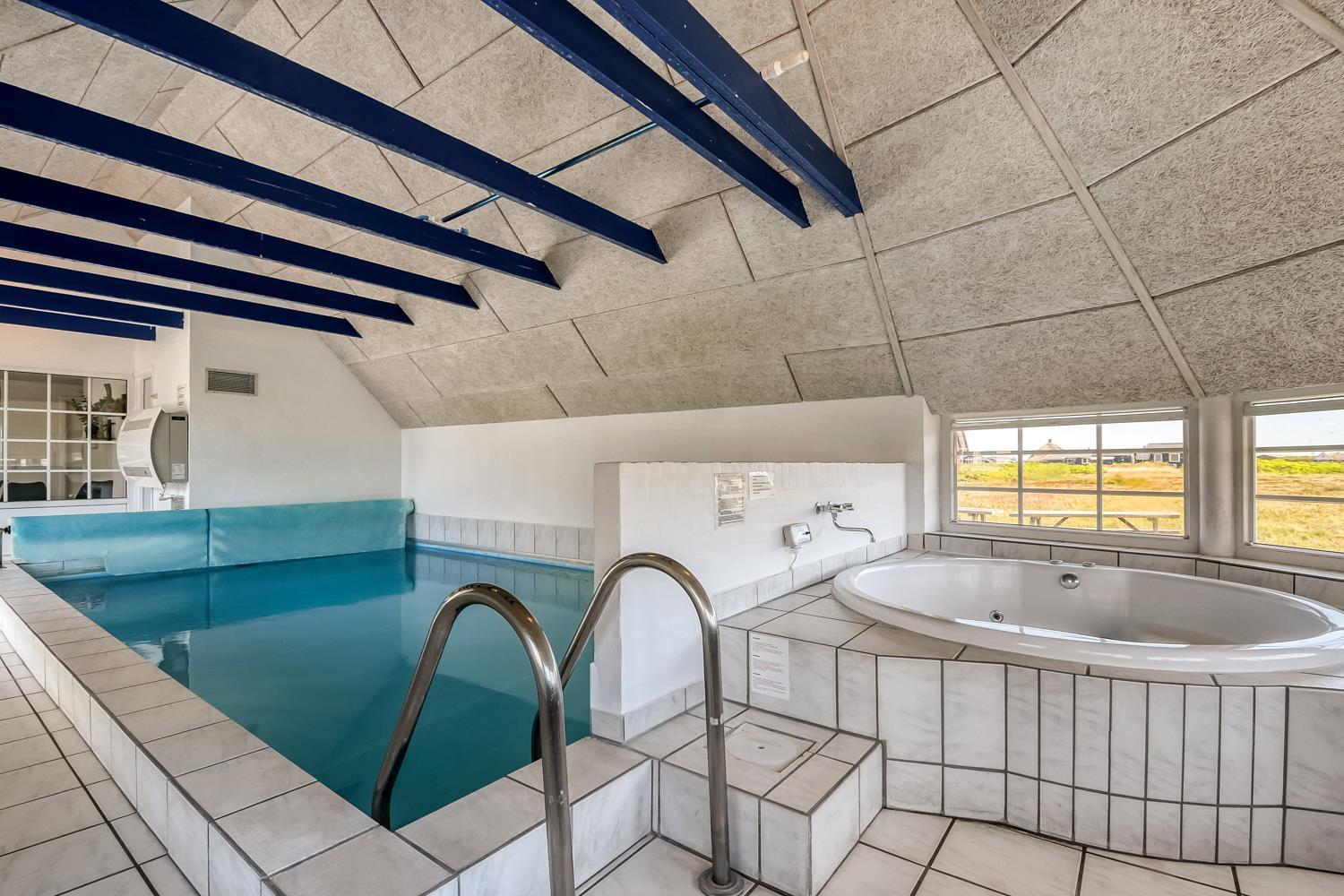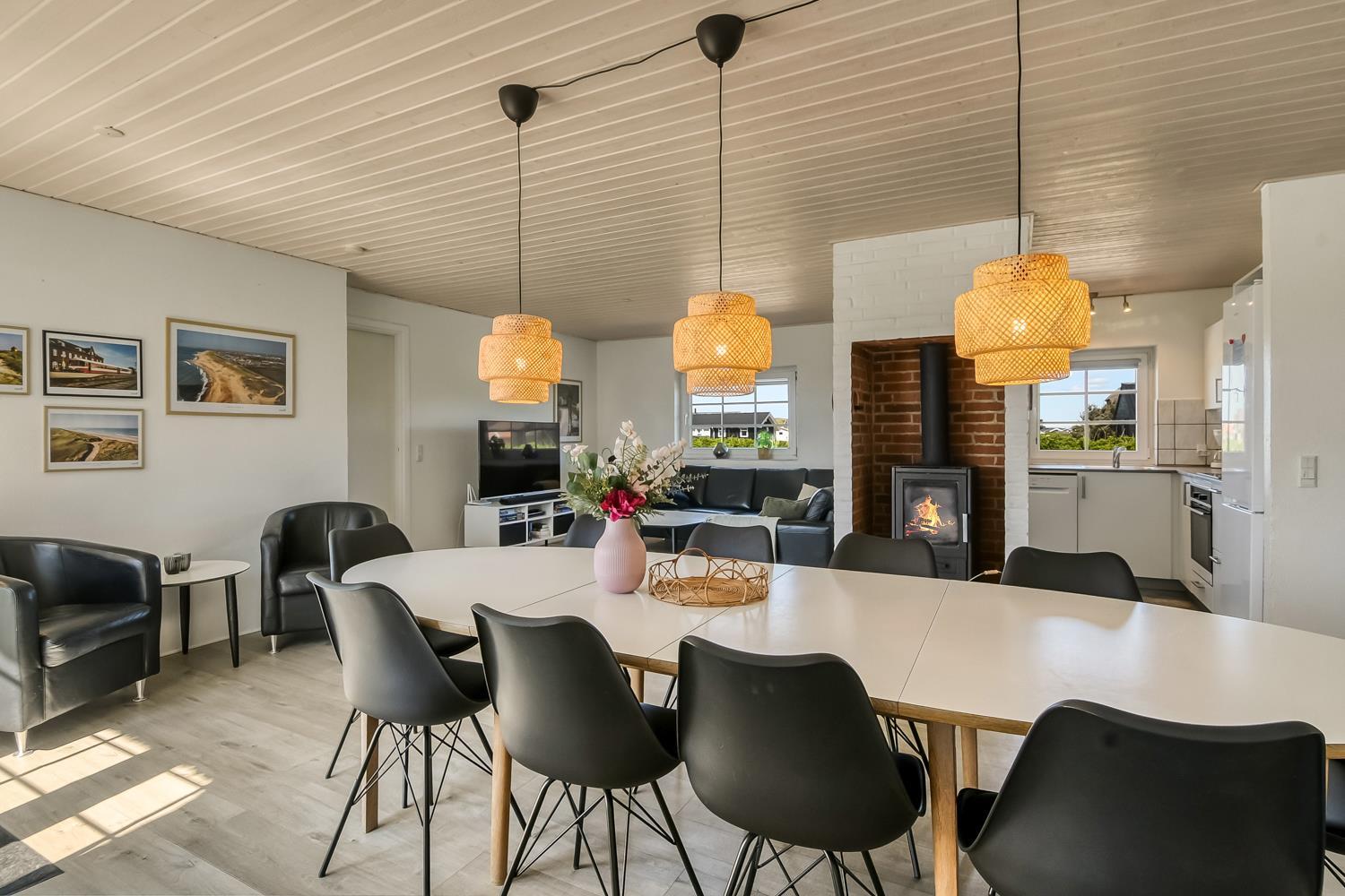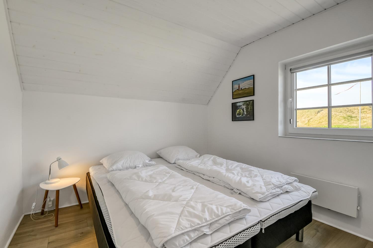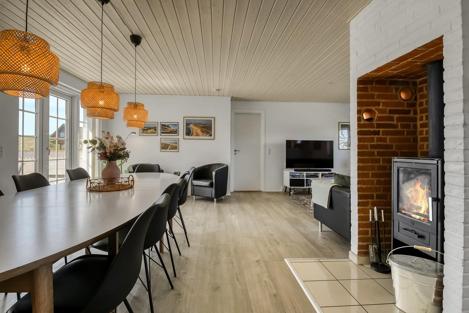 Huset er 199 m2 stort og har 6 dejlige soverum (1DS, 1DS, 1DS, 1DS, 2ES, 2ES). I de 4 værelser med dobbeltseng er der TV med tyske og danske kanaler. I hjertet af huset findes et veludstyret køkken/alrum med alt i hårde hvidevarer, keramiske kogeplader, indbygningsovn, emhætte, opvaskemaskine, mikroovn og køleskab med fryseboks. Nyd maden ved spisebordet, kig ud ad vinduet og se de store høje klitter direkte ved Vesterhavet eller slap af i de bløde kvalitetsmøbler. Se TV på dansk og tysk på husets fladskærm der har fuld Via sat pakke. Der er også radio/DVD. Udgang fra opholdsstuen til husets delvis indhegnede terrasse. Der er lagt et flot, hårdt gulv i både opholds- og soverum. Skulle det blive for koldt, eller skal stemningen blusses op, sætter man blot gang i husets brændeovn, hvor flammerne og den intensive varme kan nydes. Husets wellness pool afdeling rummer også spabad og sauna. Poolen er ca. 25 m2. 3 badeværelser, med toilet, bruser, håndvask samt gulvvarme. Vaskemaskine og tørretumbler er en selvfølge og er placeret i husets entré. Nyt luft til vand anlæg gør huset særdeles energivenligt og bevirker også et billigere forbrug. Barnestol er i huset. Max. 2 husdyr er tilladt. Ikke rygerhus.