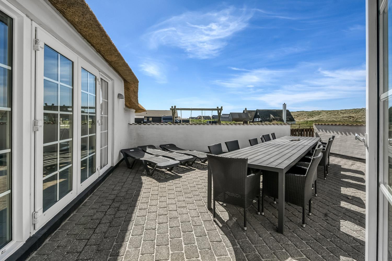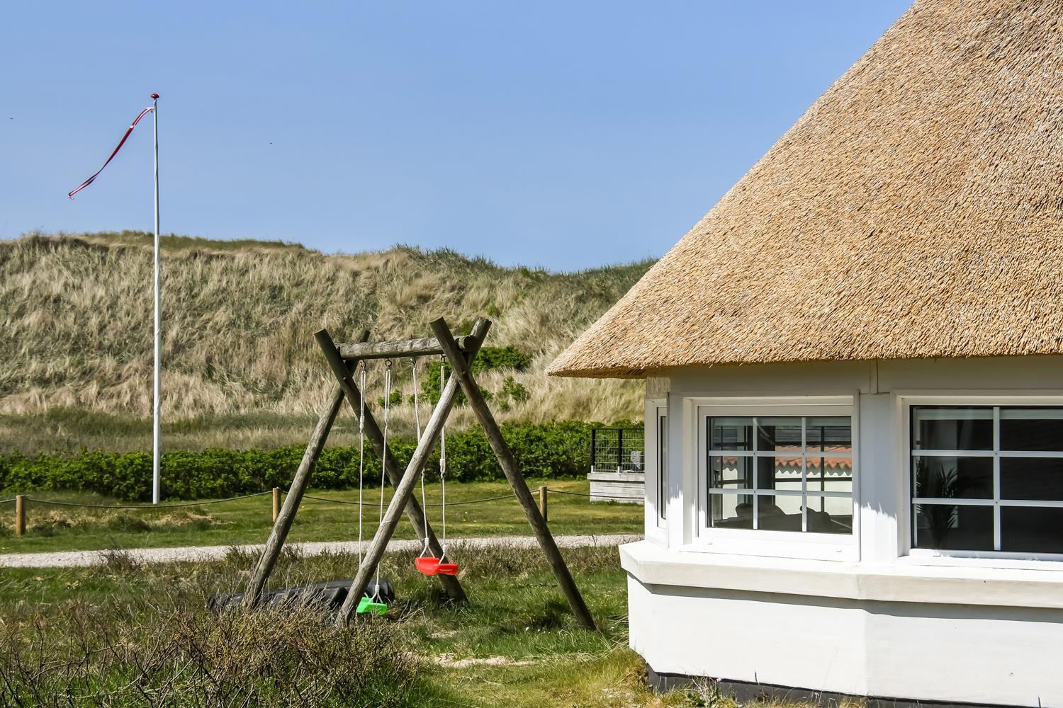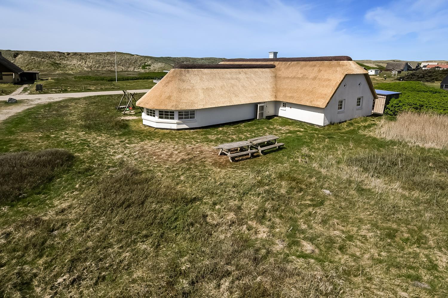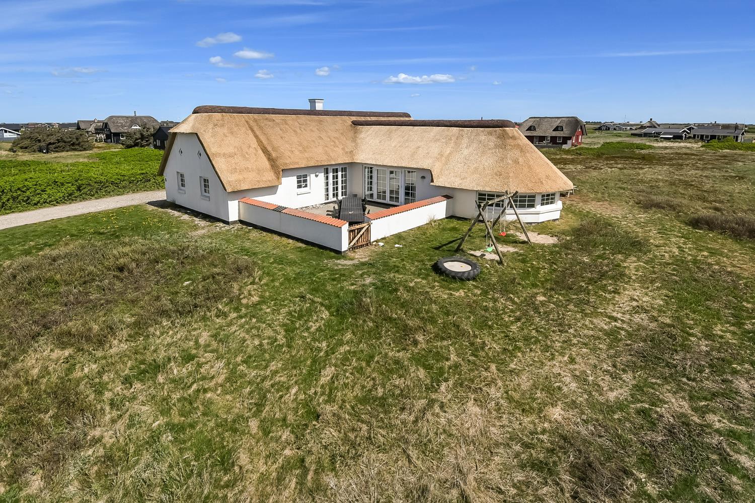 Feriehuset er beliggende på en 2.500 m2 stor klitgrund kun 100 meter fra Vesterhavet. Delvis indhegnet terrasse med borde/bænkesæt, solvogne og grill. Ideelt for både børn og husdyr. Nyd solen, hinanden eller en god grillaften. Gå en tur med hunden i det rolige feriehusområde, henover de høje klitter og straks derefter åbenbarer Vesterhavet sig. Et besøg værd på alle årstider. På den store grund er der gynger til børnene. Huset ligger 800 meter fra dagligvarebutikker. Indenfor kort køreafstand nås både den aktive handelsby i Lemvig med flere specialbutikker eller den unikke fiskerby Thyborøn som udover den aktive fiskerihavn også byder på badestrand og op til flere aktivitetstilbud, som alle er et besøg værd.