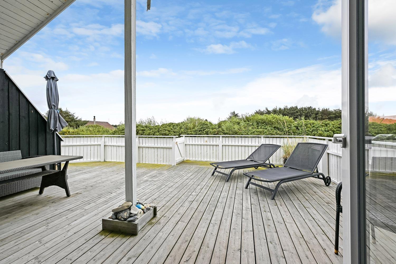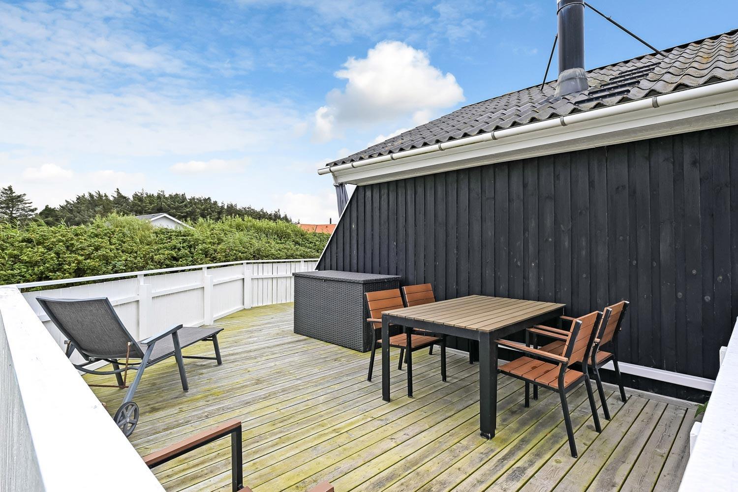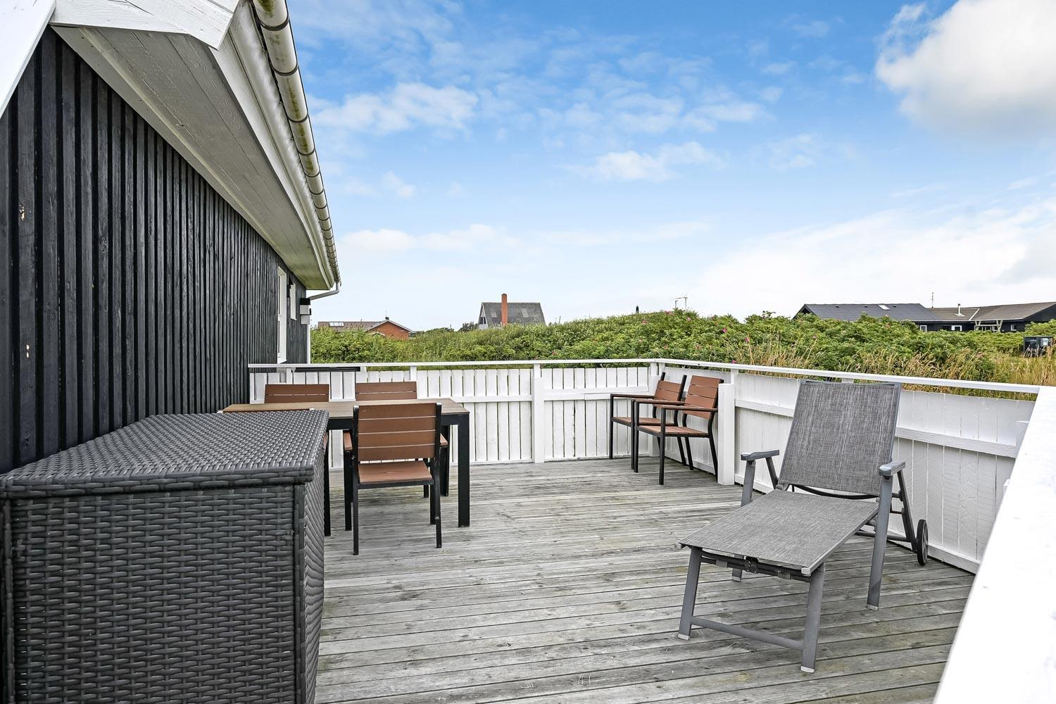 Huset ligger på en 1240 kvadratmeter stor flad naturgrund og har en sydvendt delvis overdækket terrasse med havemøbler og grill. Gæster med husdyr eller små børn kan med fordel lukke terrassen med en låge. Herudover er der også 2 solvogne til fri afbenyttelse.