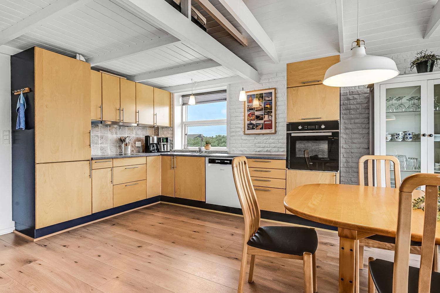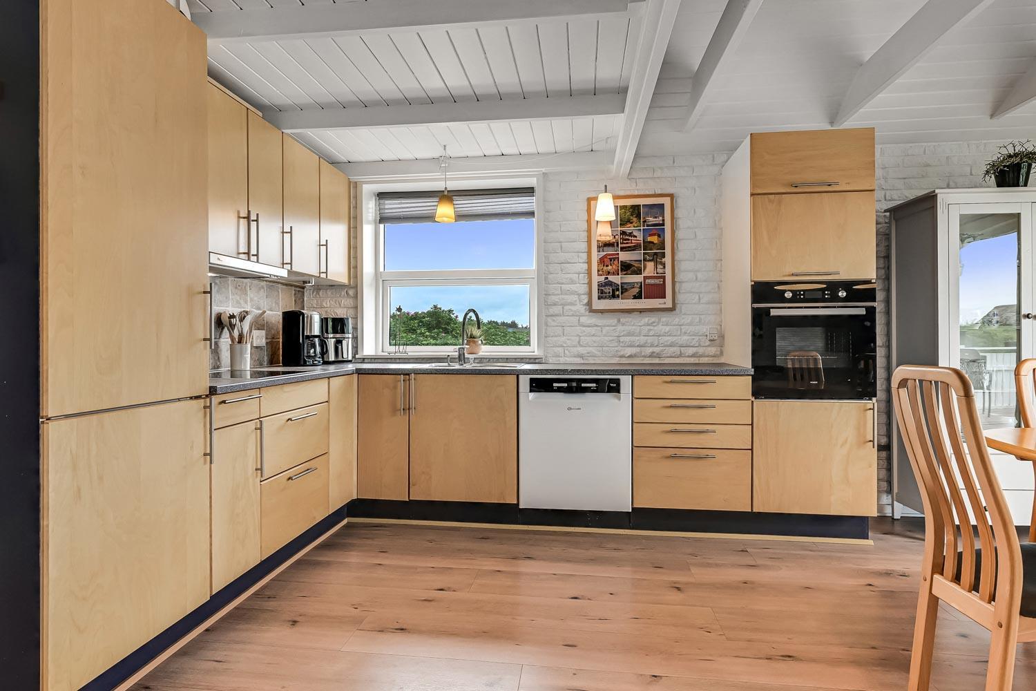 Køkkenet er åbent mod stuen og det gør det let at komme til. Her er elektrisk komfur, køleskab, mikrobølgeovn og opvaskemaskine bliver man også glad for som giver mere kvalitetstid. Angående at spare tid så er der også en vaskemaskine i huset.