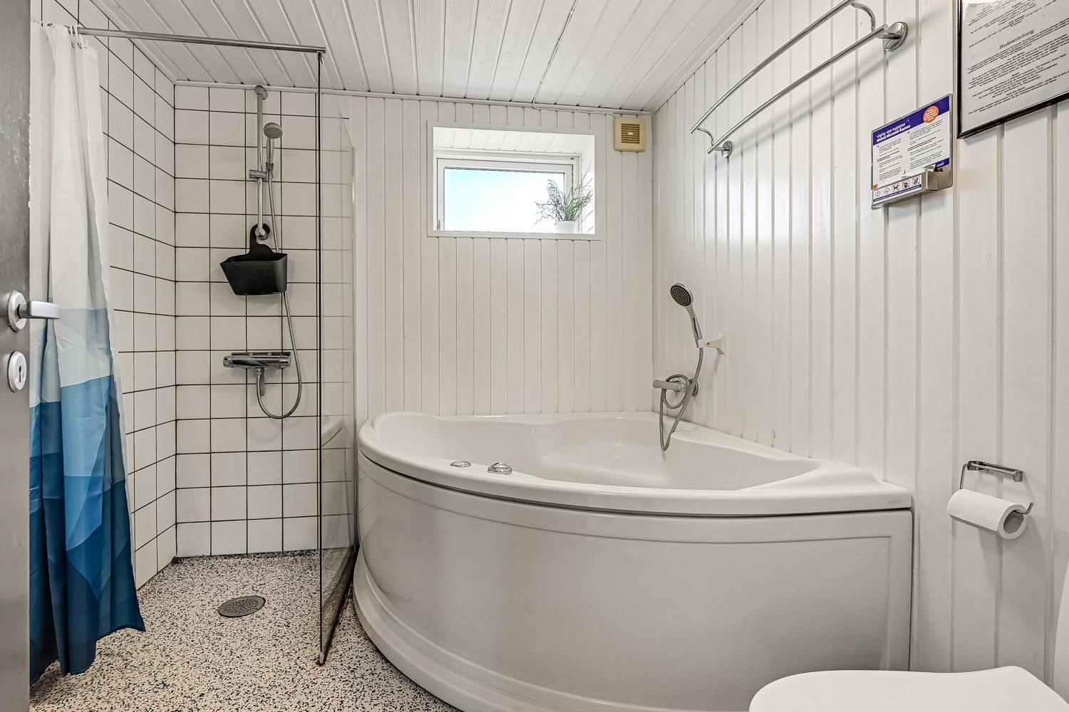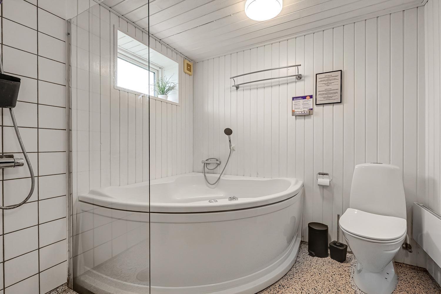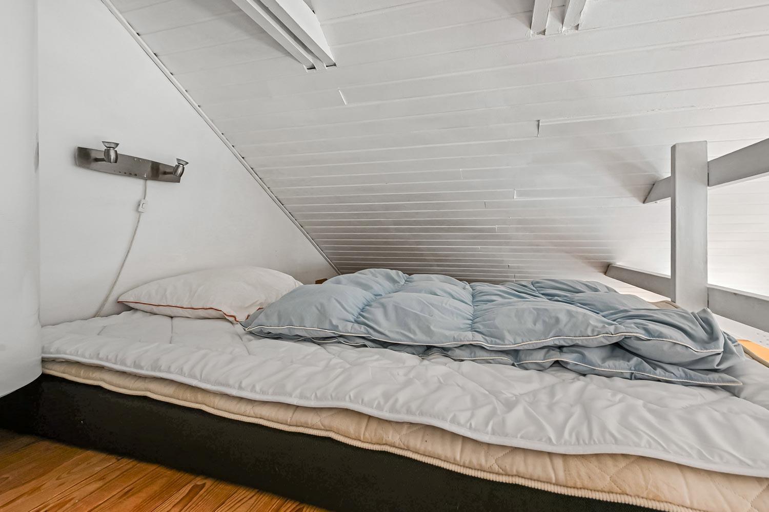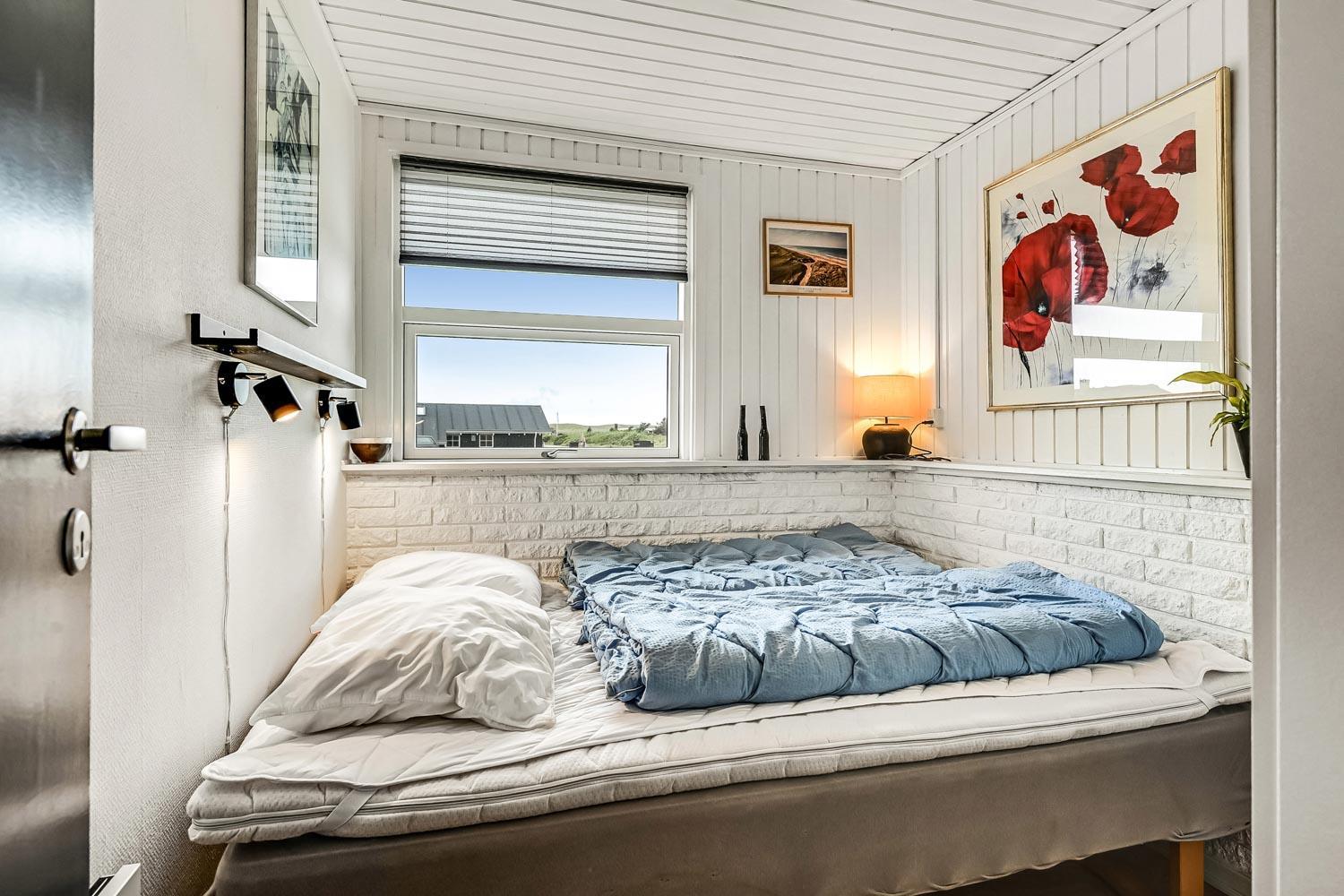 Huset er indrettet med to soveværelser - begge med en dobbeltseng. Herudover der der fra den kombinerede stue/køkken adgang til en hems med 2 sovepladser. Selve badeværelset har både spabad med bruser og hertil ovenikøbet en bruseniche. Toilet og håndvask er naturligvis standard.