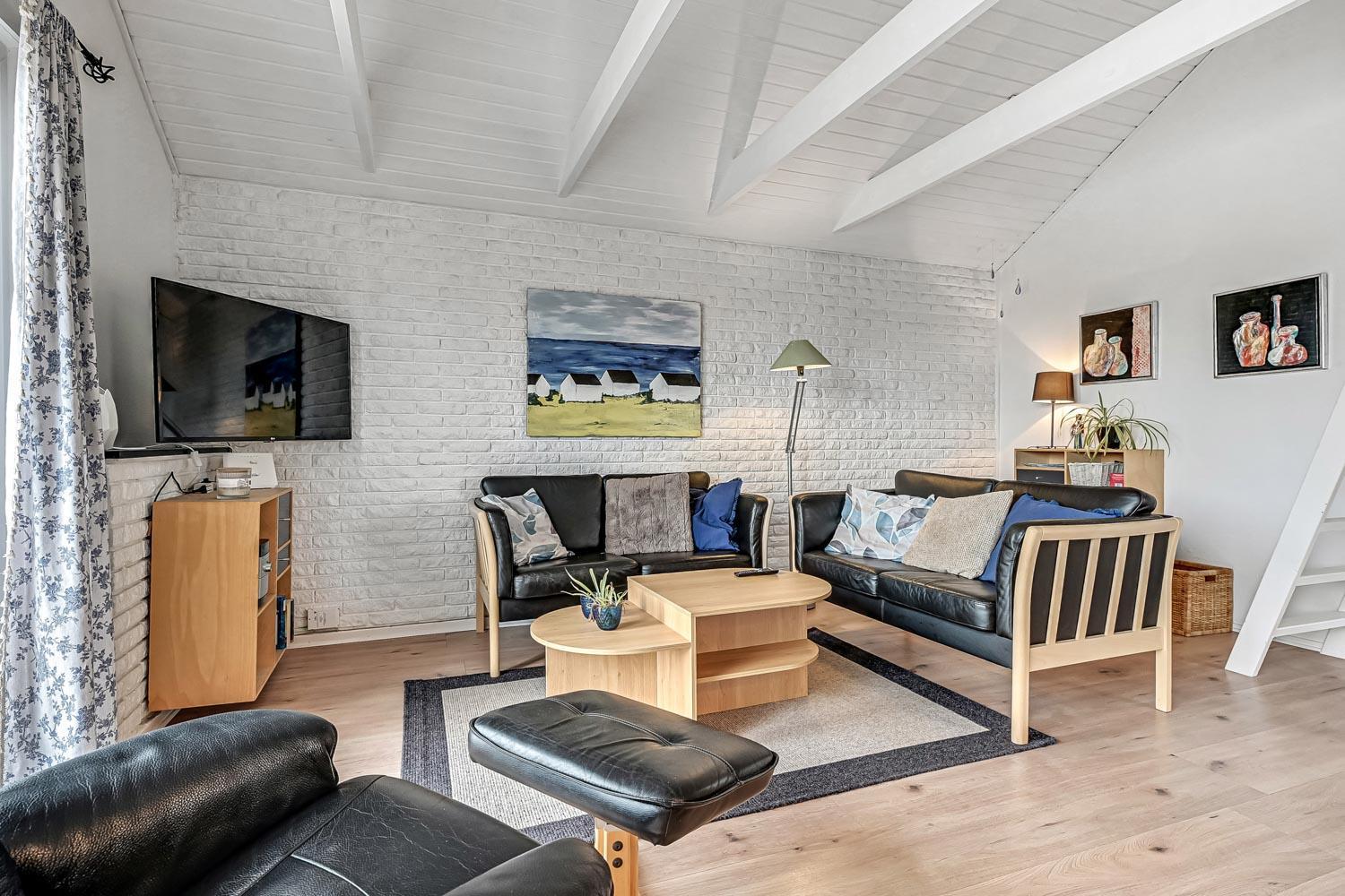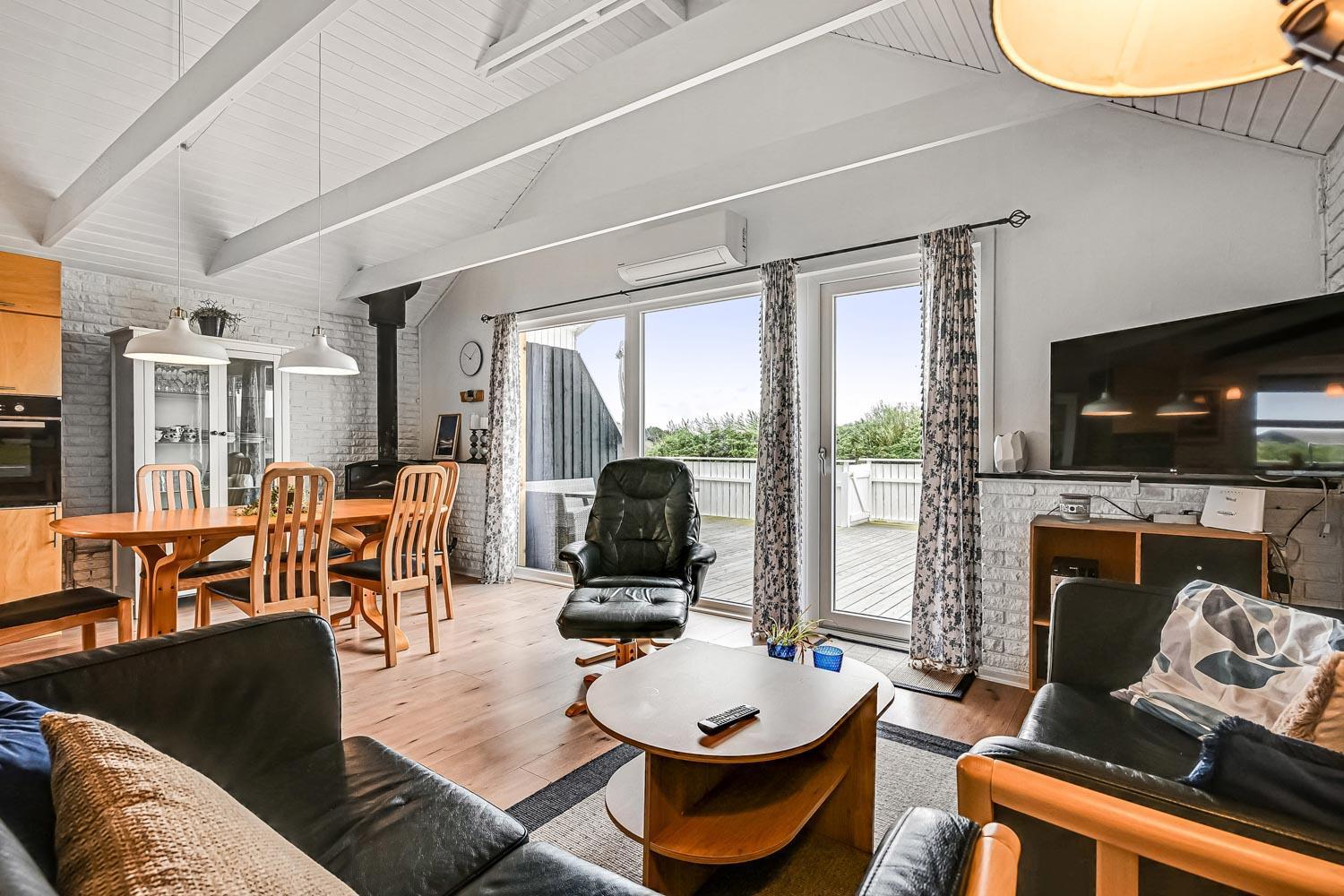Stuen og køkkenet er i samme rum, så alle kan være samlet under madlavningen eller anden hyggeaktivitet. I stuen er der brændeovn og en varmepumpe og smart-TV med chromecast. Der er kun danske tv-kanaler. Tyske tv-kanaler skal streames via privat abonnement.