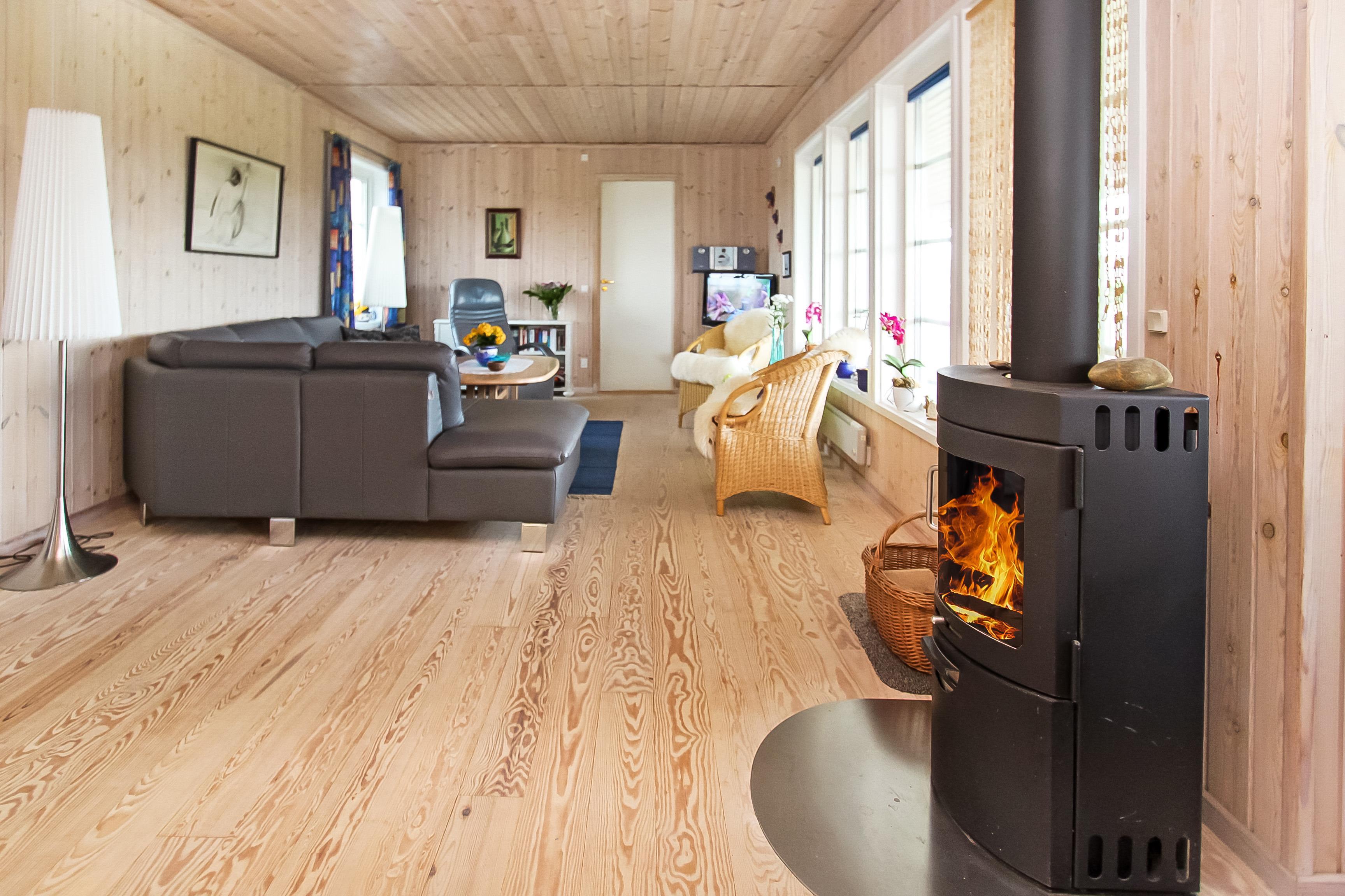 Den kombinerede stue og køkken byder på trægulve, lædermøbler, brændeovn og TV med tyske kanaler. Derudover sørger en energivenlig varmepumpe for et behageligt indeklima – og et lavere elforbrug.