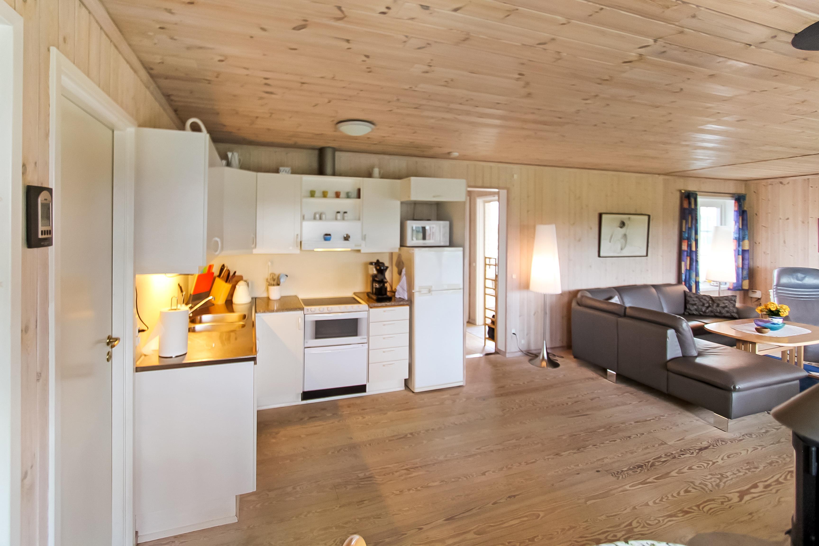 Køkkenet er praktisk og veludstyret med glaskeramisk komfur, opvaskemaskine, emhætte og mikroovn, så feriemaden er hurtigt klaret.
