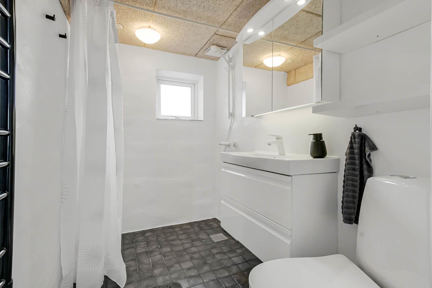 Badeværelset er indrettet med toilet, håndvask og bruser samt et flot klinkegulv samt håndklædetørrer.