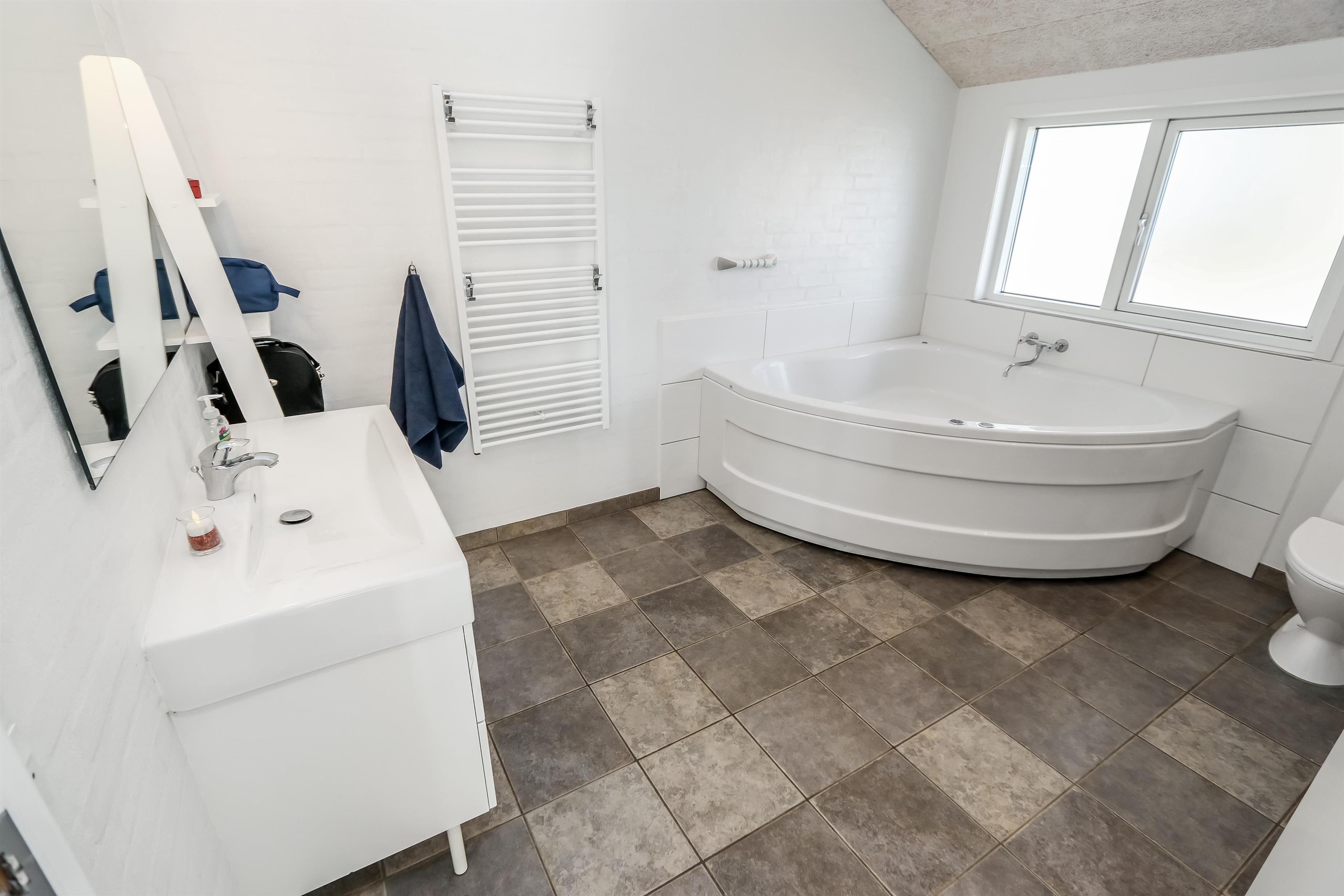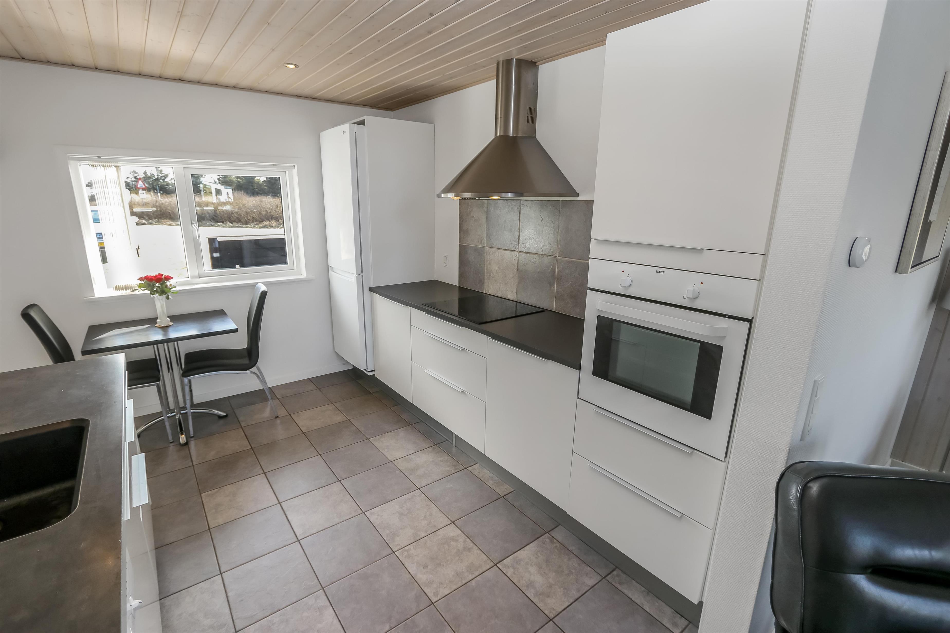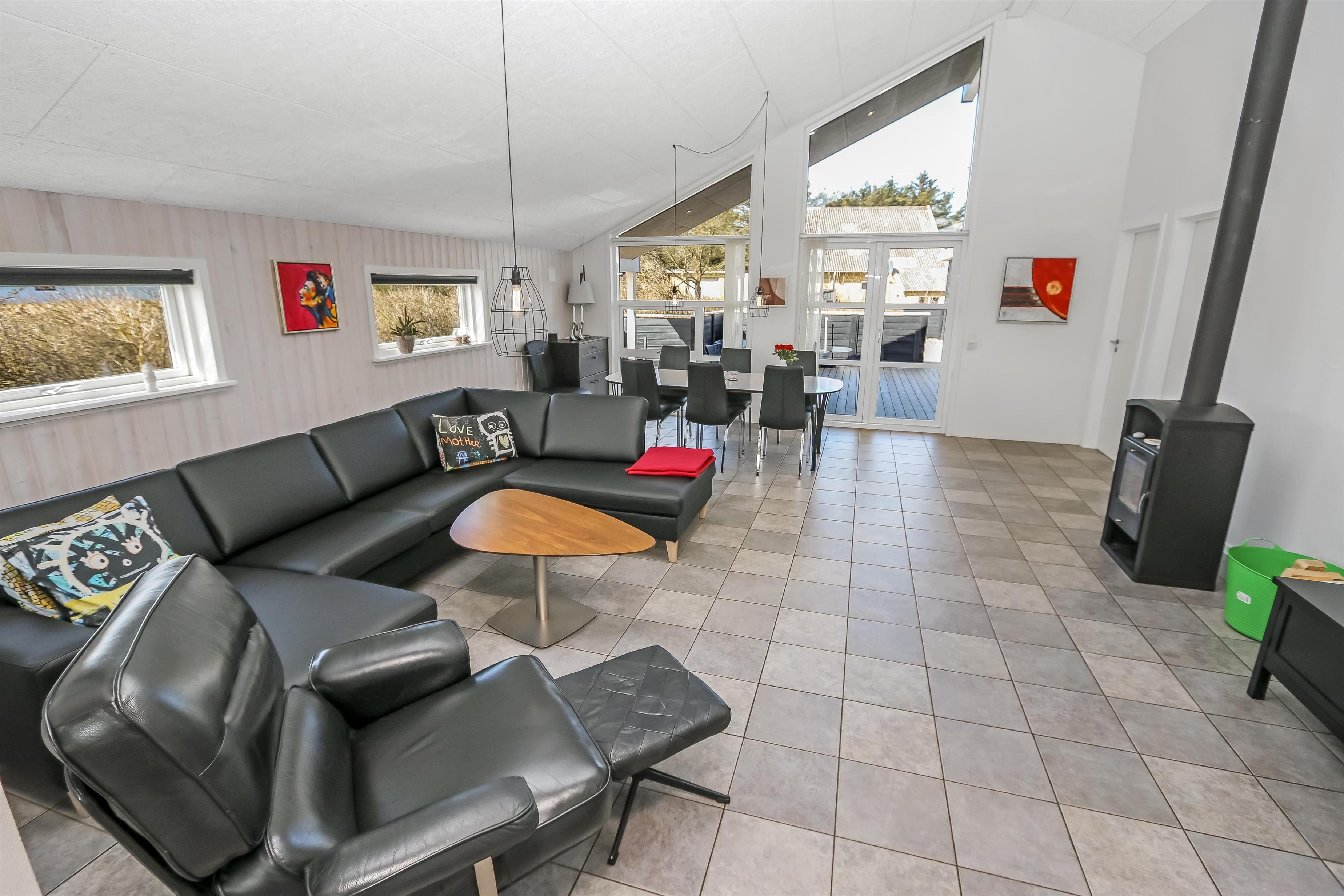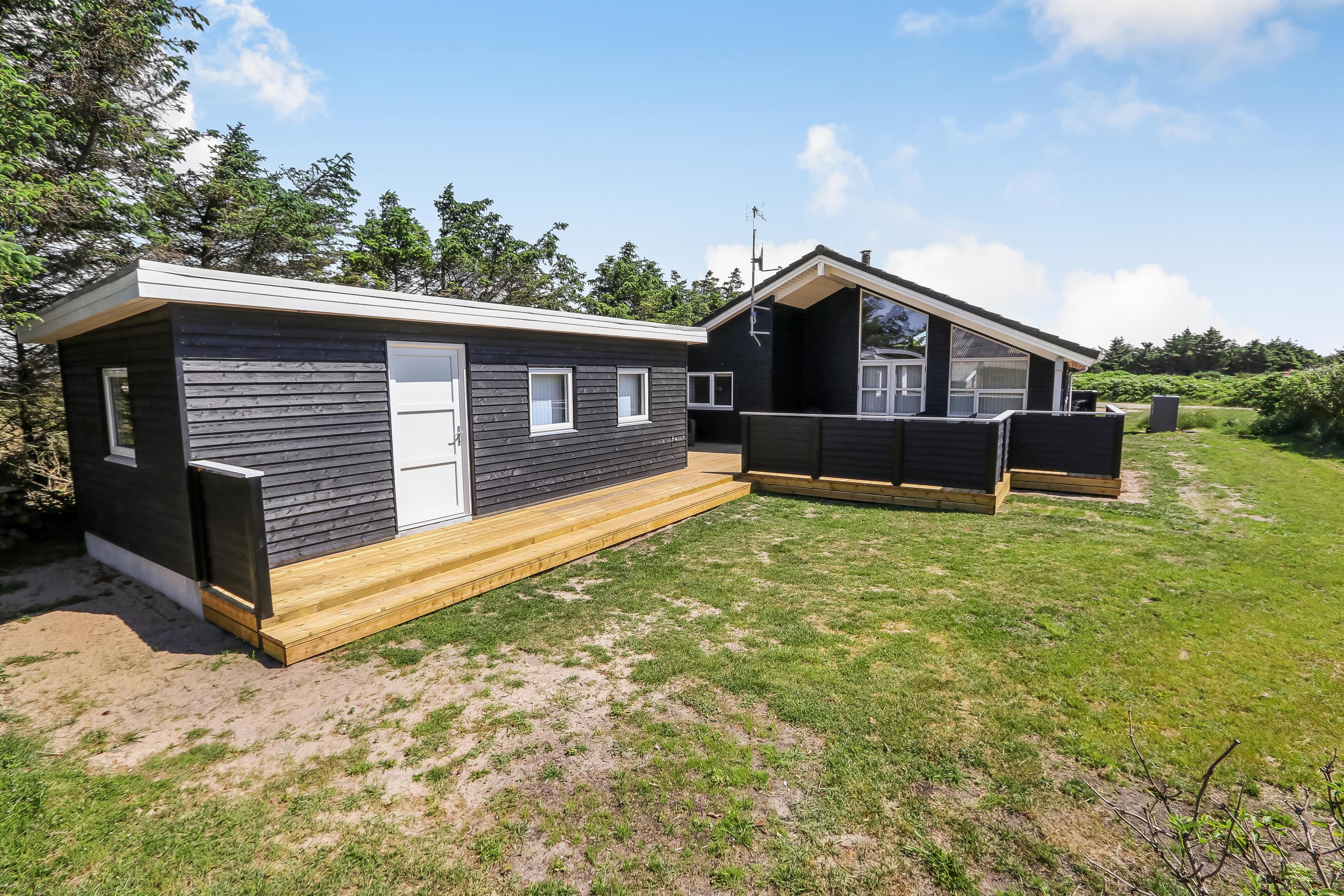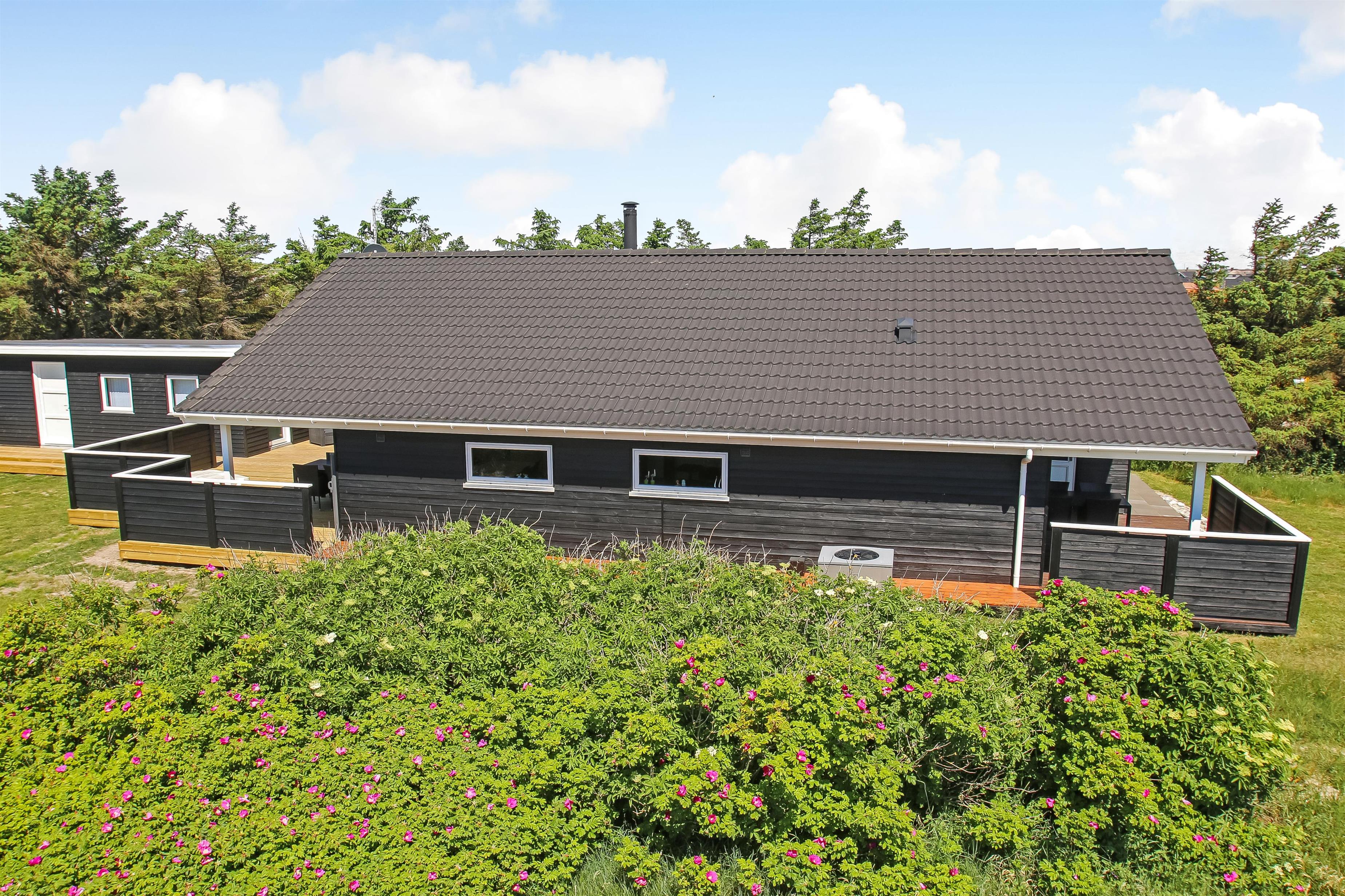 Der er en lækker stor terrasse, som er delvis overdækket. Her er der havemøbler, lounge møbler og 2 solvogne, alle med hynder til, som er i skuret i en hyndeboks. Der er også en kul Grill og grill starter. Der er også en mindre delvis overdækket terrasse foran huset. Her står morgensolen op, hvilket gør det dejligt at sidde og få morgenkaffe om sommeren. Der er kun 250 meter til Vesterhavet og den brede strand, hvor der altid er masser af plads til aktiviteter alt efter sæsonen. Man kan fiske hele året rundt og solbade om sommeren. Drageflyvning er altid muligt og de små elsker at bygge i sandet. Vandreture langs havet er også utroligt populært og her kan man se nogle af de mest fantastiske solnedgange over Vesterhavet.Dette dejlige store rummelige sommerhus ligger kun 250 meter fra Vesterhavet med dejlig sydvestvendt terrasse. Usædvanligt for området så er der højere bevoksning omkring huset - dette giver læ og gør beliggenheden idyllisk. Huset har 1 badeværelse + 1 gæstetoilet samt hele 3 soveværelser og en sovehems. Her er gratis trådløs internet. Husdyr og rygning er ikke tilladt.