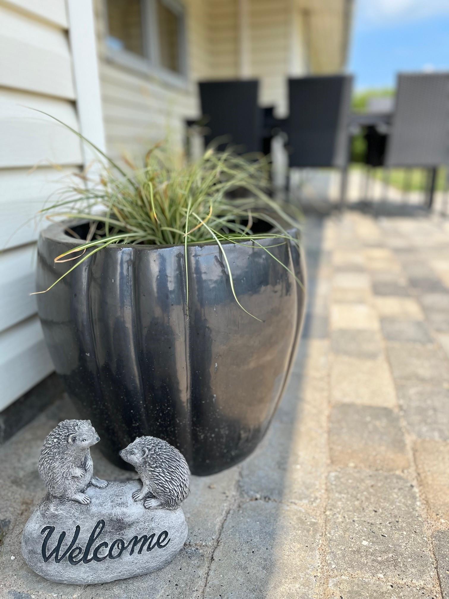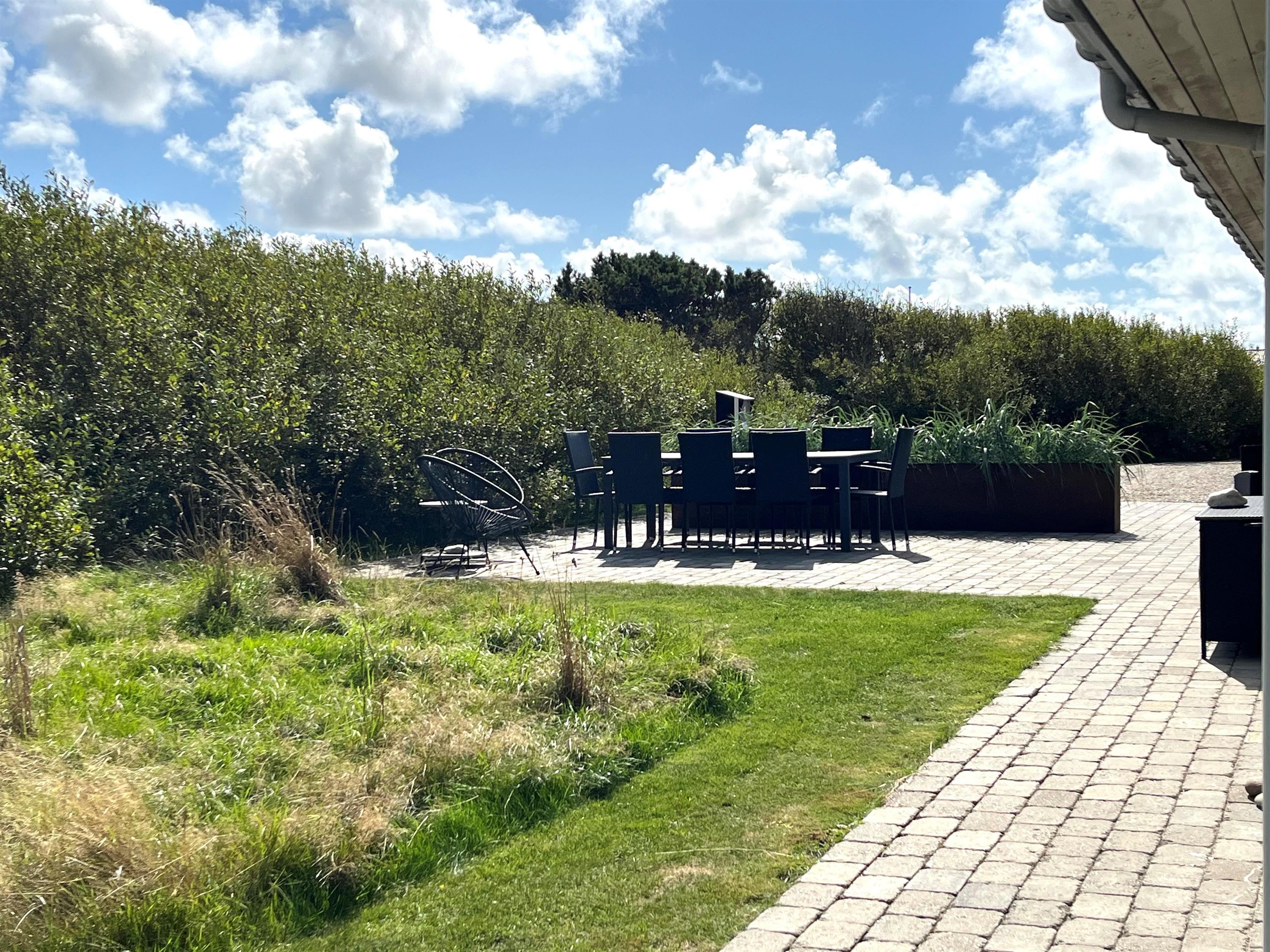 Fra huset er der udgang til et nyanlagt åbent terrasseanlæg, som er udstyret med havemøbler, solvogne og grill. Til børnene er der gynge, sandkasse og et legehus til rådighed.