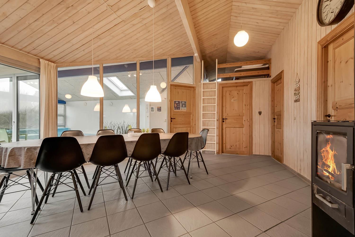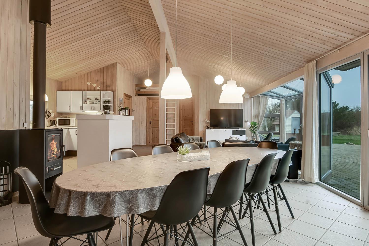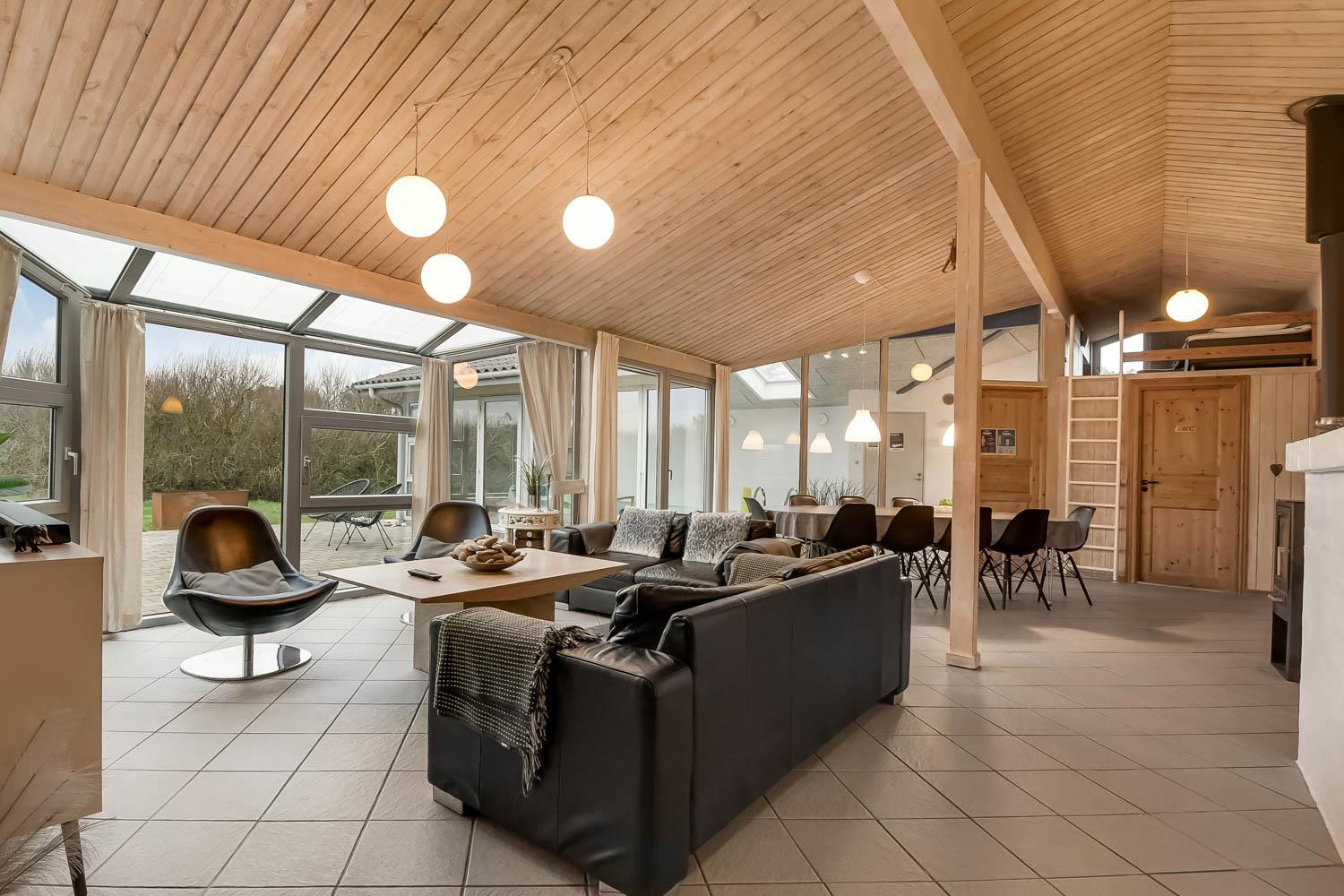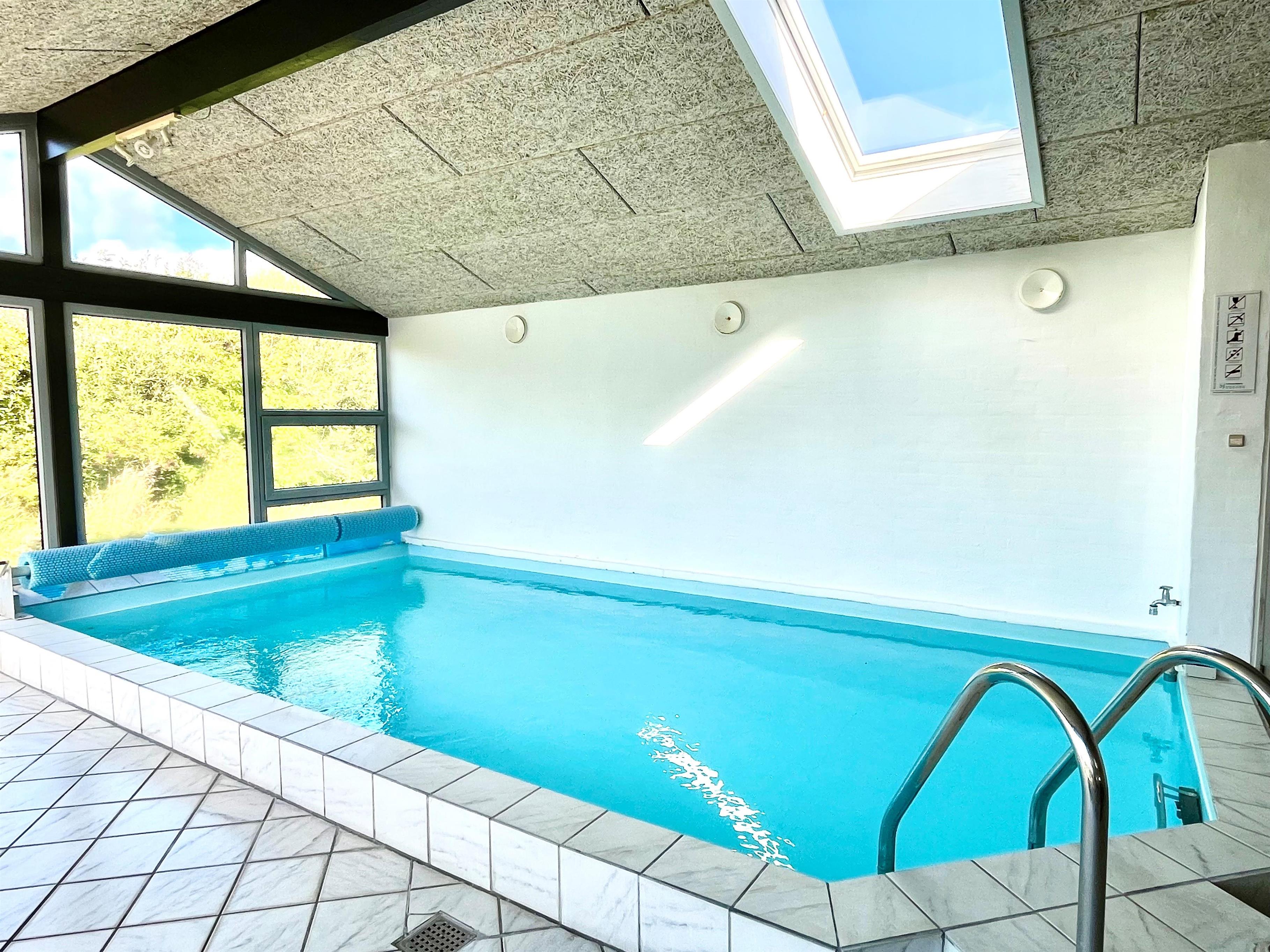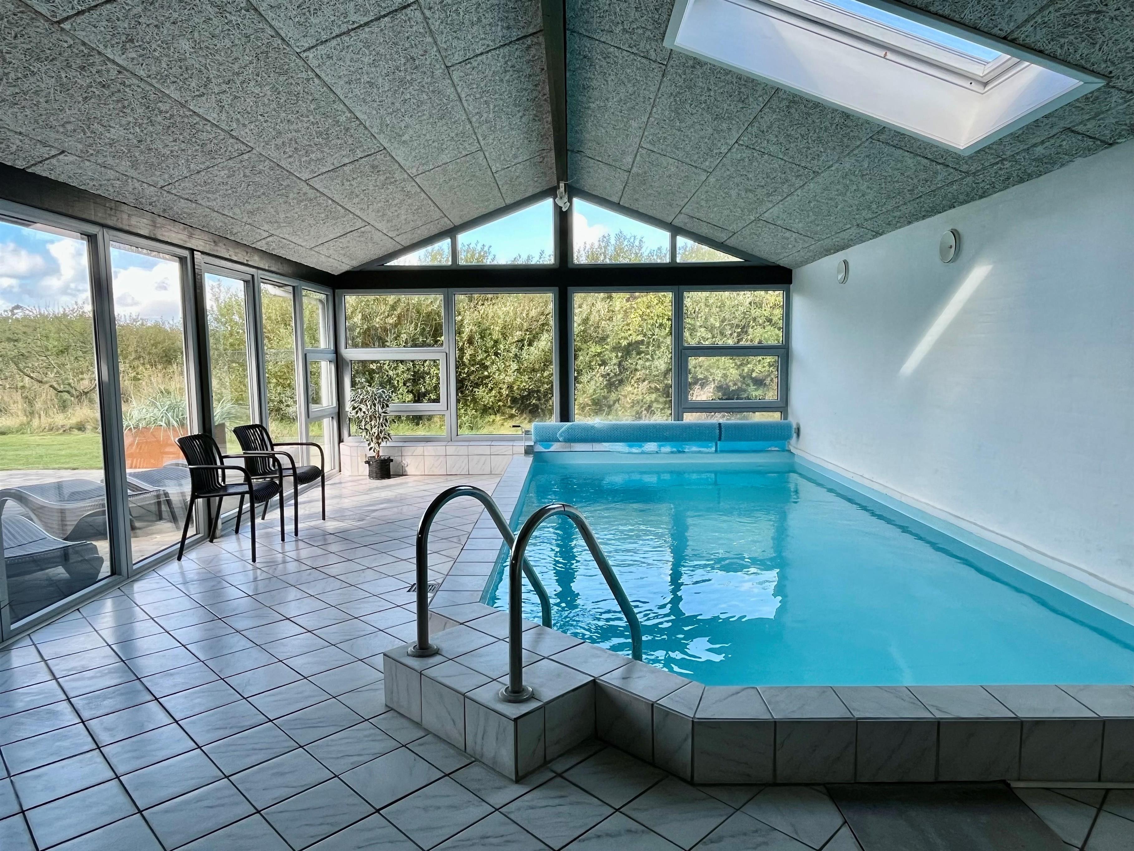 Huset er rigtig godt egnet, også til 2 familier. Et dejligt hus som kan byde på mange gode oplevelser både ude og inde. Gratis fiber internetadgang (høj hastighed). Husets indretning: Husets køkken, som er kombineret med stuen, er veludstyret bl.a. med opvaskemaskine og mikroovn, der findes selvfølgelig også et køle-fryseskab. Den hyggelige stue er indrettet med komfortable møbler, brændeovn og fladskærms-TV med DR-kanaler, chromecast, parabol til de tyske kanaler og et stereoanlæg. 4 gode soverum som er indrettet med 1DS + 1DS + 2S + 2S samt hems med 2 sovemuligheder. Det er muligt at lave dobbelt- og enkeltsenge på alle værelser. Til de små er der en barneseng og barnestol. Huset har 2 badeværelser, hvor det ene er med toilet, håndvask, bruser og gulvvarme, samt sauna. Det andet er ligeledes med bruser og gulvvarme og der er her bordplads til en puslepude. Det dejlige poolrum har panoramavinduer til 3 sider, som giver et dejligt lysindfald. Udover poolen er der et spabad. Der er installeret luft til vand varmepumpe i huset, og poolen opvarmes via denne. Dette gør huset meget energivenligt. Huset er selvfølgelig også udstyret med vaskemaskine og tørretumbler. Har man el-bil eller en Plug-In hybrid, så er der ved Ladeboks til Type 2 ladestik, der kan lade op til 11 kWh. Depositum vintersæson kr. 4500 og sommersæson kr. 2200.