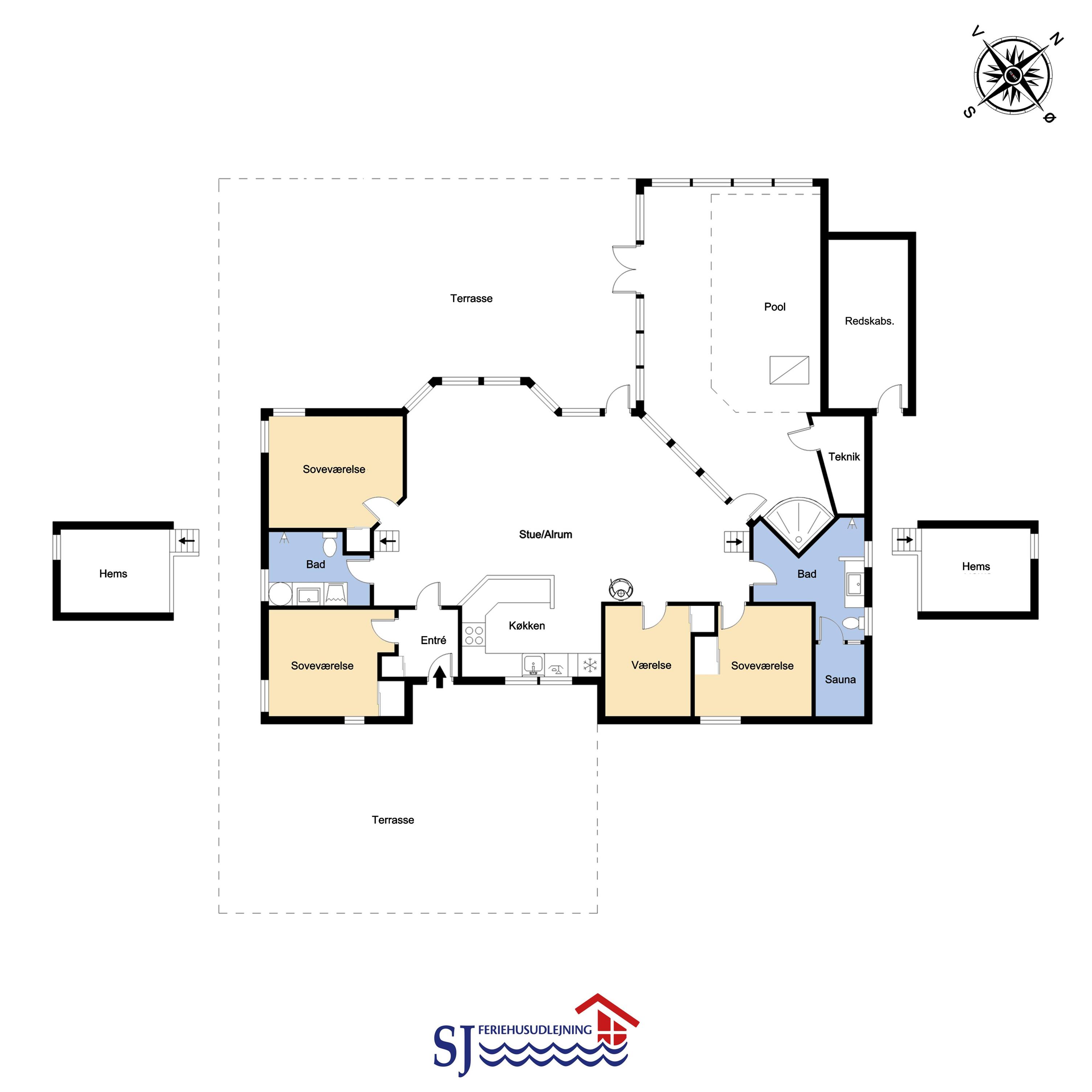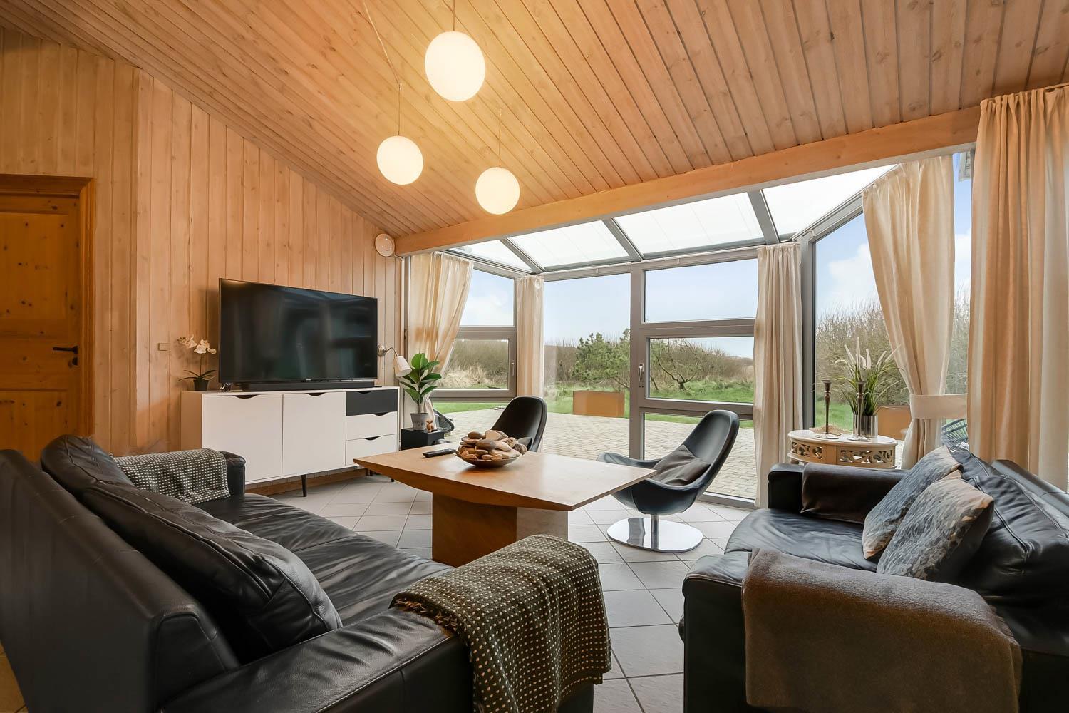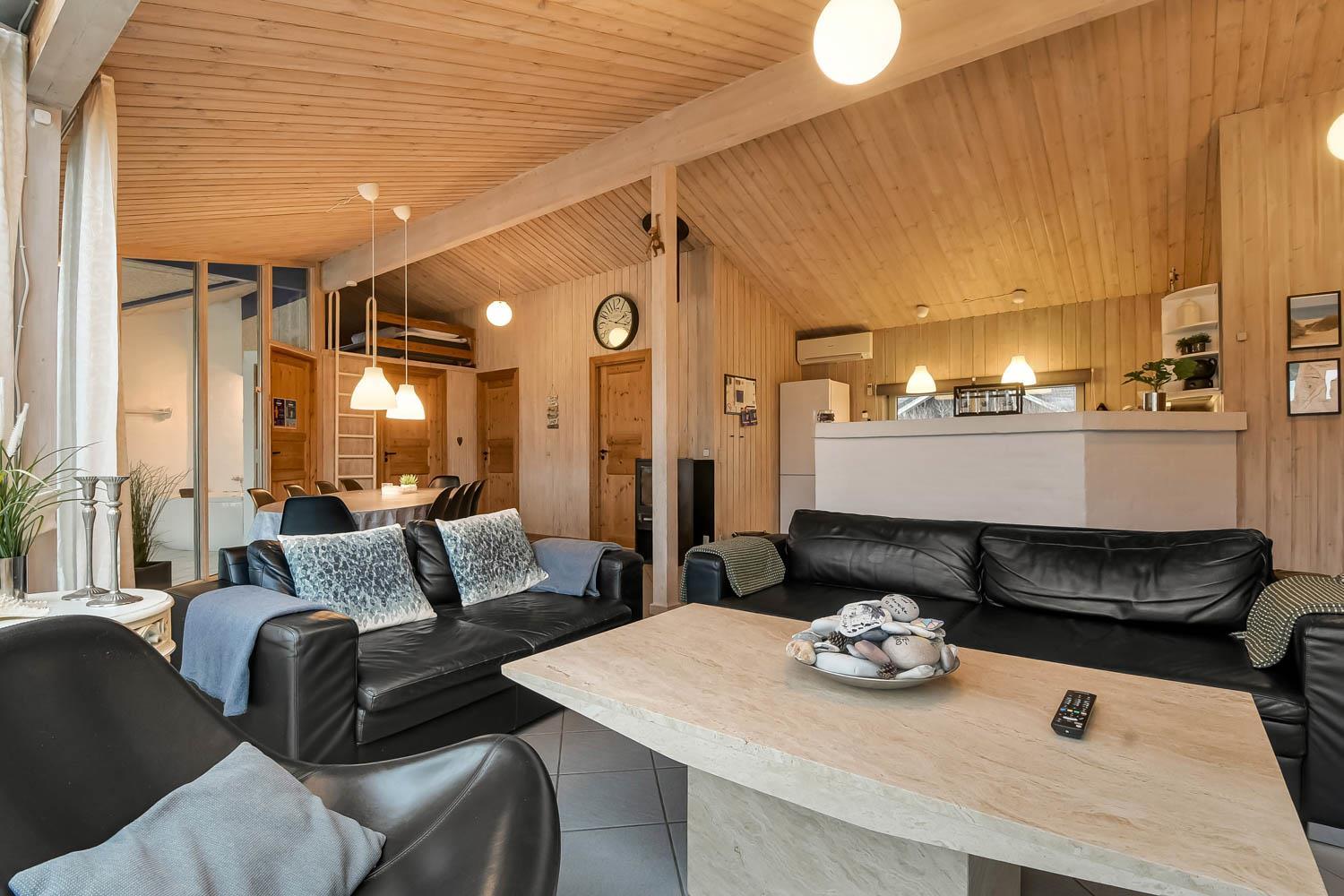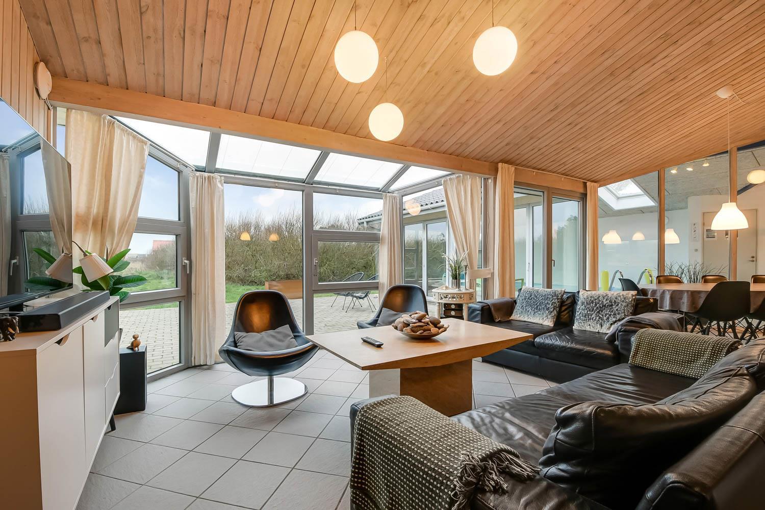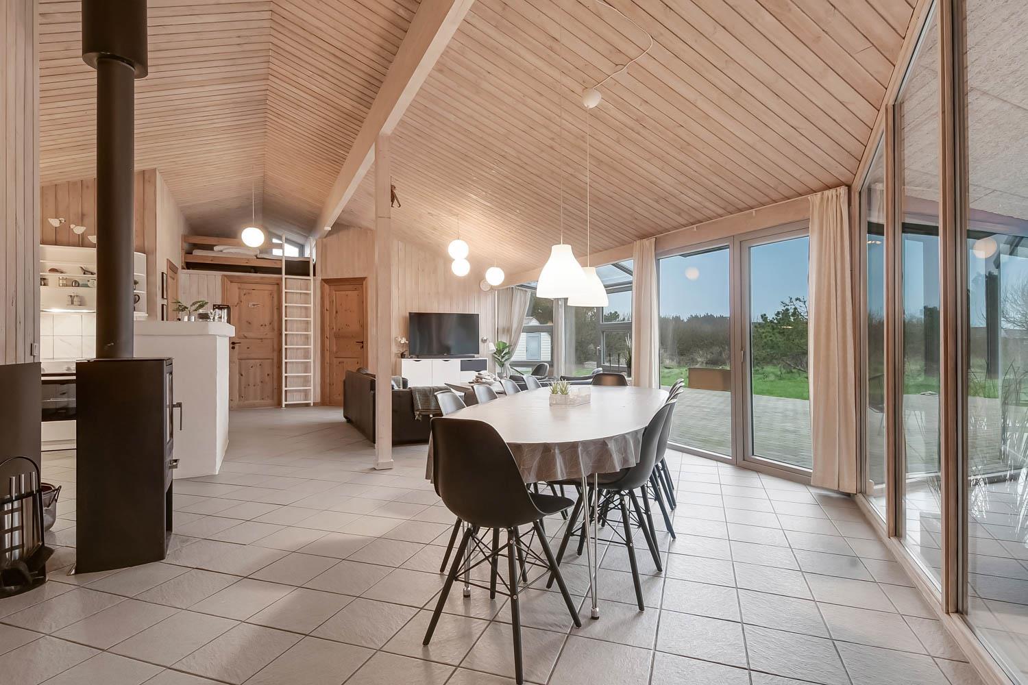 Huset er rigtig godt egnet, også til 2 familier. Et dejligt hus som kan byde på mange gode oplevelser både ude og inde. Gratis fiber internetadgang (høj hastighed). Husets indretning: Husets køkken, som er kombineret med stuen, er veludstyret bl.a. med opvaskemaskine og mikroovn, der findes selvfølgelig også et køle-fryseskab. Den hyggelige stue er indrettet med komfortable møbler, brændeovn og fladskærms-TV med DR-kanaler, chromecast, parabol til de tyske kanaler og et stereoanlæg. 4 gode soverum som er indrettet med 1DS + 1DS + 2S + 2S samt hems med 2 sovemuligheder. Det er muligt at lave dobbelt- og enkeltsenge på alle værelser. Til de små er der en barneseng og barnestol. Huset har 2 badeværelser, hvor det ene er med toilet, håndvask, bruser og gulvvarme, samt sauna. Det andet er ligeledes med bruser og gulvvarme og der er her bordplads til en puslepude. Det dejlige poolrum har panoramavinduer til 3 sider, som giver et dejligt lysindfald. Udover poolen er der et spabad. Der er installeret luft til vand varmepumpe i huset, og poolen opvarmes via denne. Dette gør huset meget energivenligt. Huset er selvfølgelig også udstyret med vaskemaskine og tørretumbler. Har man el-bil eller en Plug-In hybrid, så er der ved Ladeboks til Type 2 ladestik, der kan lade op til 11 kWh. Depositum vintersæson kr. 4500 og sommersæson kr. 2200.