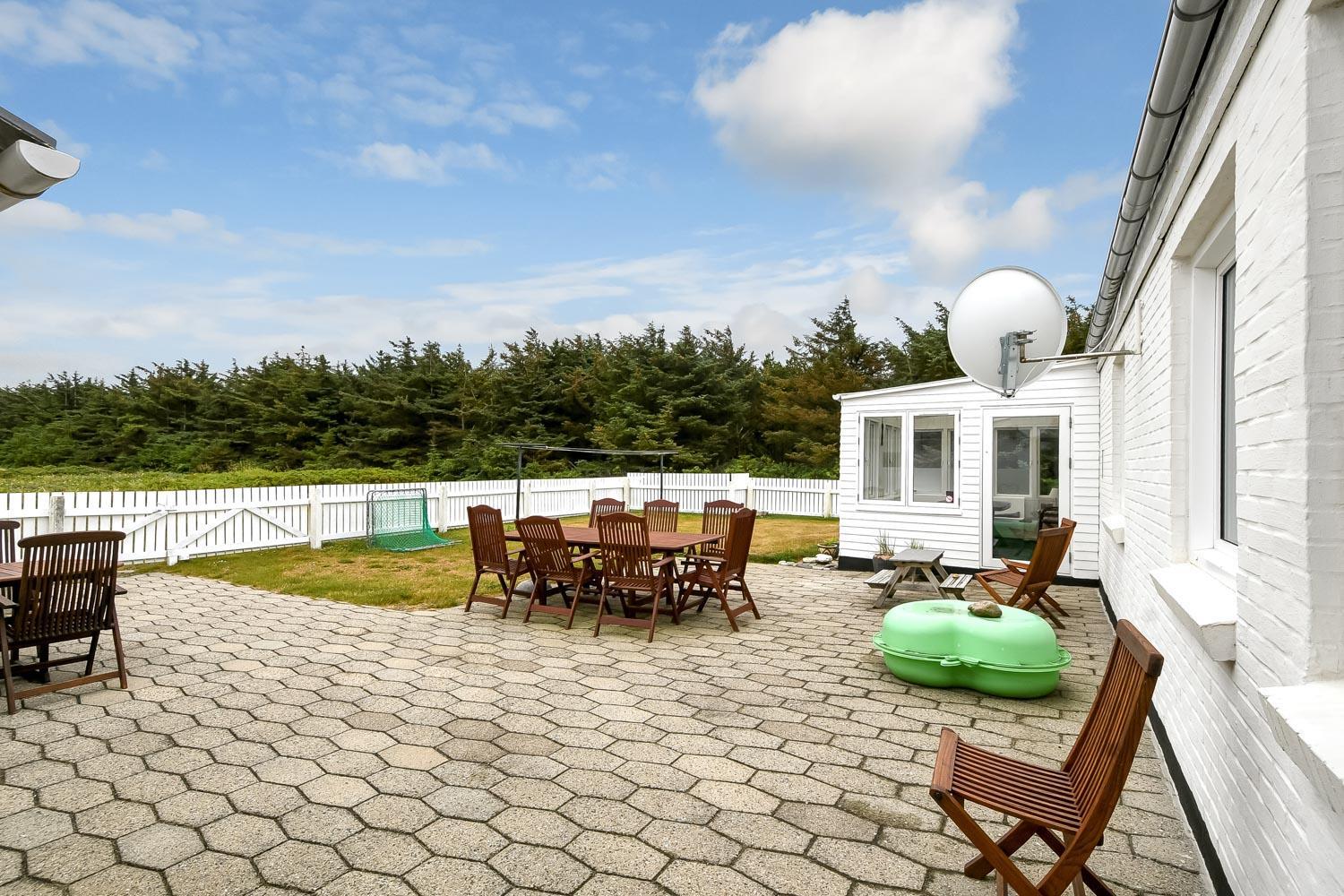 Huset ligger på en cirka 930 m² stor naturgrund. Fra udestuen er der udgang til den dejlige terrasse med havemøbler og hvor udsigten mod Hygum bakker kan nydes. Feriehuset har en meget fin beliggenhed. Der er bare 300 m til det dejlige Vesterhav og den flotte sandstrand. Her kan du nyde lange, maleriske gå- og løbetur eller du kan nyde en dukkert i Vesterhavets bølger. Områdets købmand her sæsonåbent og ligger cirka 800 m fra huset og som i sæsonen byder på frisk morgenbrød. Her kan de daglige indkøb også klares. Også områdets madsted ligger cirka 3000 m fra huset. Indenfor 25 - 30 minutter kan flere aktiviteter og shoppingmuligheder nås. Så hvad enten I er til aktiv ferie eller total afslapning danner dette flotte feriehus en dejlig ramme både hvad angår hus, beliggenhed og omgivelser.