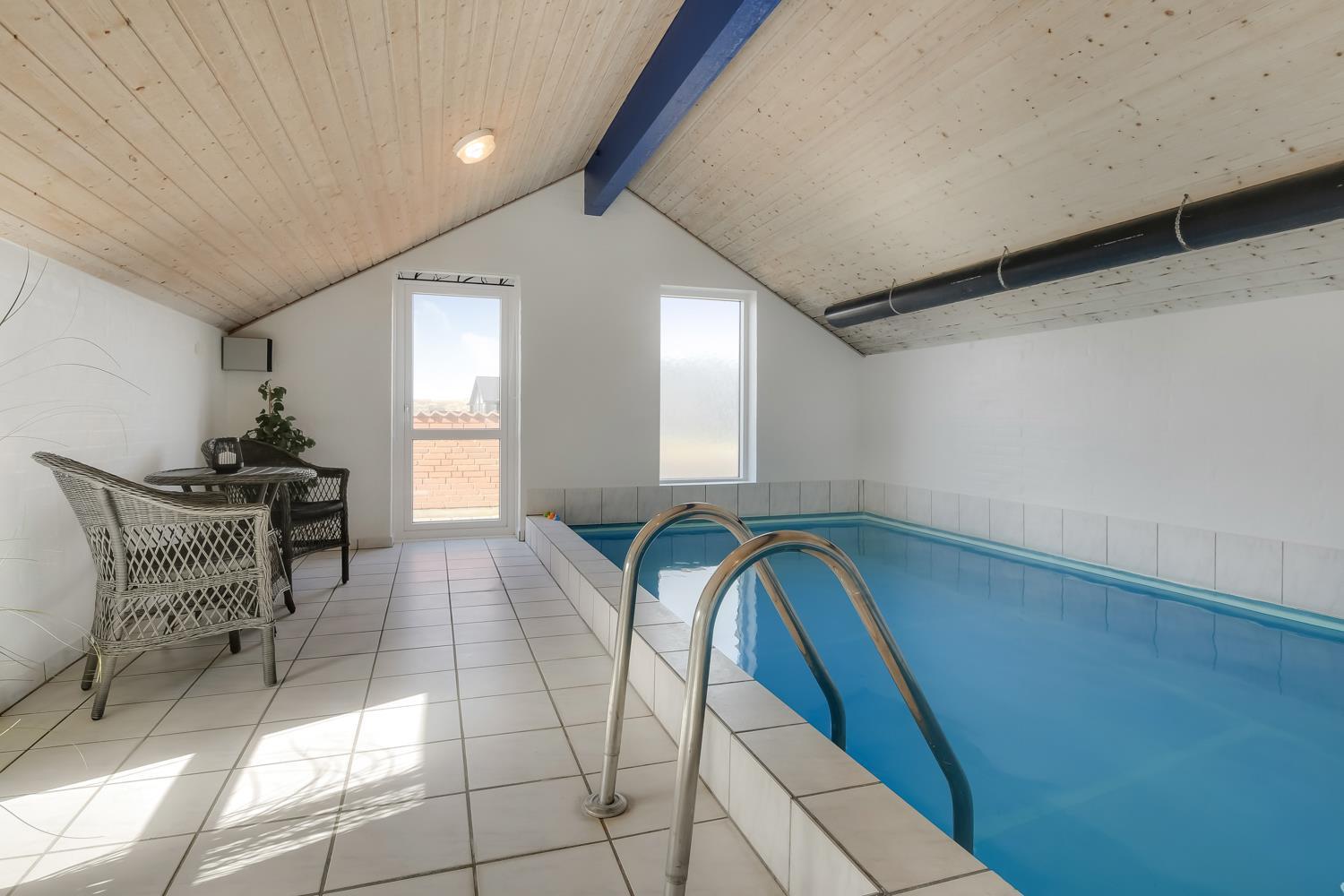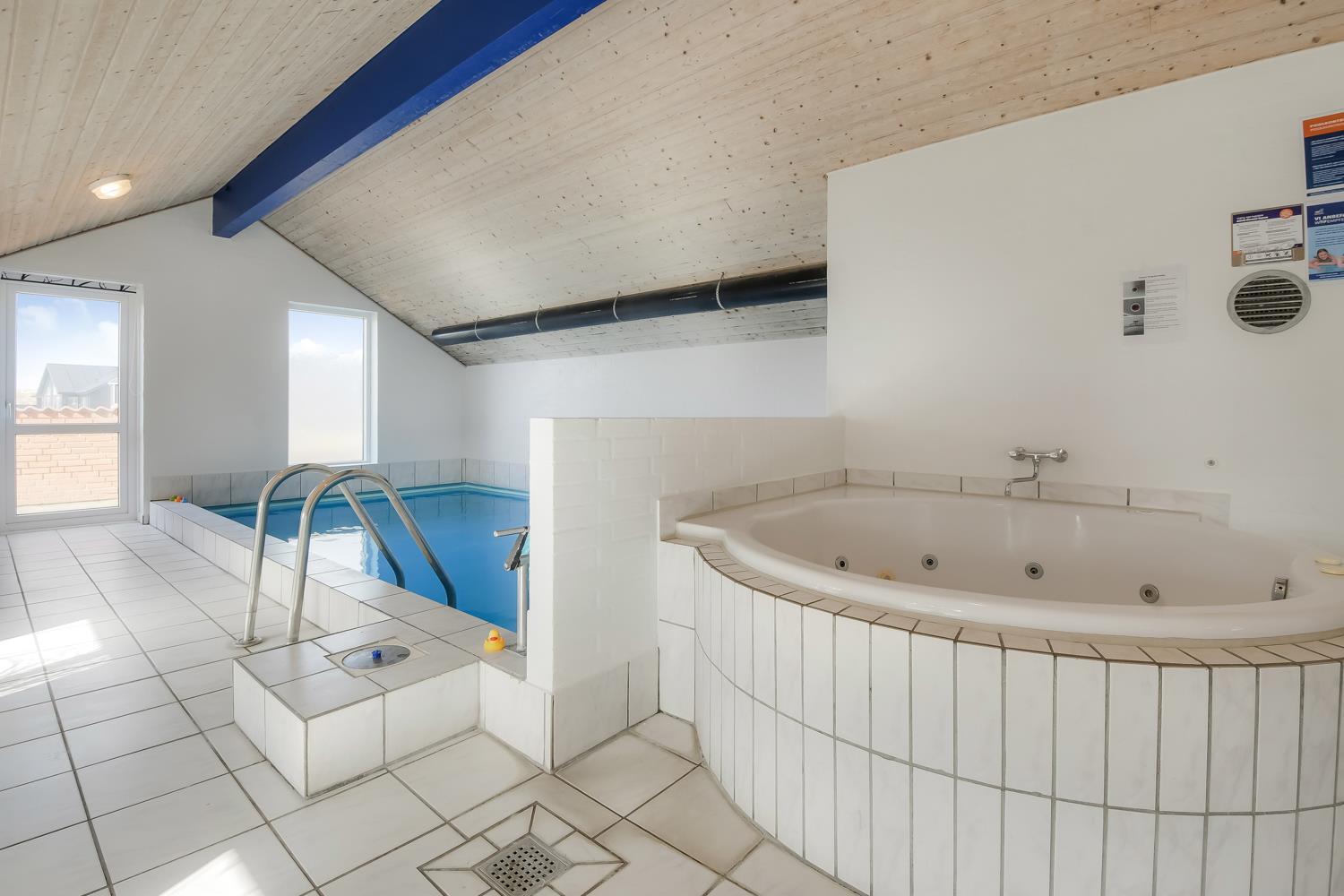 Hyggeligt poolhus på 156m2 med 4 personers spabad, sauna og en skøn sydterrasse. Huset er ideel til 1 eller 2 familier, som gerne vil bo i gåafstand til Vesterhavet. Gratis internetadgang.