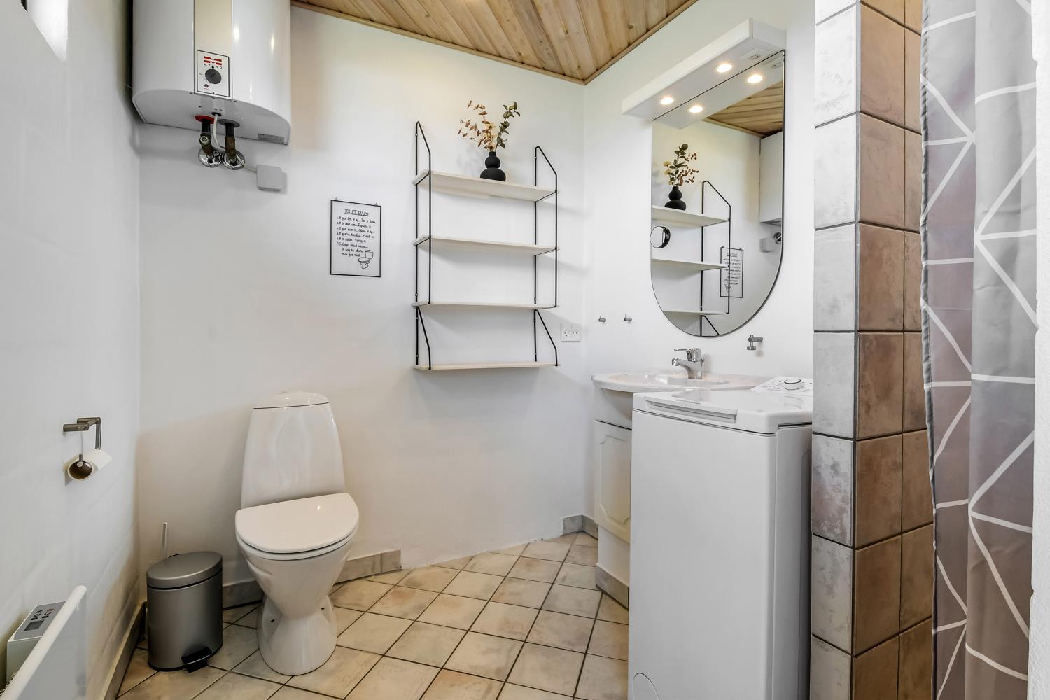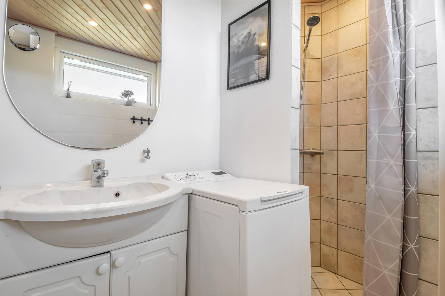 Badeværelse med toilet, håndvask og bruser. Lille top-vaskemaskine. Klinkegulv med gulvvarme.