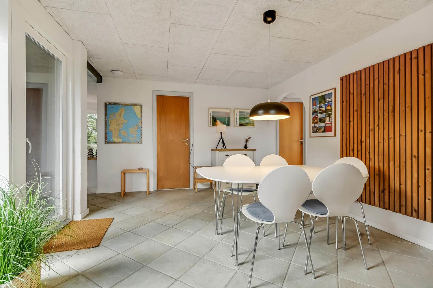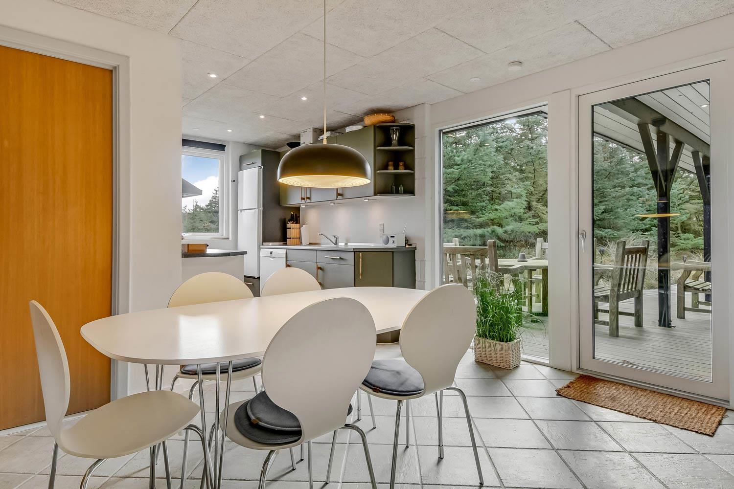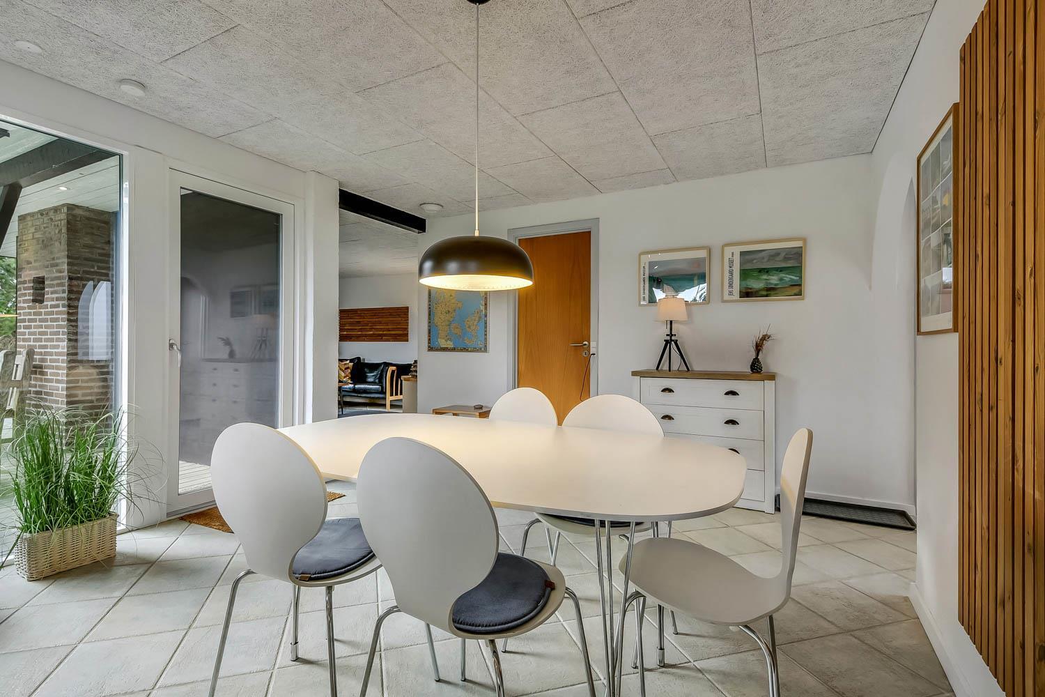 Tæt på køkkenet er en spiseafdeling med spisebord og spisebordsstole ligeledes med stort gulv-til-loft-vinduesparti, hvorfra der også er adgang ud til den dejlige store terrasse.